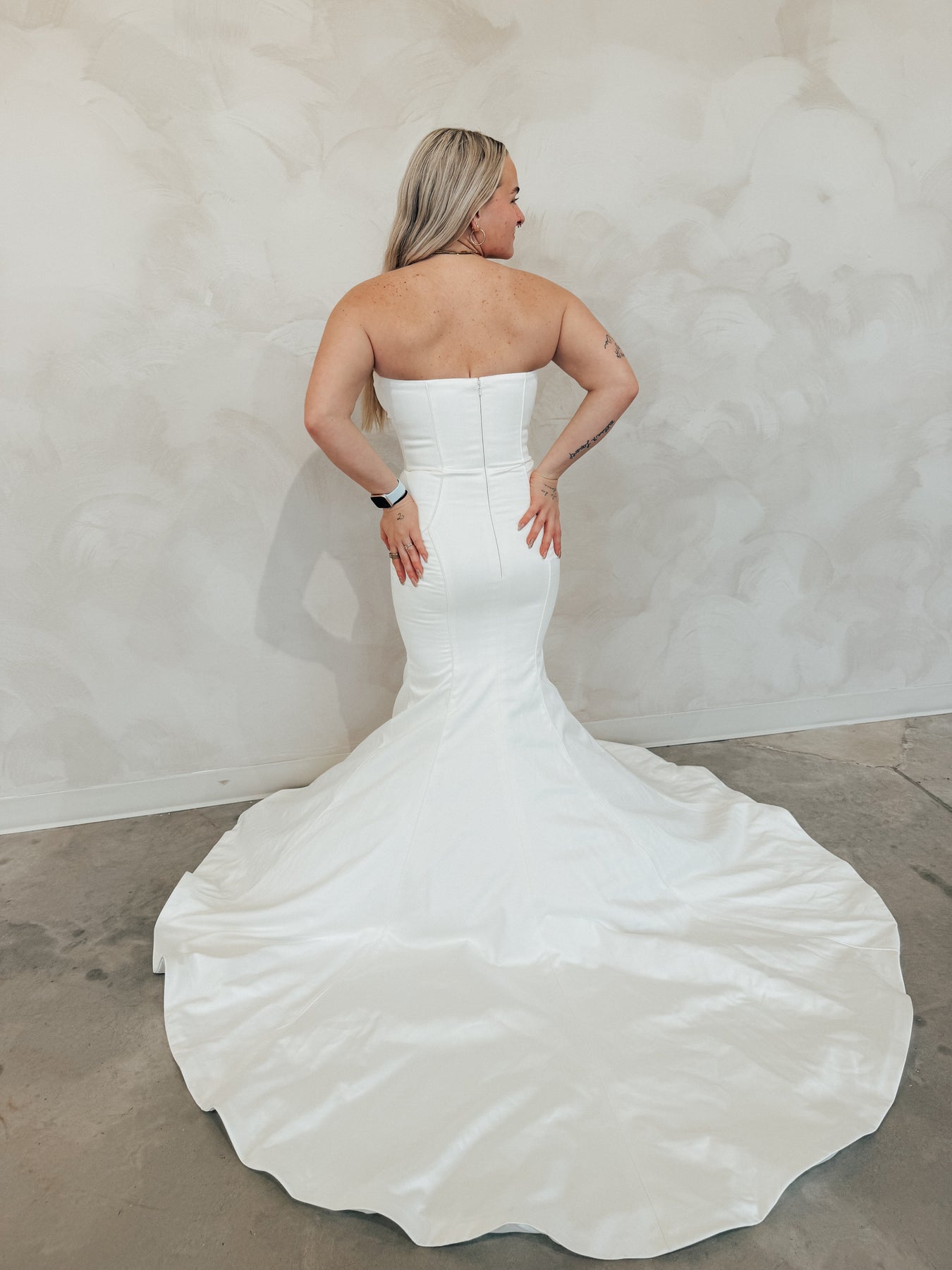 Step into this fitted satin slip style dress. The silhouette is not the only breathtaking aspect of this ivory wedding dress. The intricate seam lines within the bust and bodice of this gown make for a corset style look. The back is detailed with a sweep train and a zipper finish.