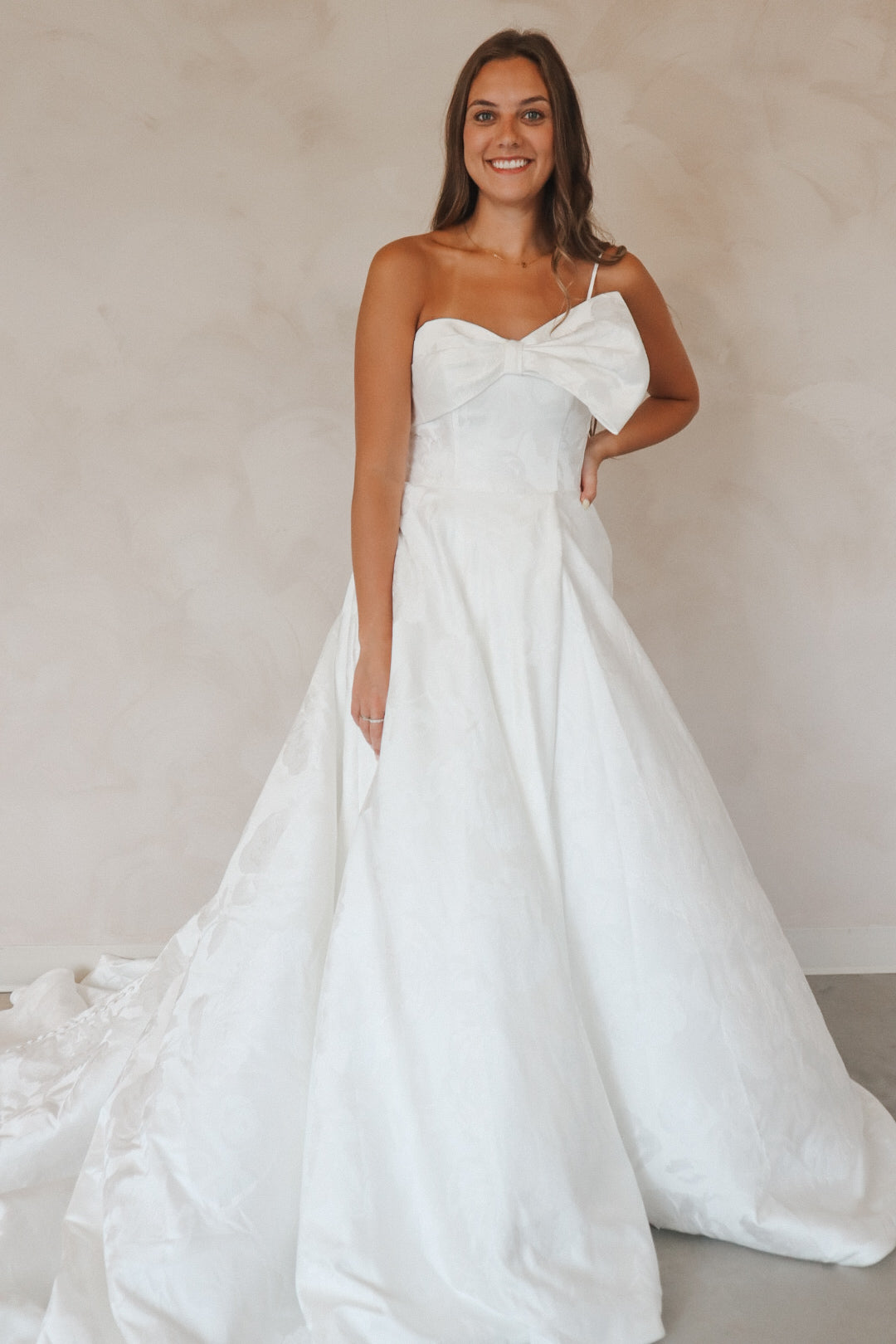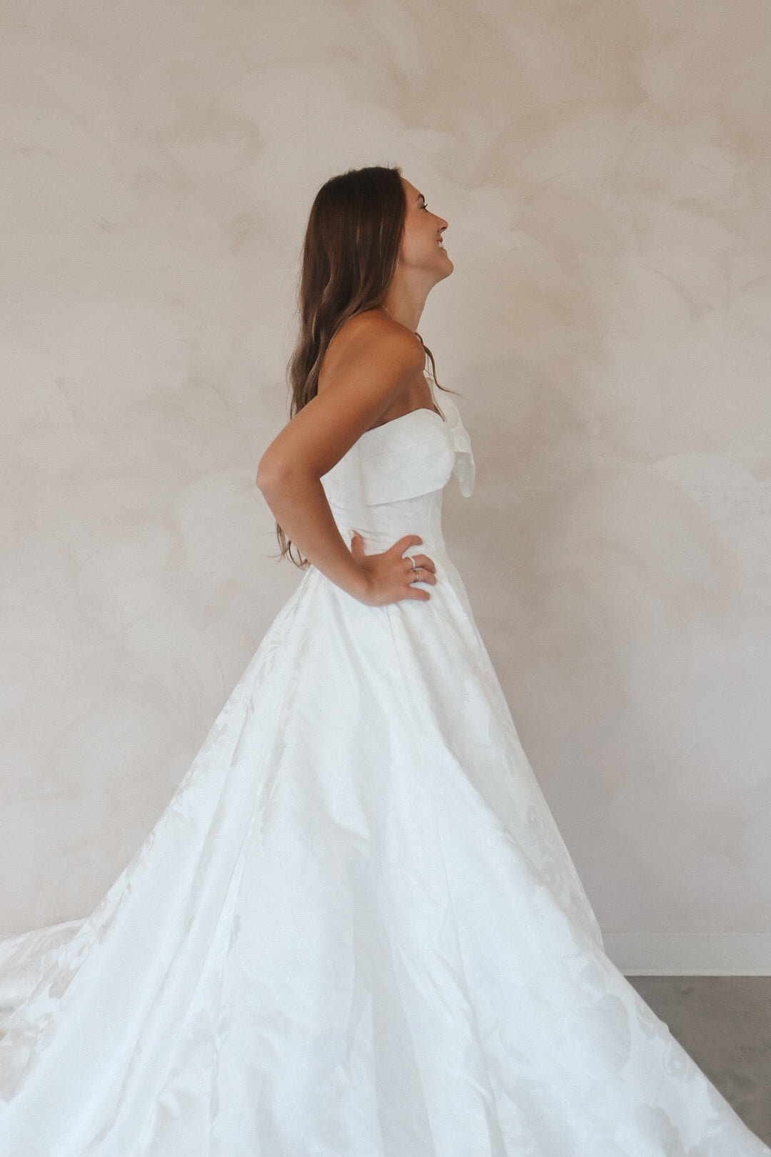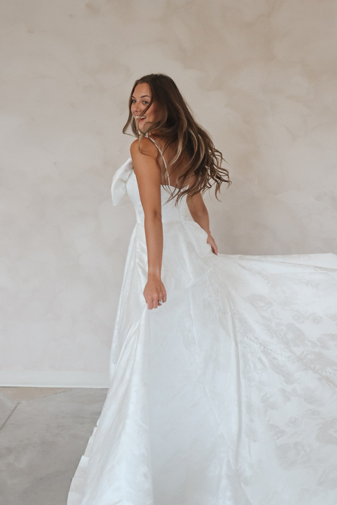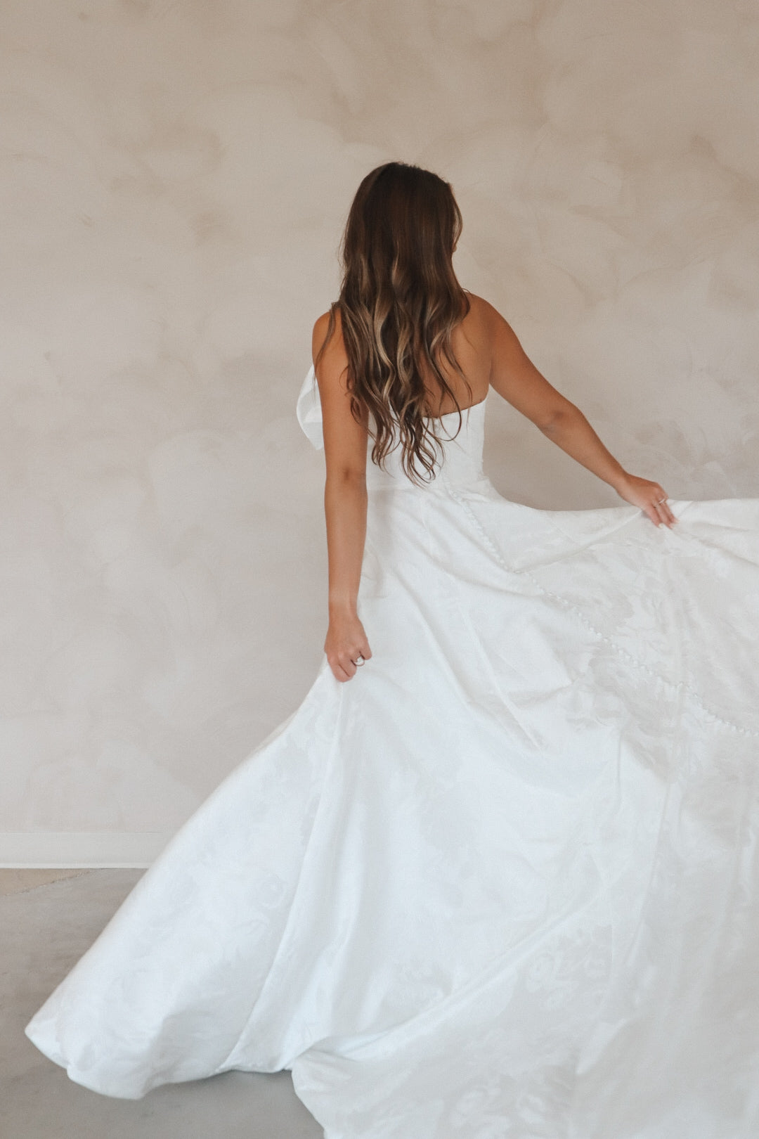 The back features a low scoop and a line of covered buttons that trail down the skirt into a flowing train. Ginger is available in Ivory and Vintage White, perfect for the bride who wants something classic with a twist.