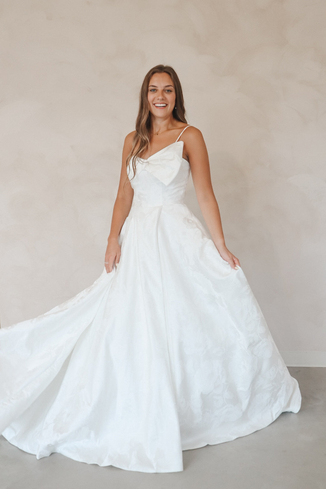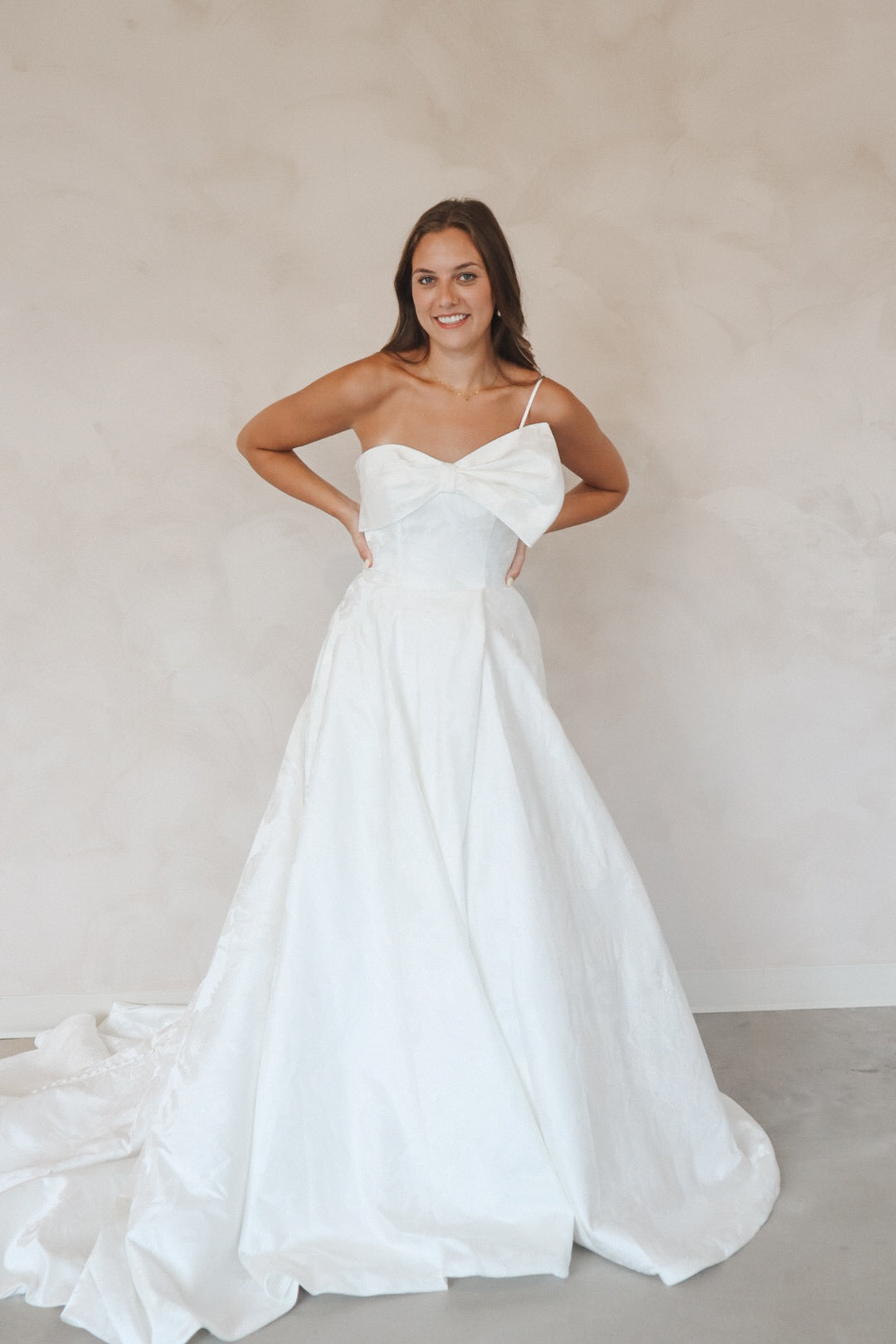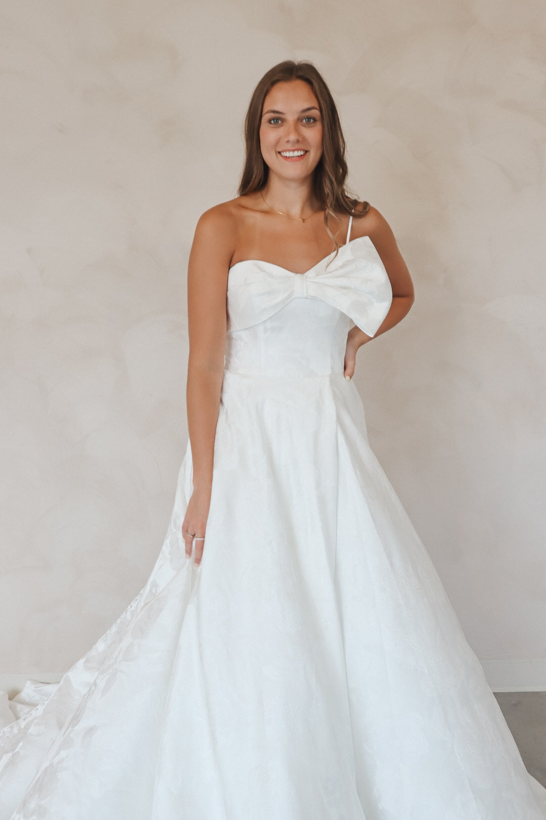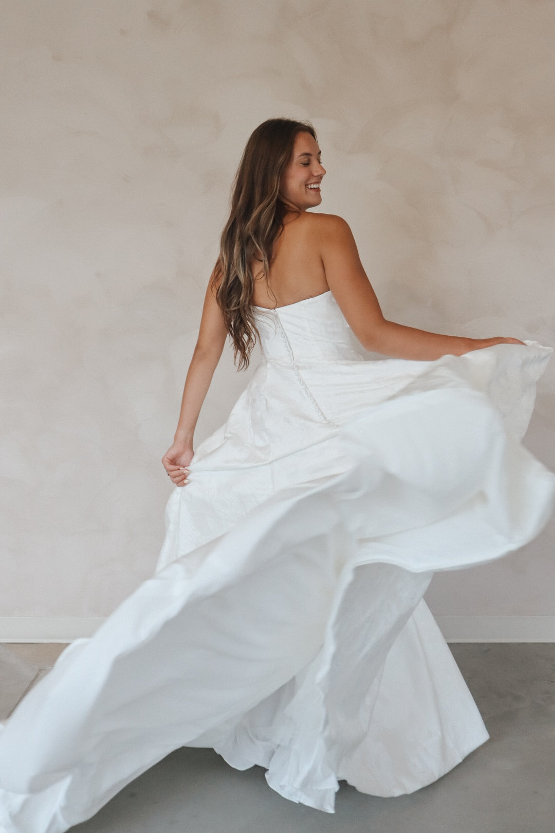 The back features a low scoop and a line of covered buttons that trail down the skirt into a flowing train. Ginger is available in Ivory and Vintage White, perfect for the bride who wants something classic with a twist.