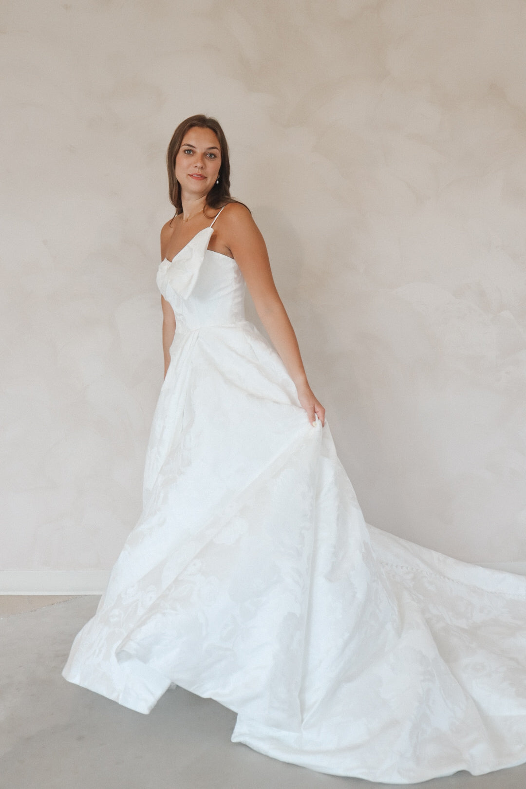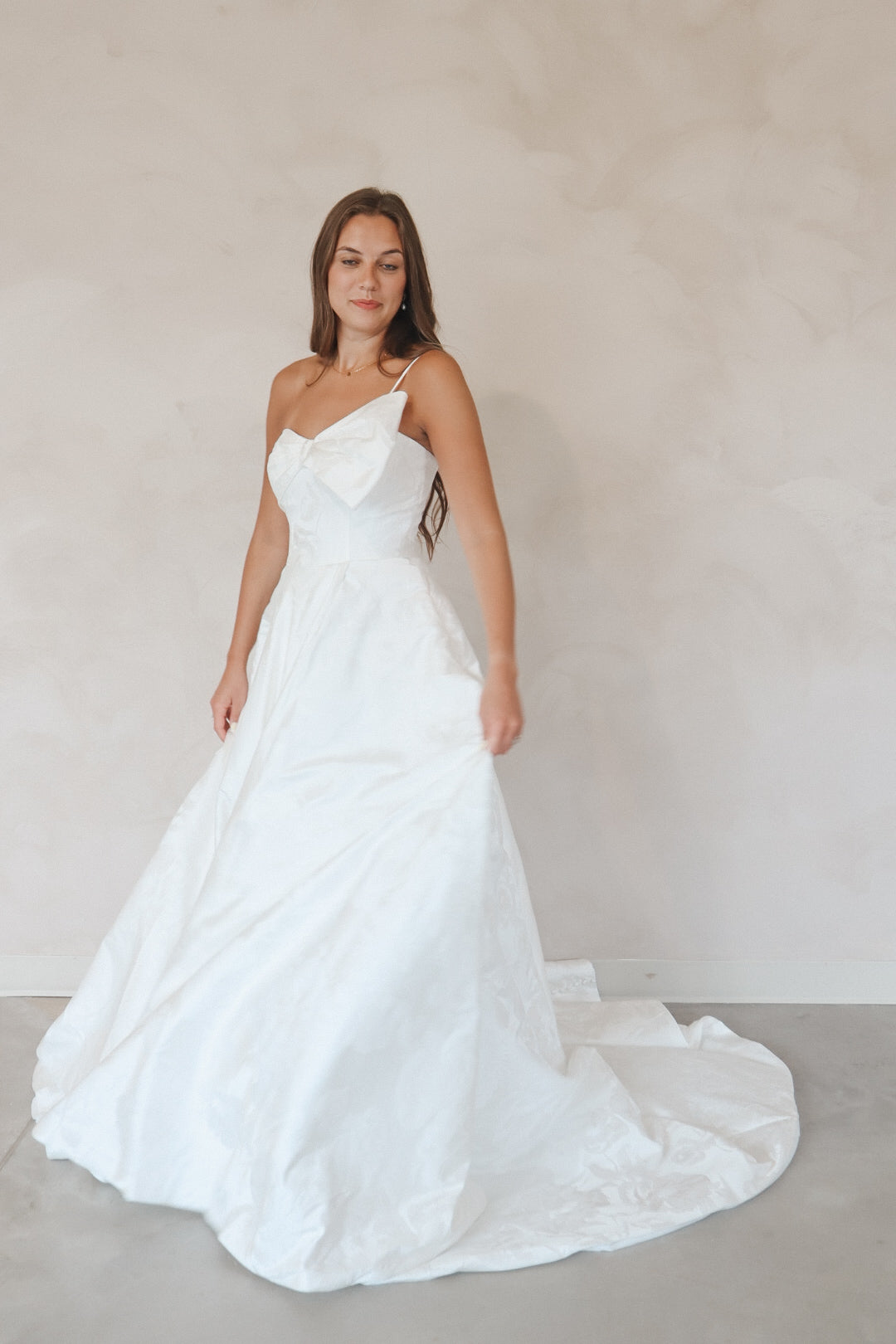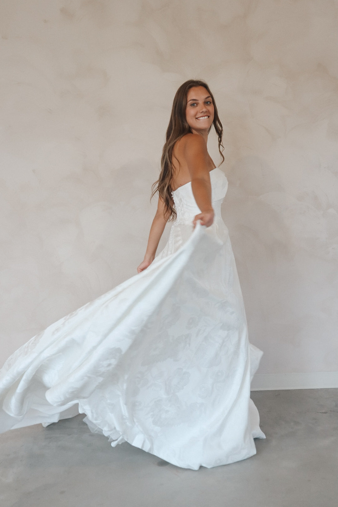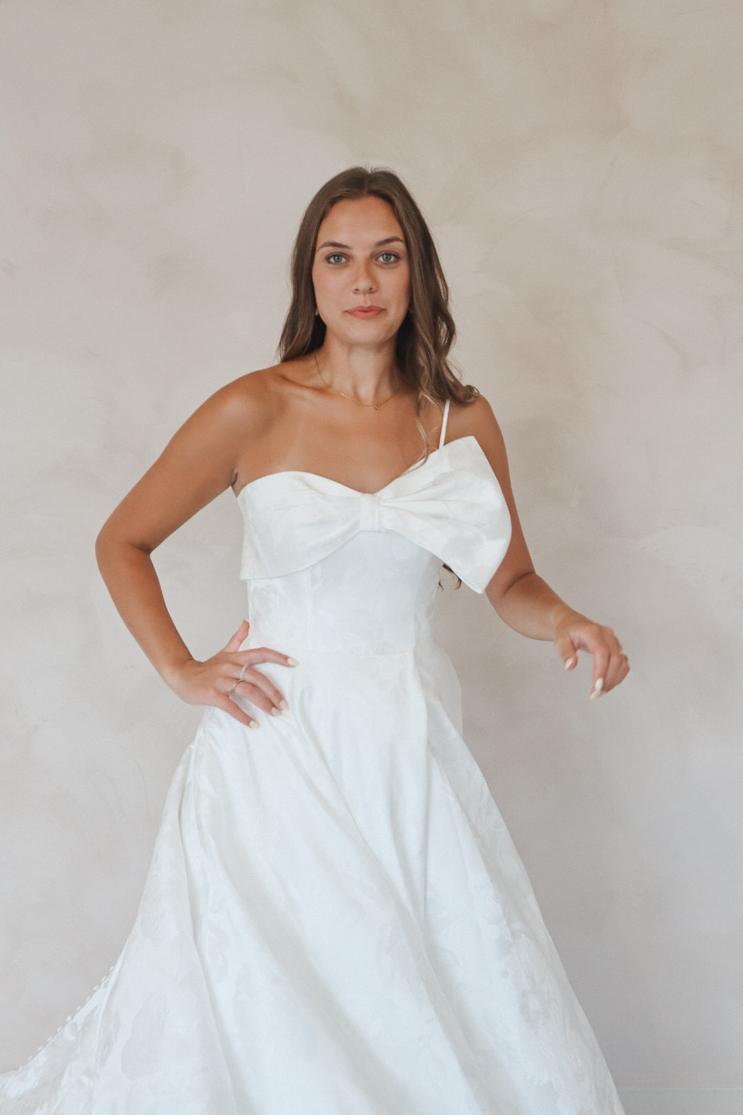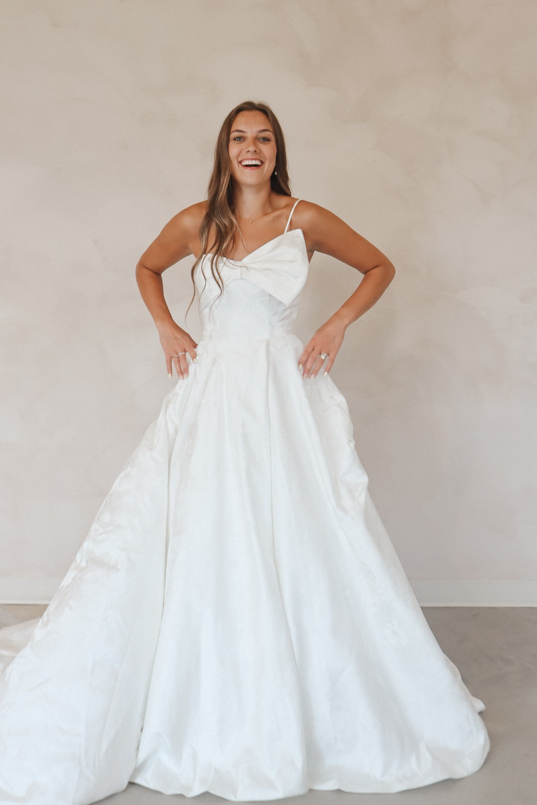 The back features a low scoop and a line of covered buttons that trail down the skirt into a flowing train. Ginger is available in Ivory and Vintage White, perfect for the bride who wants something classic with a twist.