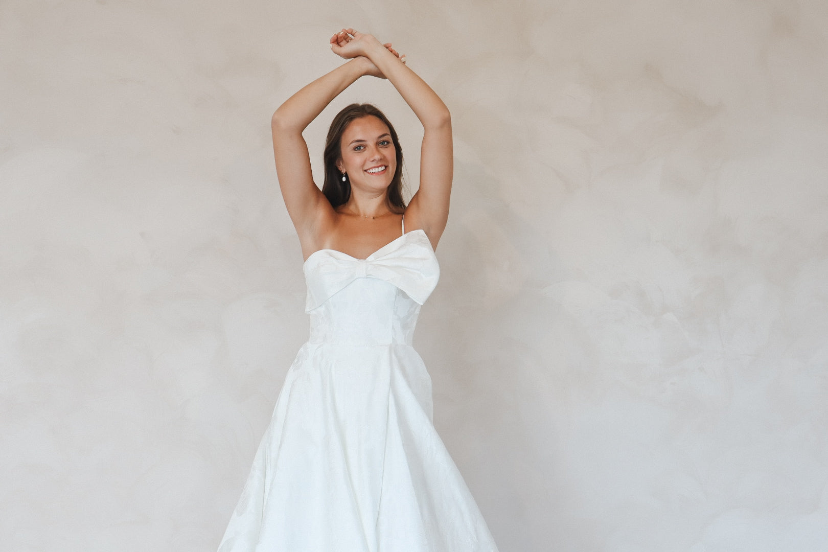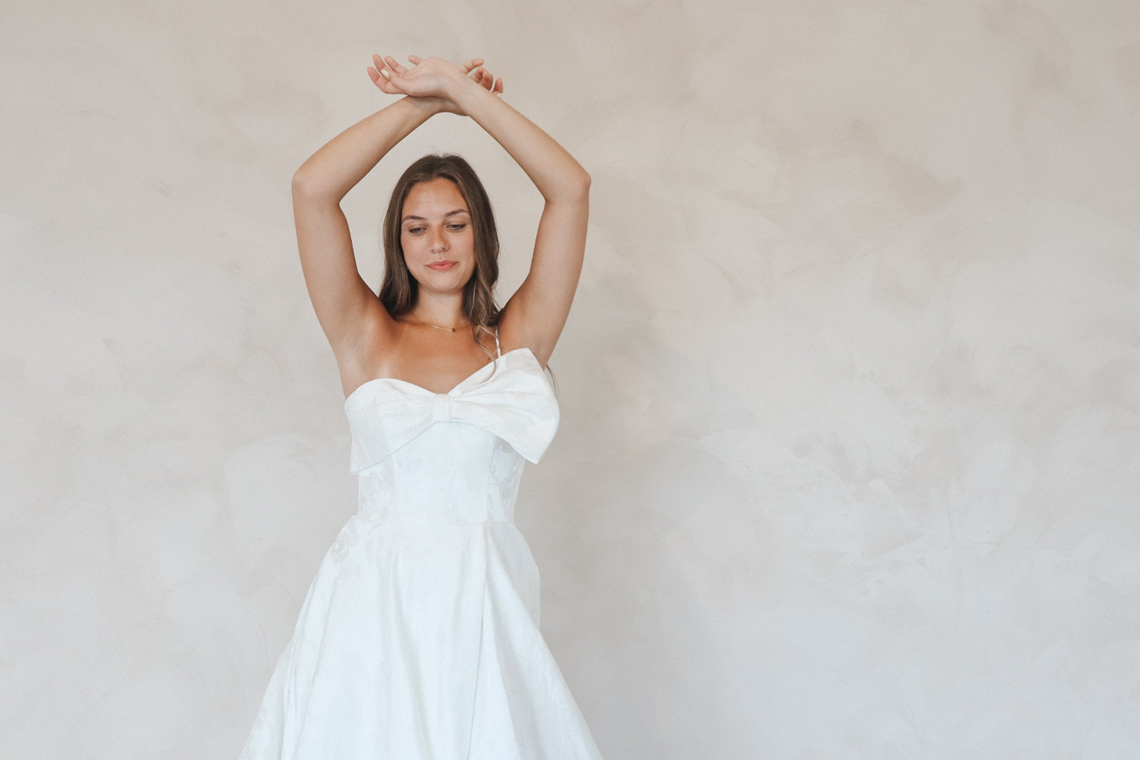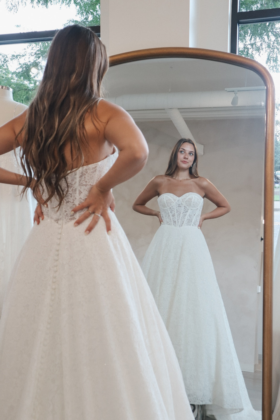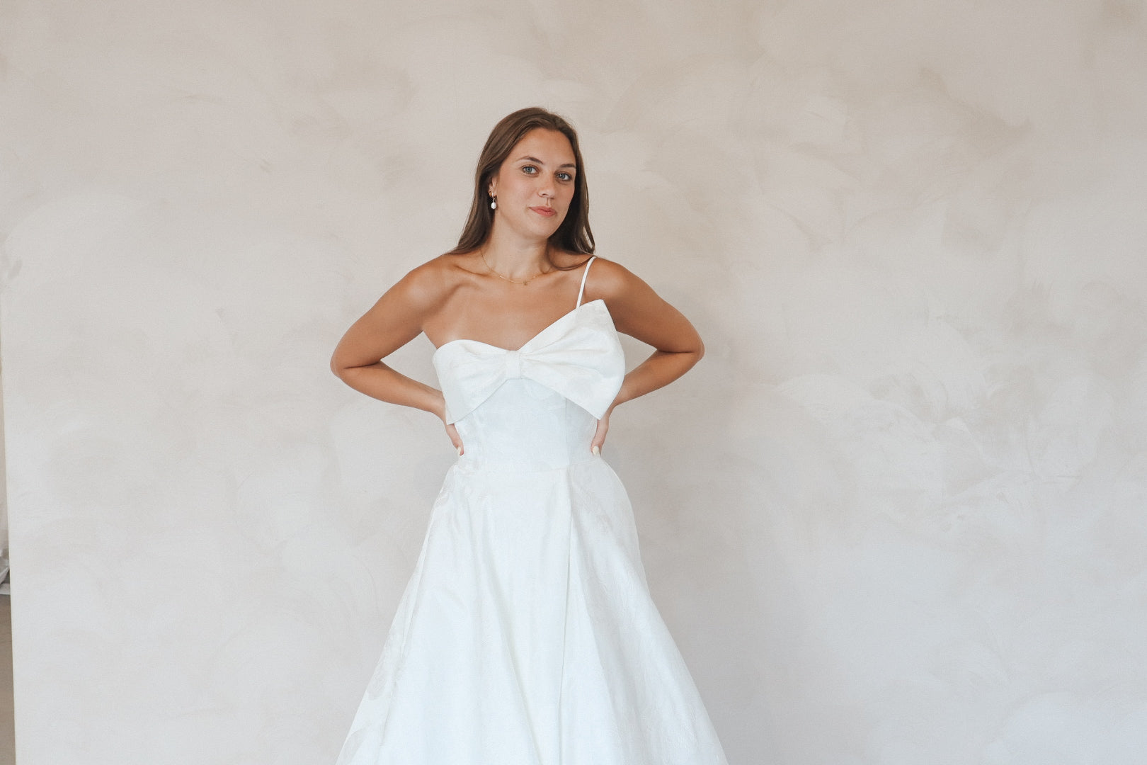 The back features a low scoop and a line of covered buttons that trail down the skirt into a flowing train. Ginger is available in Ivory and Vintage White, perfect for the bride who wants something classic with a twist.