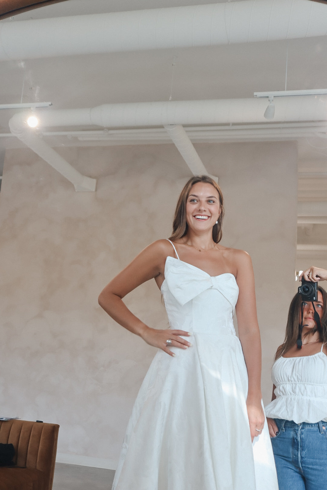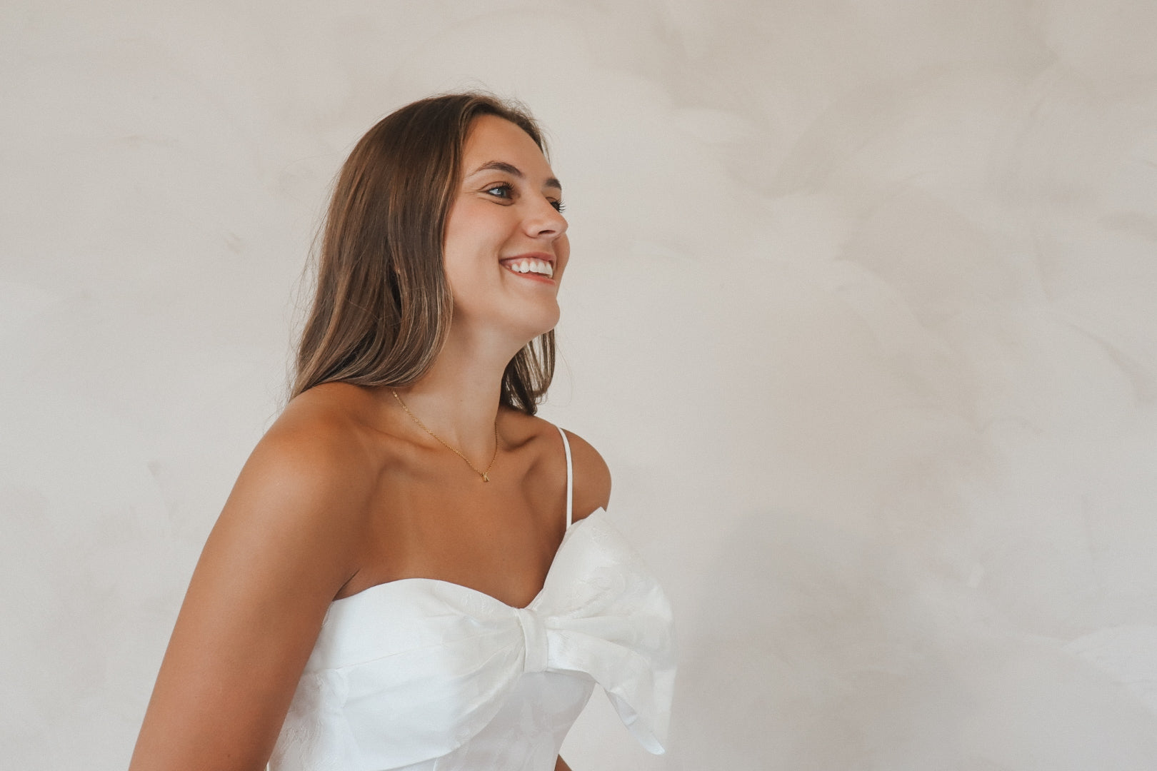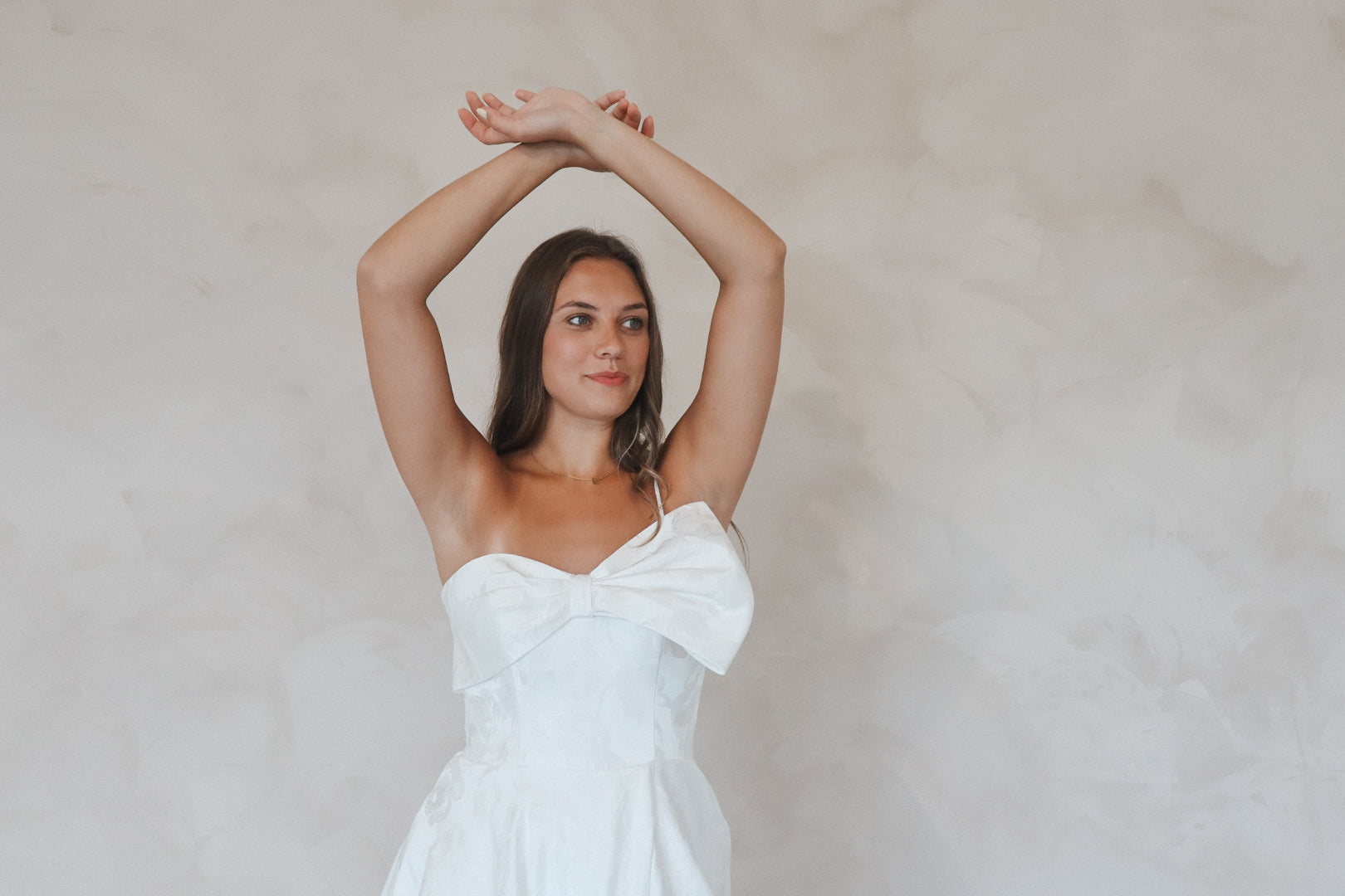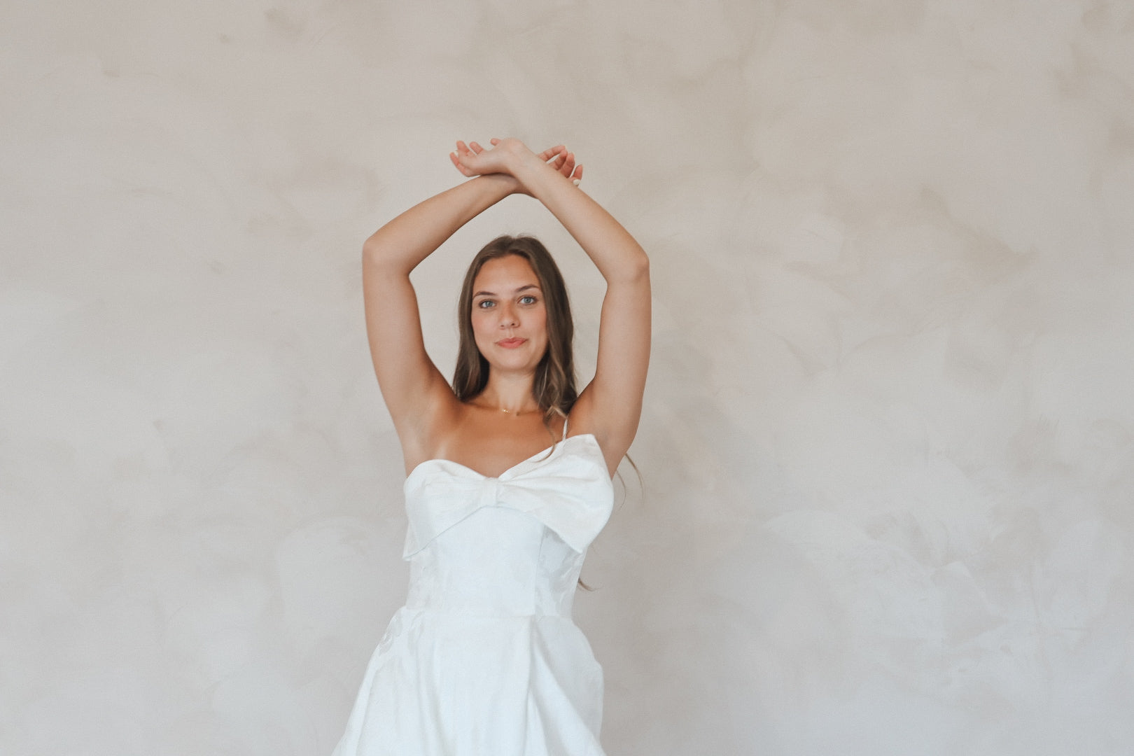 The back features a low scoop and a line of covered buttons that trail down the skirt into a flowing train. Ginger is available in Ivory and Vintage White, perfect for the bride who wants something classic with a twist.