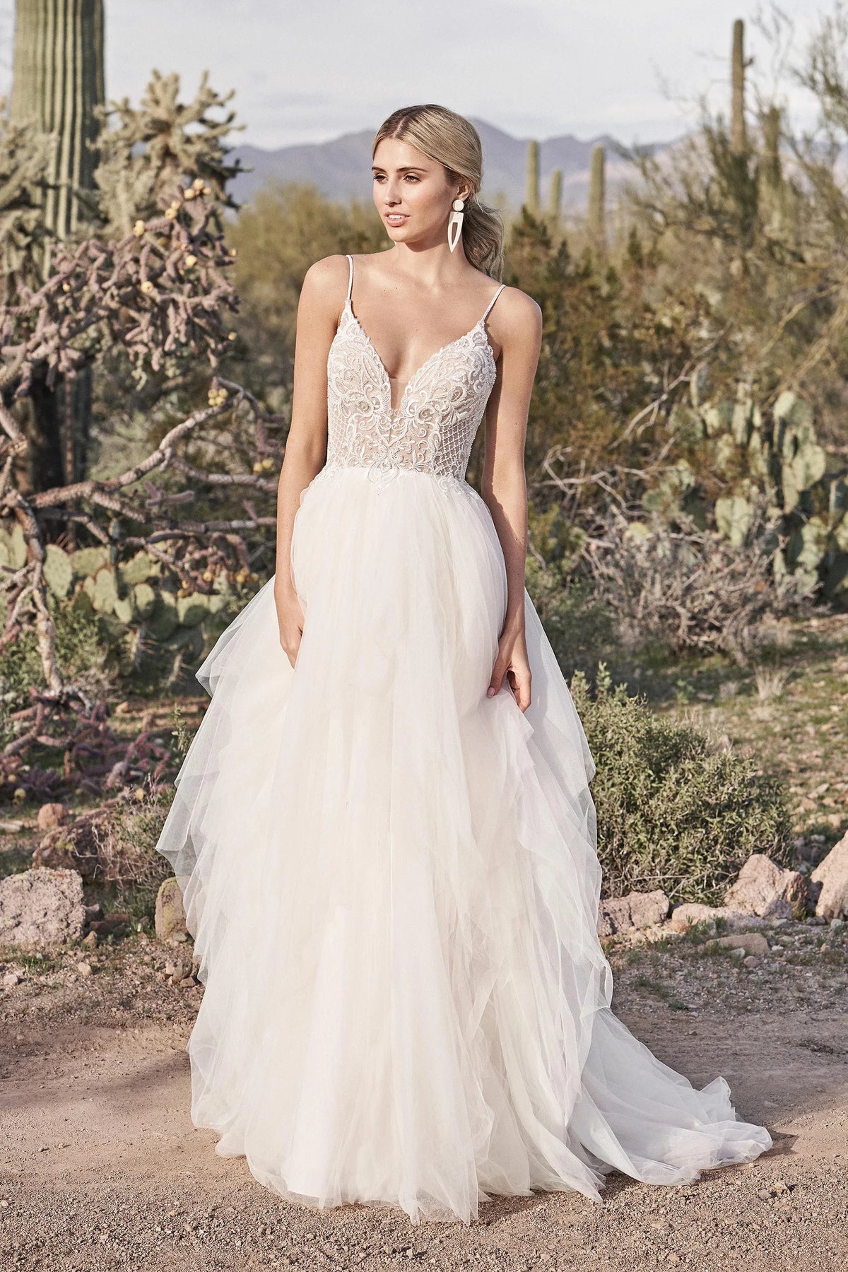 Turn heads wearing this tulle ball gown on your wedding day. The sexy illusion bodice is embellished with beaded embroidery that enhances the plunging bikini neckline. Thinly braided straps lead into the back and create an unexpected detail. Layers of tulle create a gorgeous handkerchief skirt for an unforgettable look. This style is also available with the bodice lined to the back for more coverage and support.