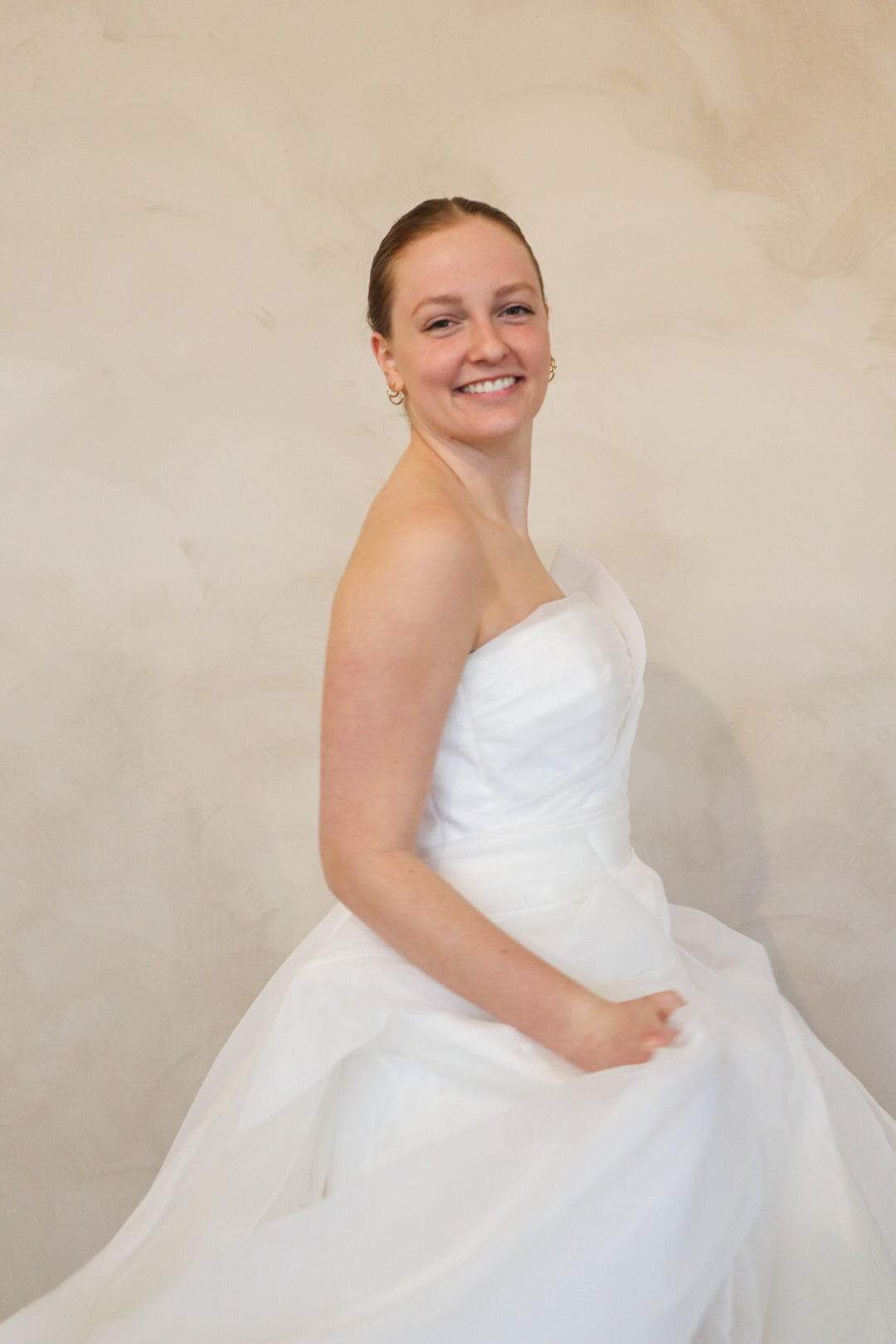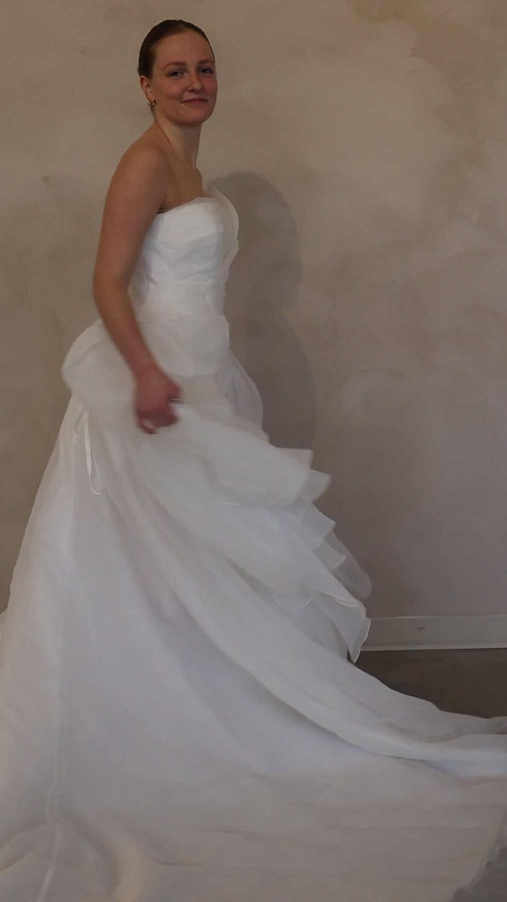 Introducing the stunning Cora dress, blending elegance with modern flair. Crafted from luxurious organza, its unique design features a sweeping structured side detail across the bodice and skirt. The A-line skirt boasts a layered cross-over front split and pleating for movement. With inner bra cups and boning, the construction ensures support for dancing all night. The lace-up back corset and skirt zip closure offer a secure fit, while the fully lined skirt provides comfort. Perfect for the fashion-forward bride, the Cora dress promises to make a statement. Get ready to turn heads!