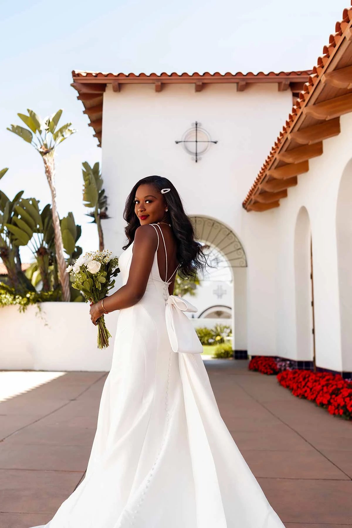 Dramatic elegance comes alive in Style D3404. With head-to-toe matte mikado fabric, this gown uses clean lines and bold accents to deliver a fresh take on a classic silhouette. The scooped neckline is effortlessly stylish and supportive, with boning along the bodice providing sexy structure all day long. The simple double strap adds a delicate touch, meeting at the back of the gown in a delicate V shape. All down the skirt, contour seaming beautifully highlights the body’s natural curves, flaring out below the waist to complete the timeless fit-and-flare silhouette. For a truly show-stopping finish, the detachable bow adds an ultra-modern wow-factor, accentuating the already incredible train and giving the gown a high-fashion flair.