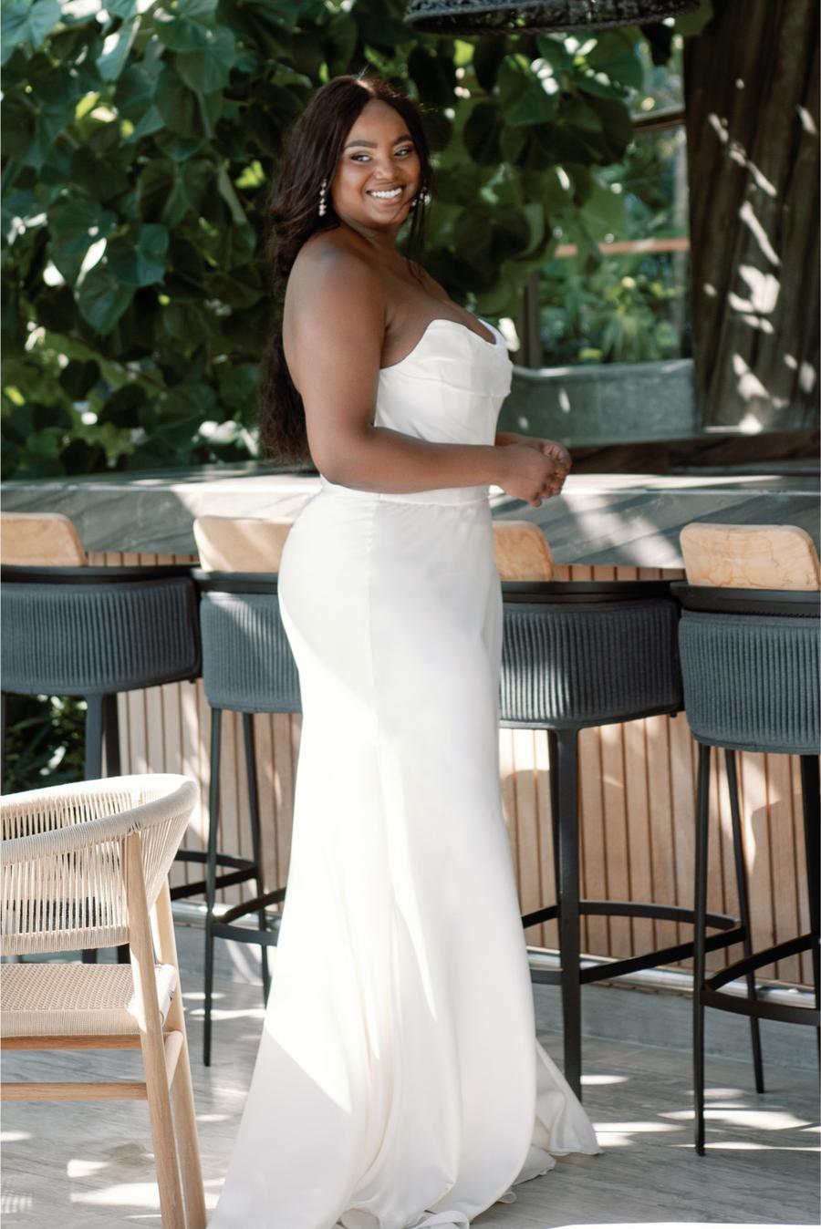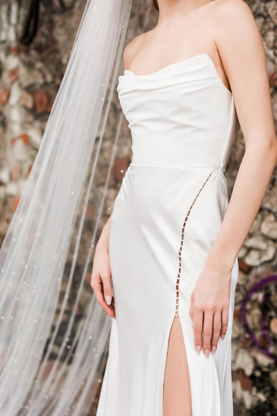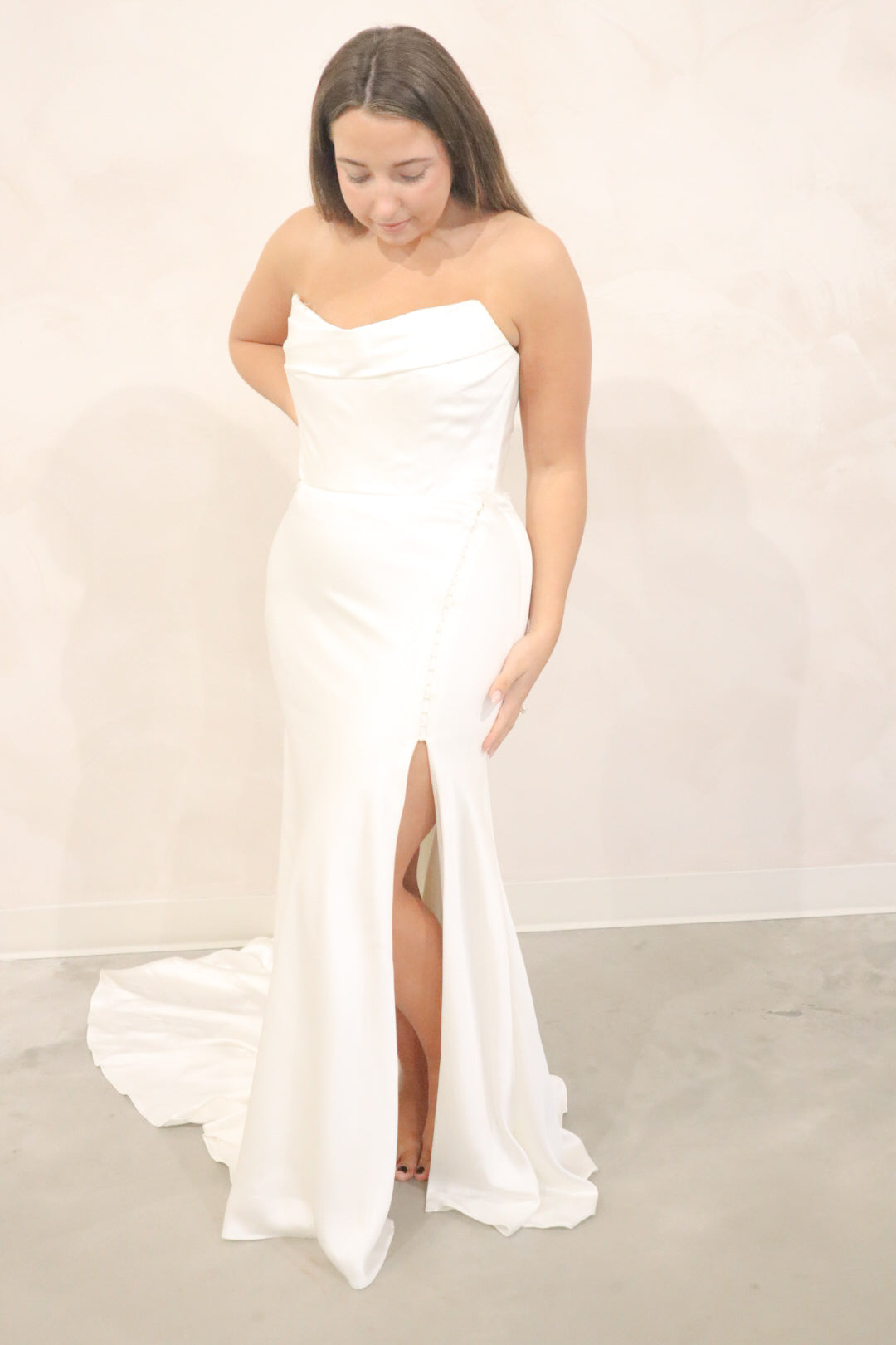 This gown captures the essence of sleek, effortless glamour. Featuring a strapless neckline with a softly draped cowl, it exudes understated romance while maintaining a modern edge. Crafted from luxe satin, the gown’s slim silhouette skims the body before falling into a subtle train, elongating the figure beautifully. A daring thigh-high slit adds movement and allure, while delicate embellishments along the slit line lend just the right amount of sparkle. Perfect for the minimalist bride with a confident, fashion-forward spirit.