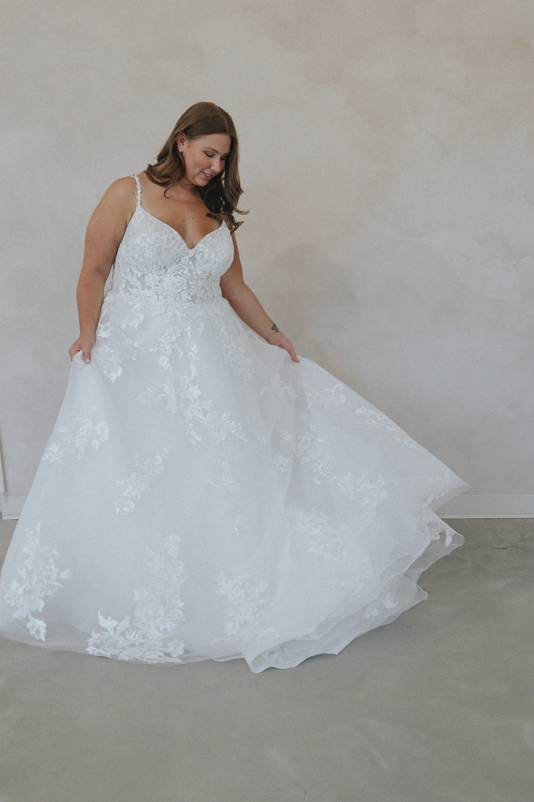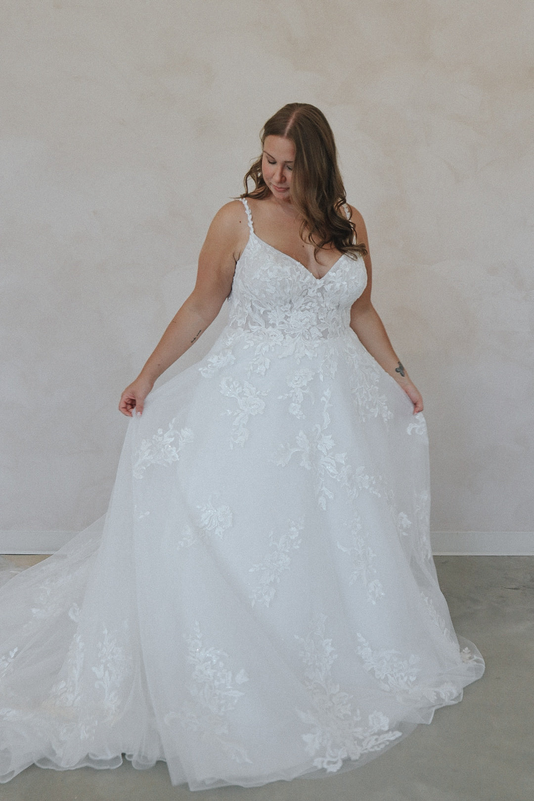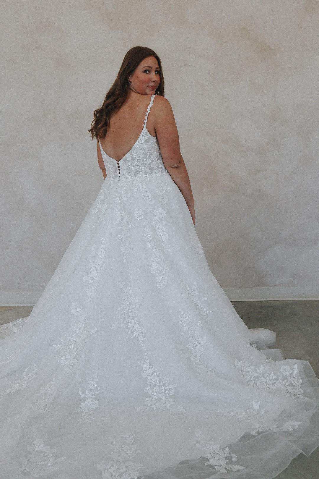Meet "Benny" - This ethereal A-line wedding dress features a generous amount of frosted embroidered flower lace, creating a whimsical and romantic look. The intricate lace detailing adds a subtle touch of brilliance to the bride's overall appearance. The dress also showcases a stunning deep V-back, which effortlessly flows into a chapel length train, adding an elegant touch to the design.