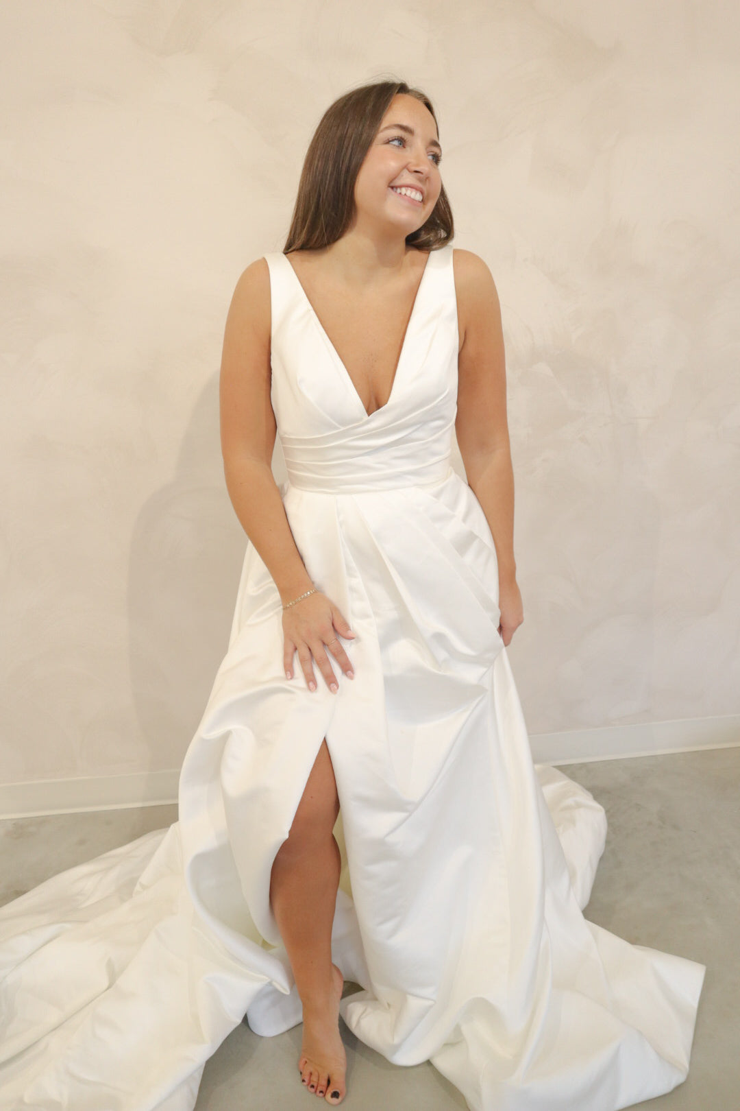 This gown exudes timeless sophistication with a modern twist. The structured bodice features a deep V-neckline with flattering pleated detailing that wraps elegantly across the waist, creating a cinched silhouette. Crafted from luxe satin, the full A-line skirt flows into a dramatic train and showcases a thigh-high slit for a bold, confident touch. The low V-back adds a hint of allure while maintaining classic bridal refinement — perfect for the bride who wants a blend of modern minimalism and enduring elegance.