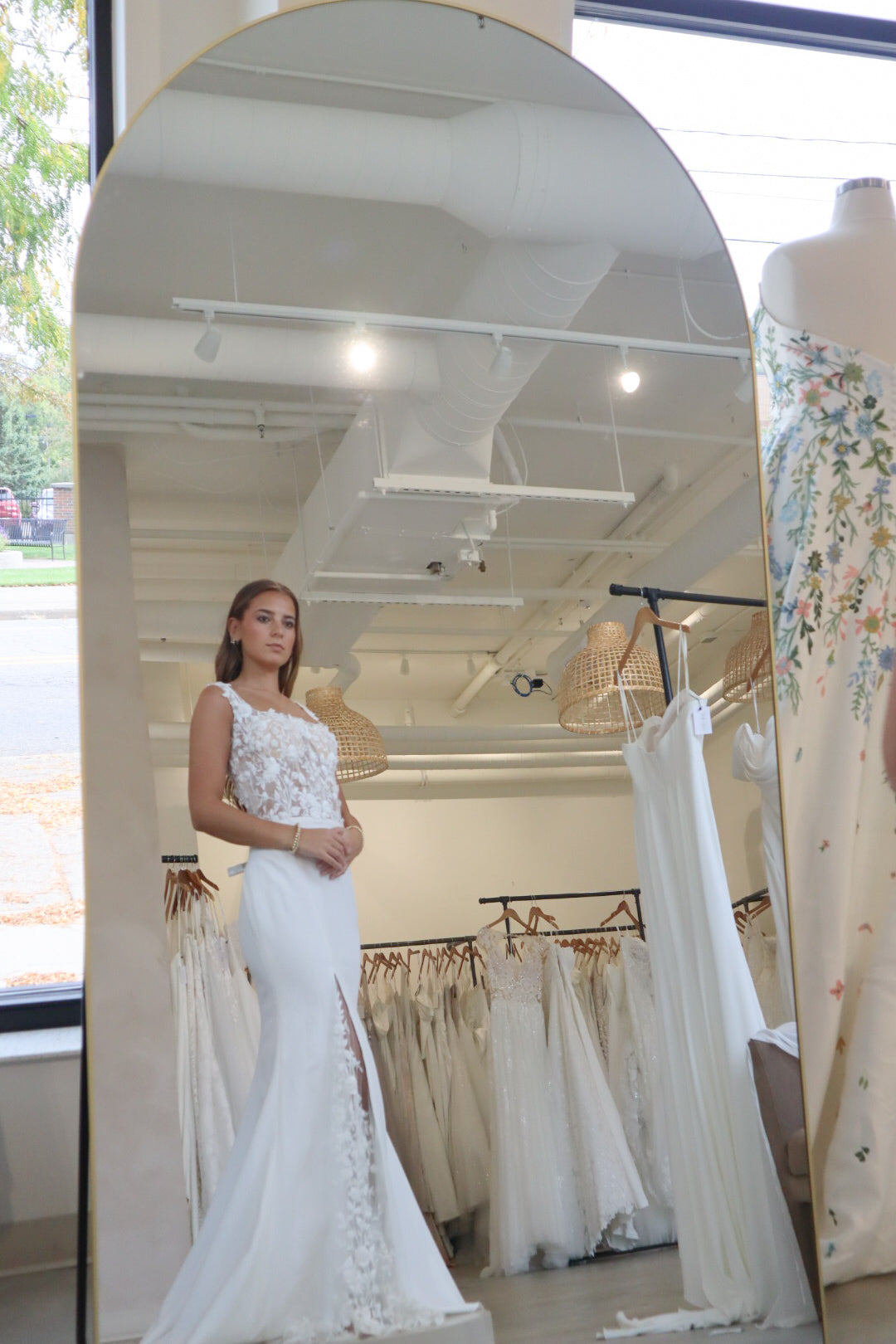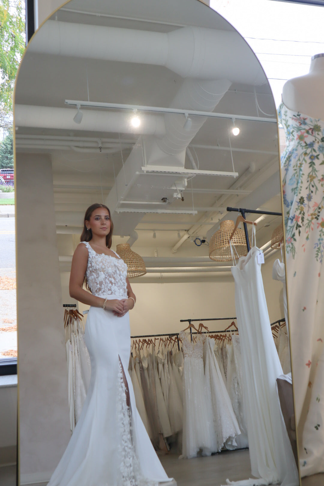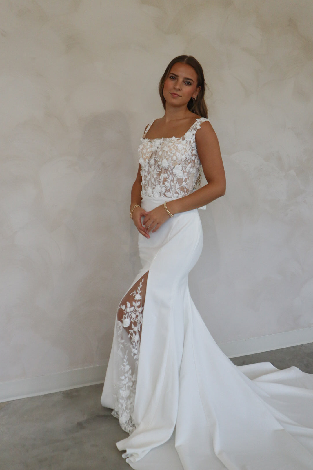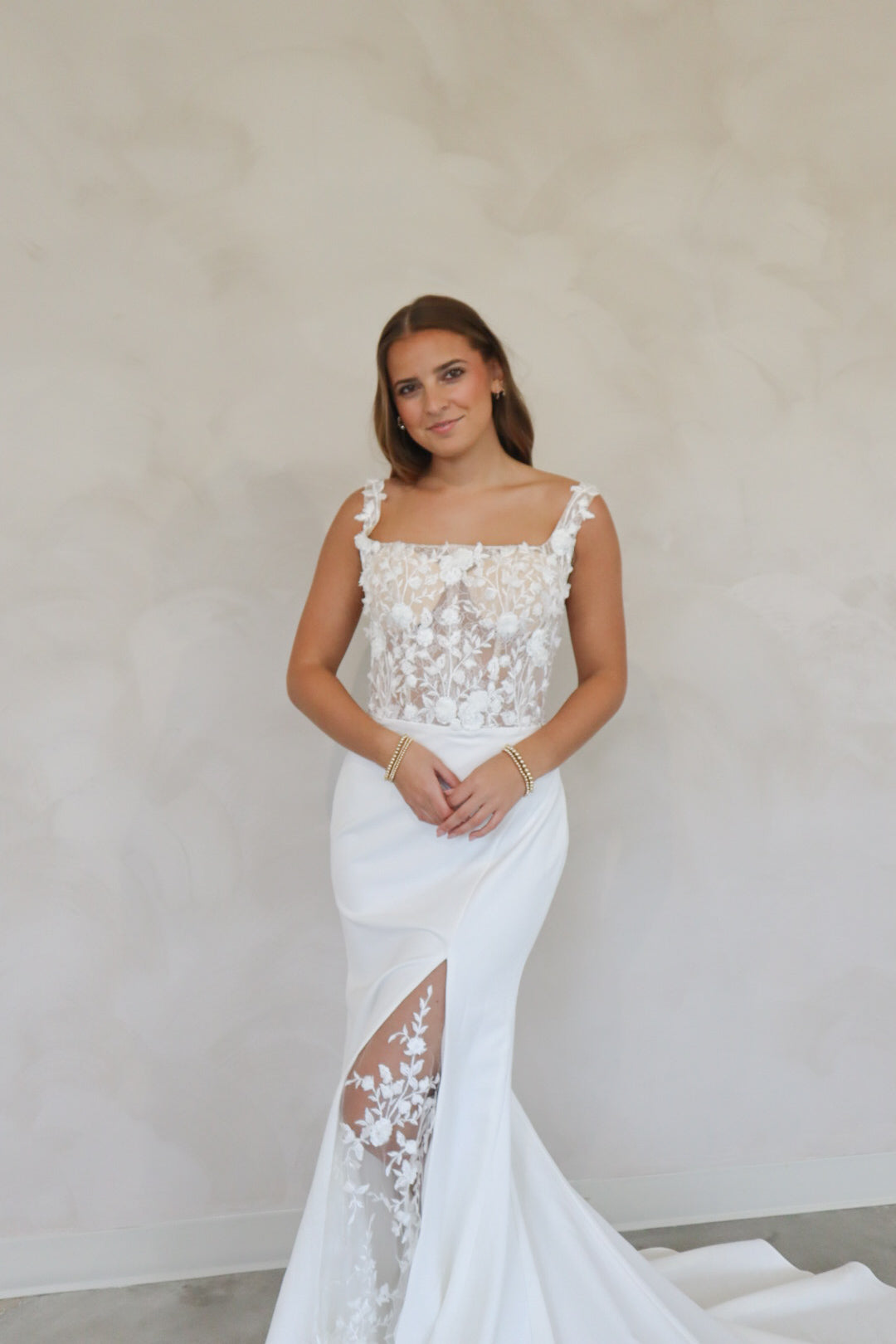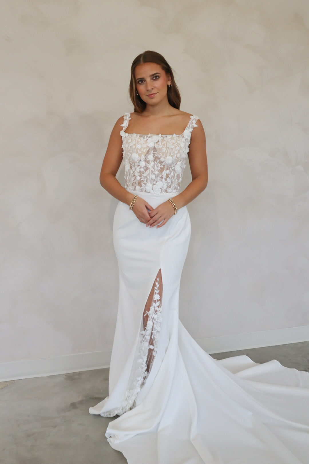 Introducing "Faye" - A truly stunning fitted crepe gown with just the right amount of dreamy floral lace in the bodice. The bodice of the gown features a defined square neckline with supportive thick straps. The simple skirt is detailed with a peekaboo lace slit, and buttons down the back of the train. This gown is perfect for the bride who loves a fitted gown with a hint of sparkle and lace detail. The mix of thick crepe and lace combines two lovely fabrics into one fitted wedding look.