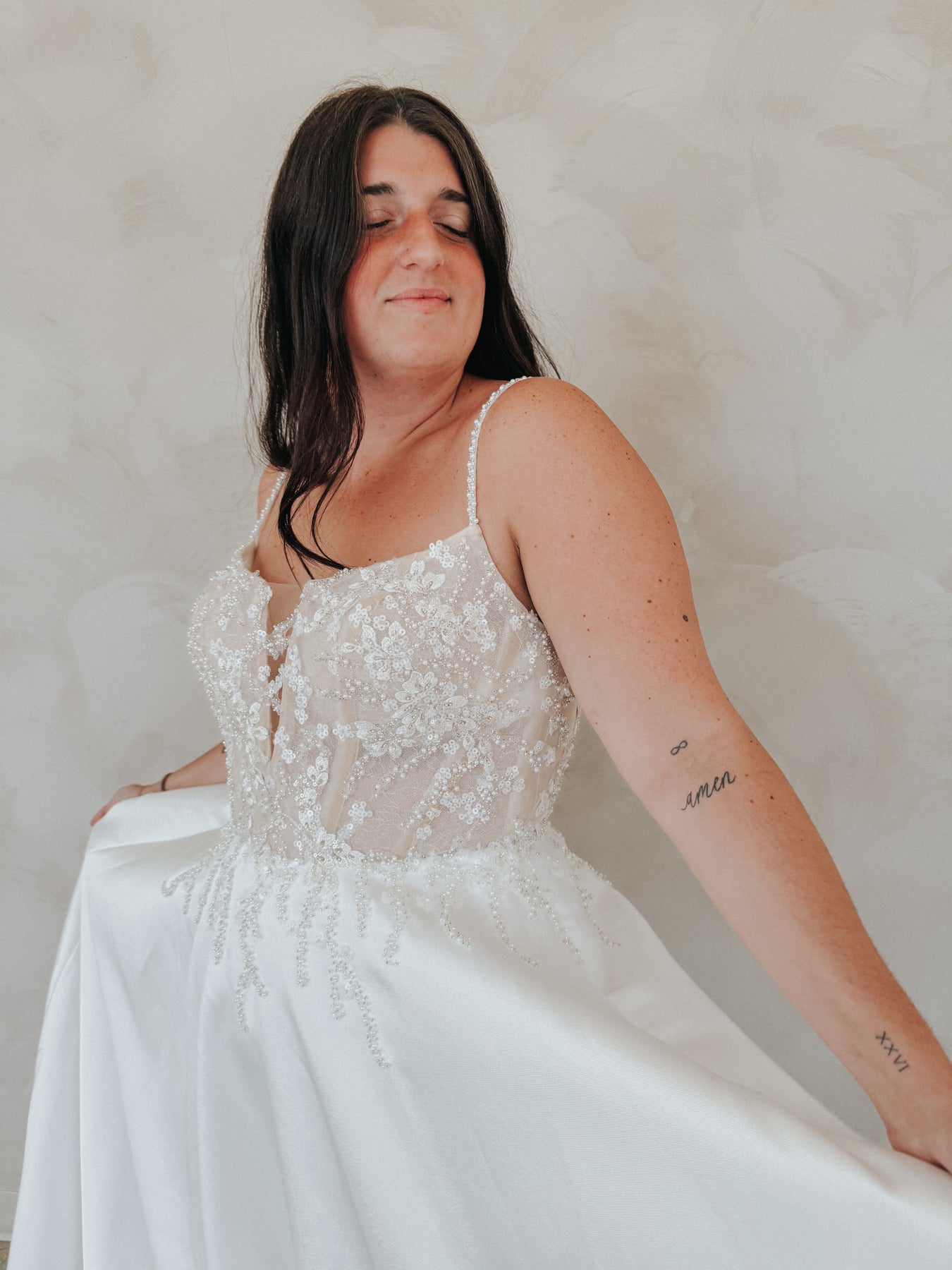 Meet “Liv” — a gown that glows with elegance and sparkle. Her illusion bodice is drenched in beaded floral appliqué, cascading into soft, shimmering droplets that flow effortlessly into a sleek satin skirt. With delicate straps and a structured fit, Liv blends glam and grace in perfect harmony. She’s made for the bride who wants to shine without saying a word — confident, radiant, and absolutely unforgettable.