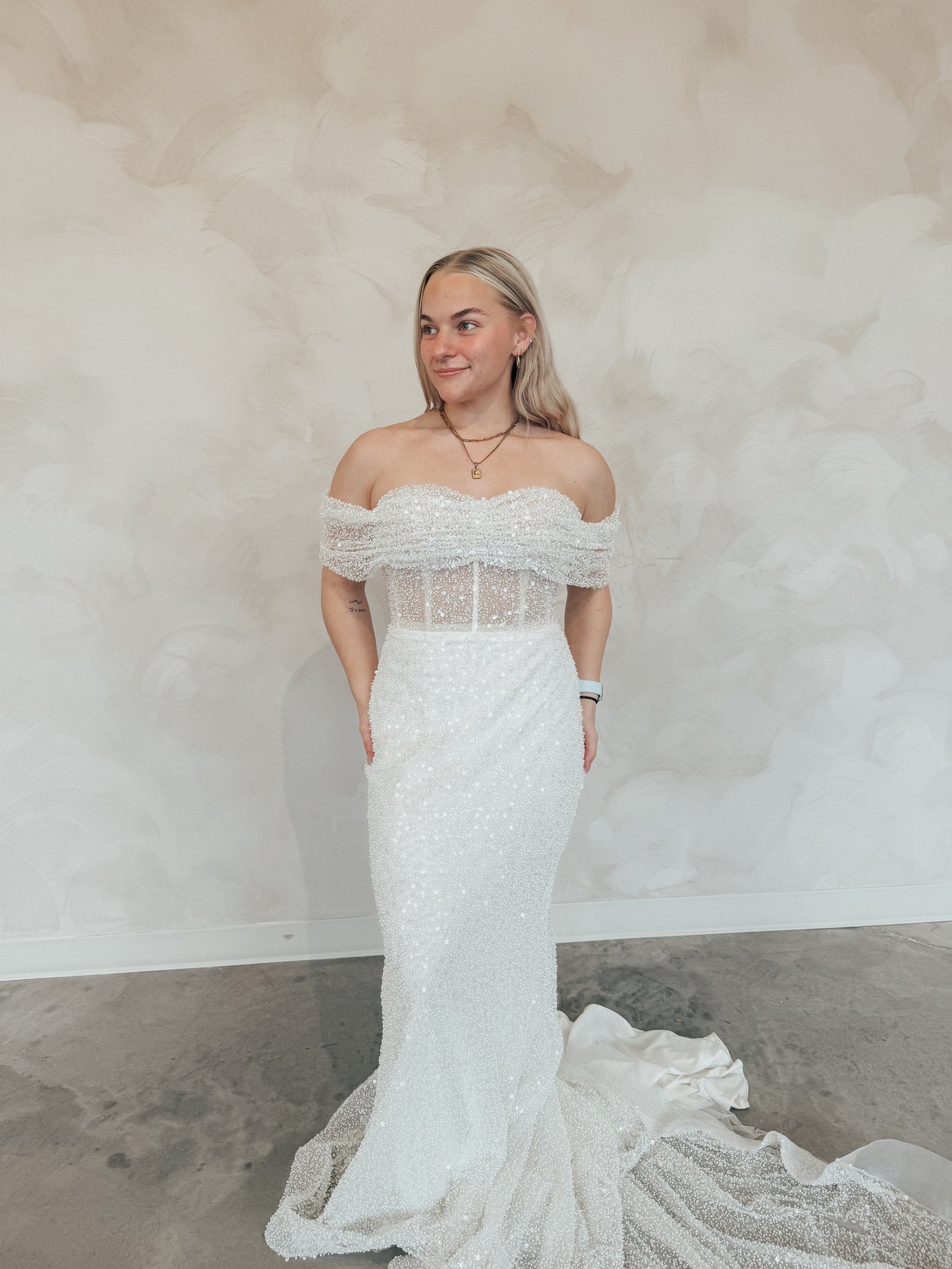 This gown is the perfect mix of romantic and modern elegance. Featuring an off-the-shoulder neckline with delicately draped beaded sleeves, the structured corset bodice flatters the figure with its sheer detailing and intricate embellishments. The fitted skirt flows seamlessly into a soft train, creating a sleek silhouette that sparkles from every angle. Designed for the confident bride who loves timeless glamour with a touch of allure.