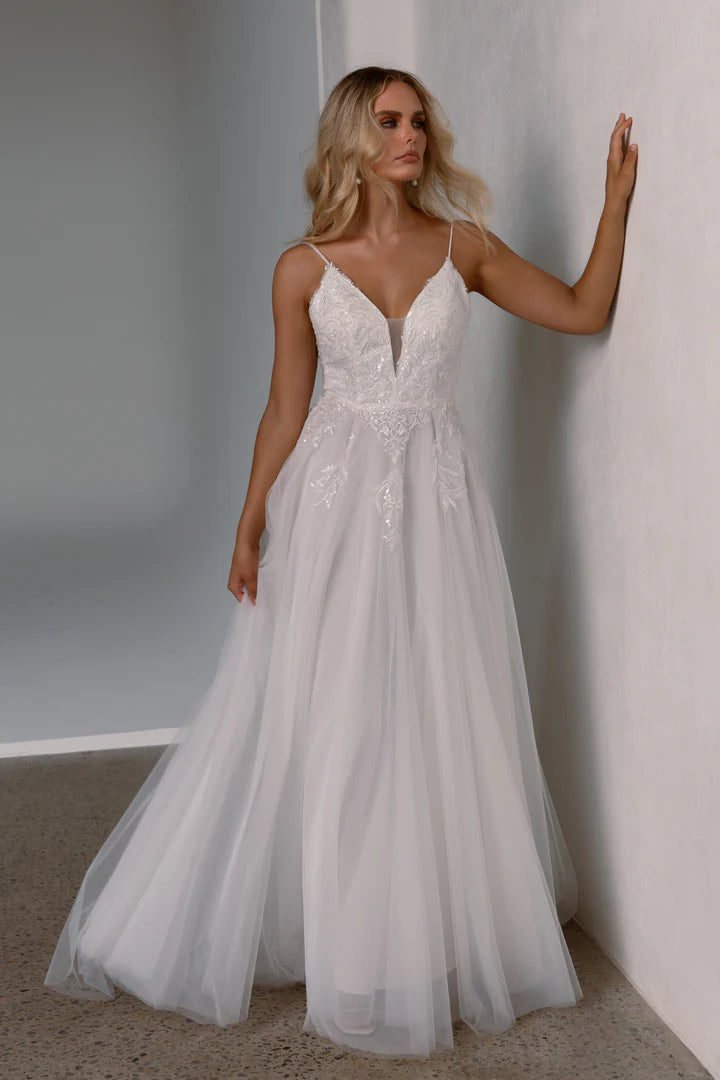 Radiating timeless elegance and a hint of drama, our Rue bridal dress by Tania Olsen Designs is crafted from beaded sequin lace appliqué layered over soft tulle, creating a luminous, ethereal effect with every step. Designed for the bride who wants to shimmer with sophistication, it blends vintage-inspired detail with contemporary allure.