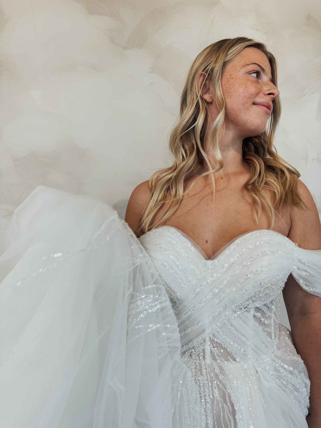 This off-the-shoulder ball gown is pure modern fairytale magic. The structured sweetheart bodice features intricate beaded detailing that cascades into a full, ethereal tulle skirt. Soft draped sleeves add a romantic touch, while the subtle shimmer throughout the gown catches the light beautifully with every movement. Elegant, feminine, and effortlessly regal — this gown is perfect for the bride who wants to feel timeless yet radiant on her wedding day.
