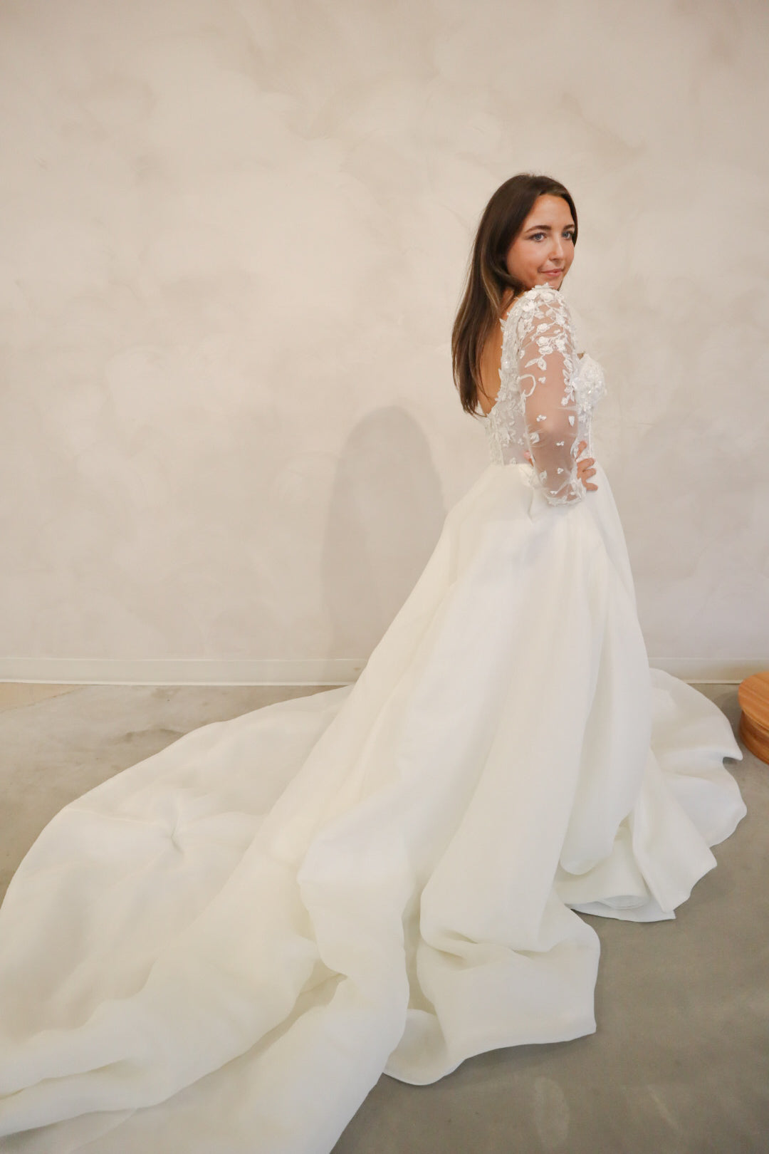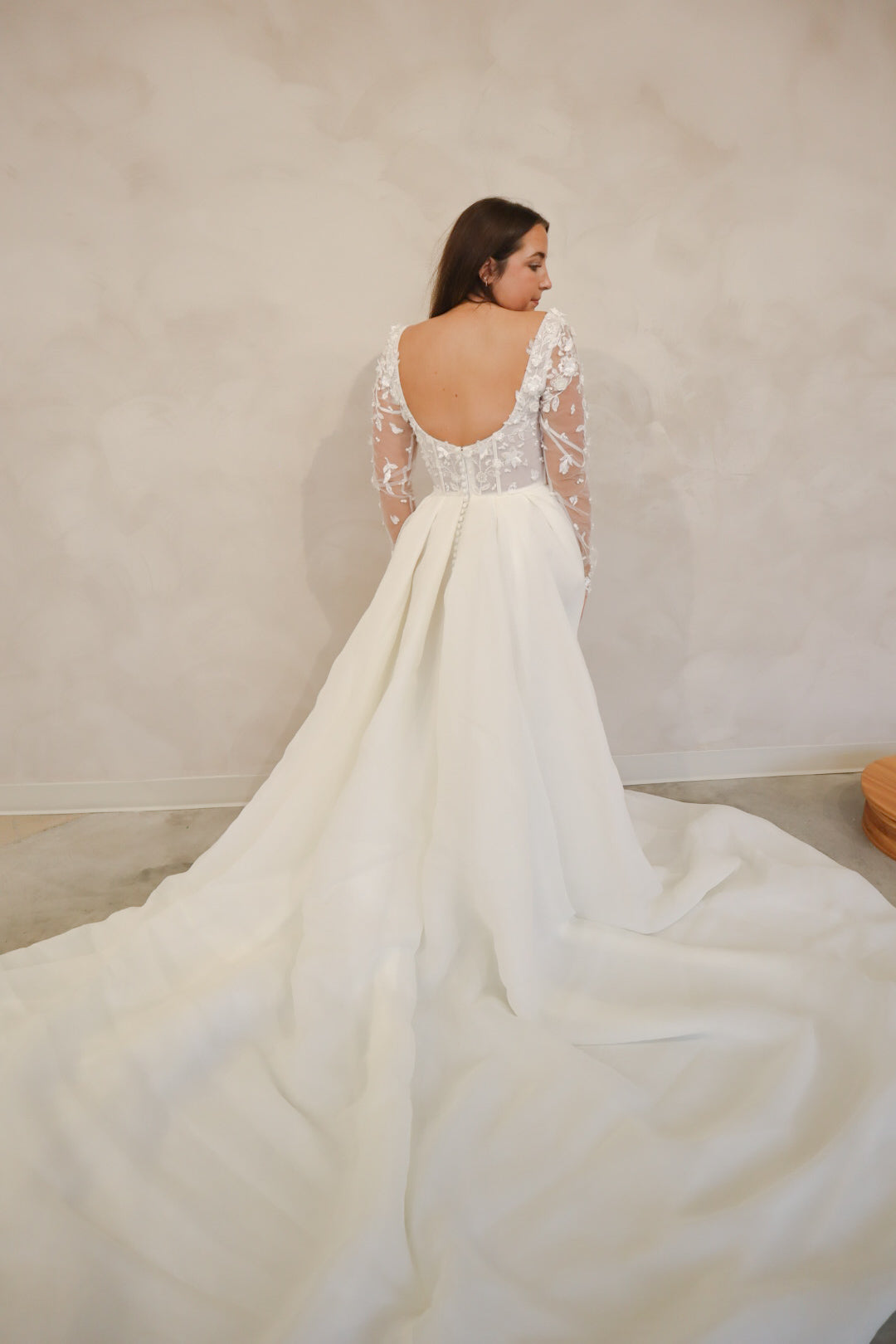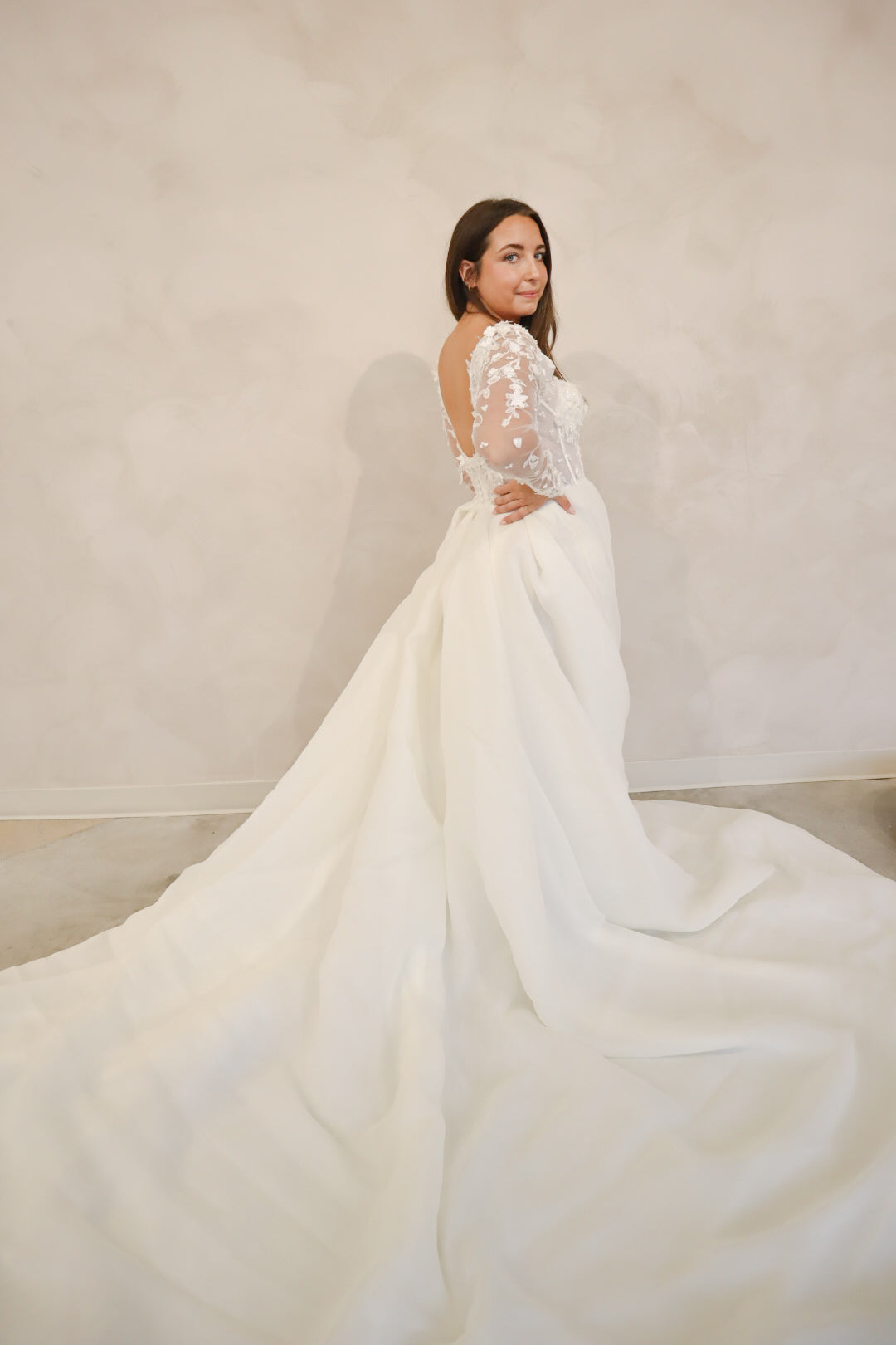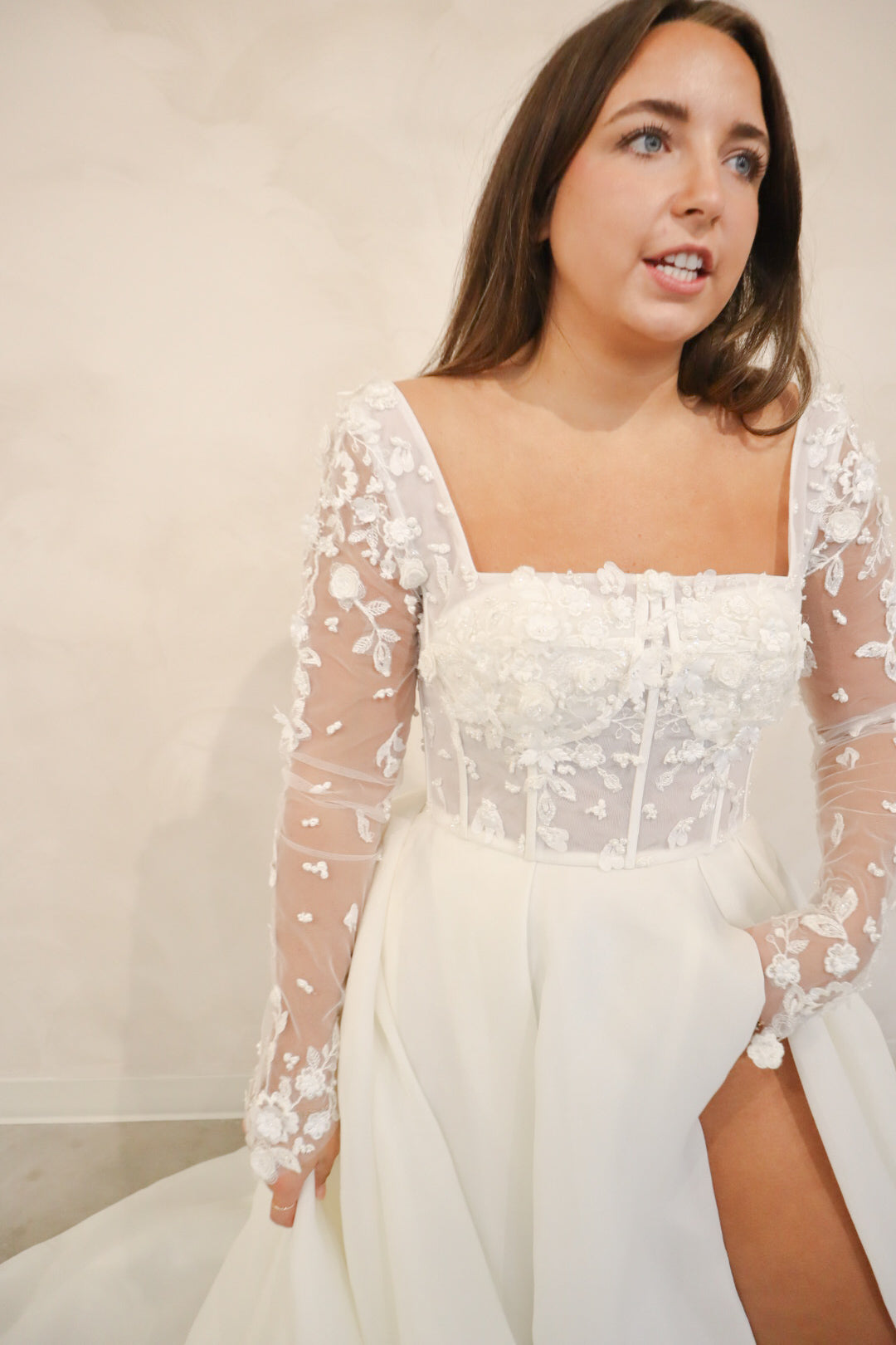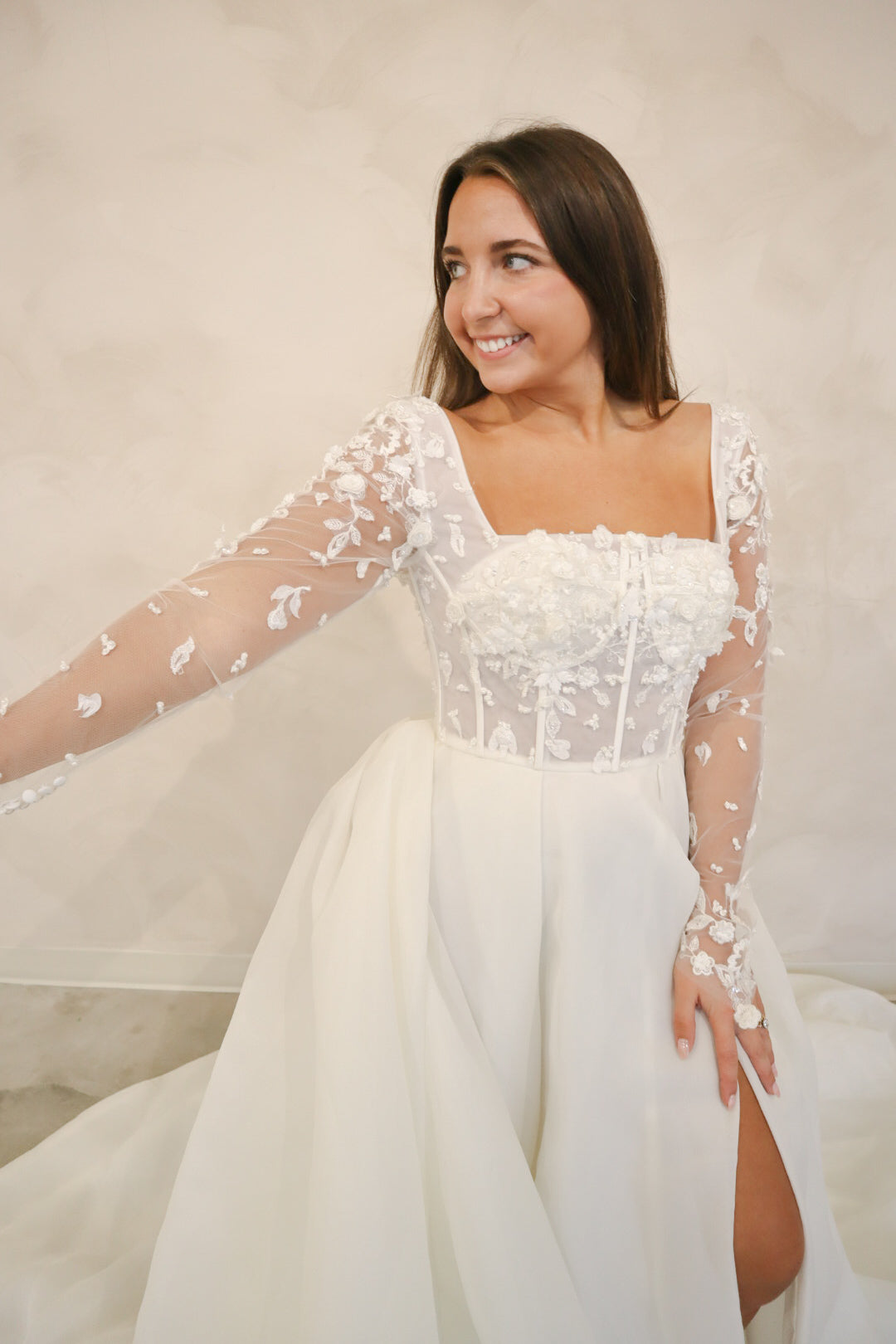 This a-line wedding dress is the perfect mix of timeless and ethereal. The clean organza skirt is full of pleating and a high slit for drama, while the bodice features a corset style. The illusion boning is detailed with sparkly floral appliqué. The full gown is finished with romantic illusion lace sleeves with elegant button closures.