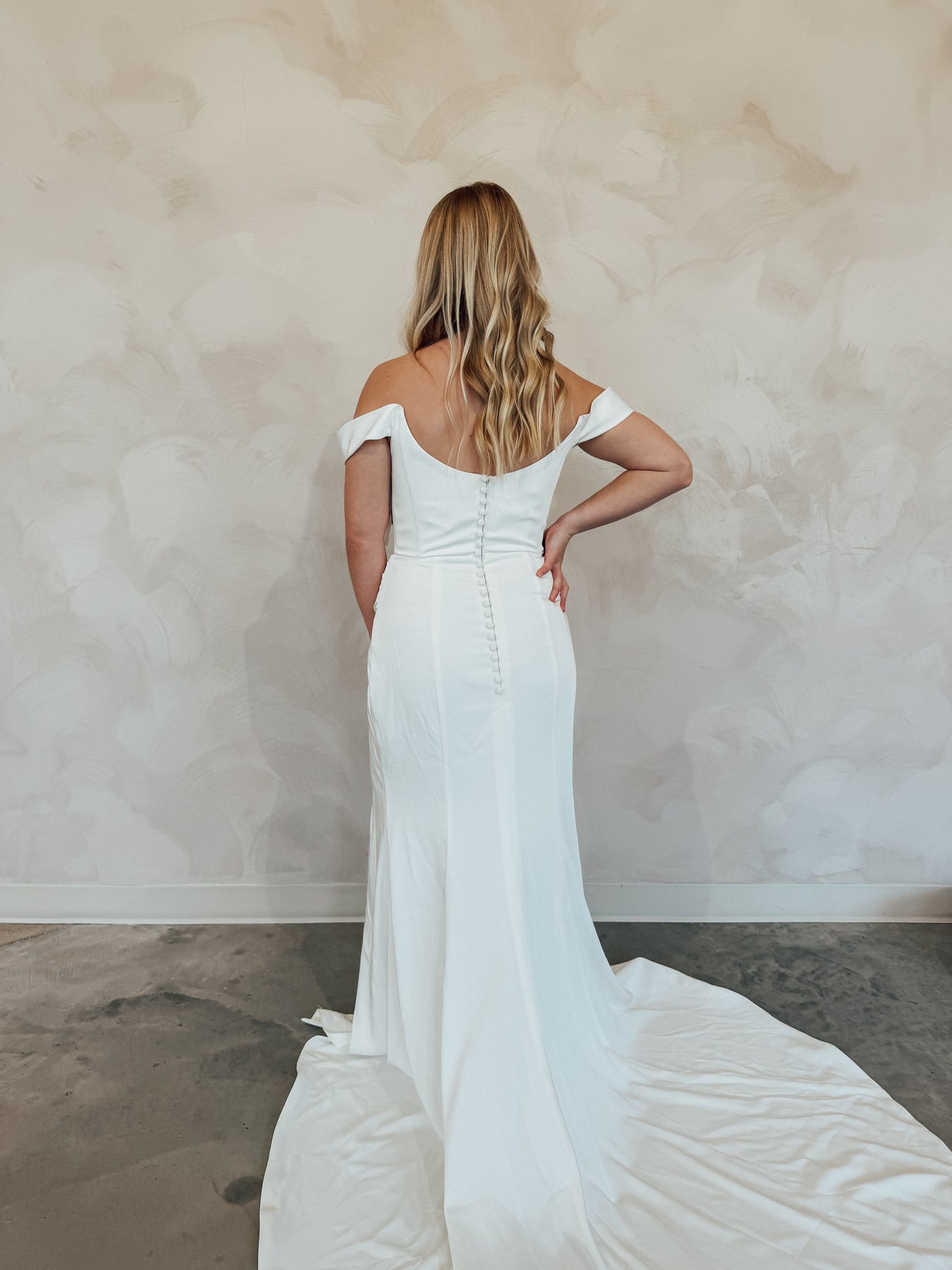 Cora is all class — effortlessly sexy yet timelessly chic. This modern crepe wedding dress features elegant off-the-shoulder straps, a flattering leg slit, and a structured corset bodice that sculpts the body beautifully. The softly scooped back is finished with cascading buttons and a sweeping train that moves with effortless grace. Crafted in luxurious crepe that hugs in all the right places, Cora is the perfect off-the-shoulder bridal gown for the bride who loves refined elegance with a touch of allure.