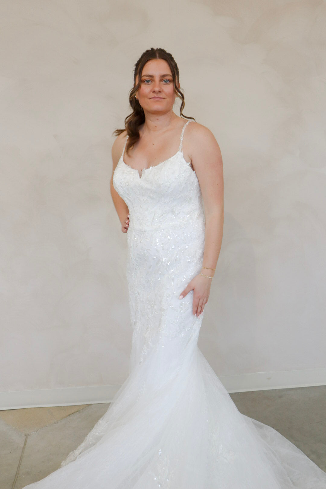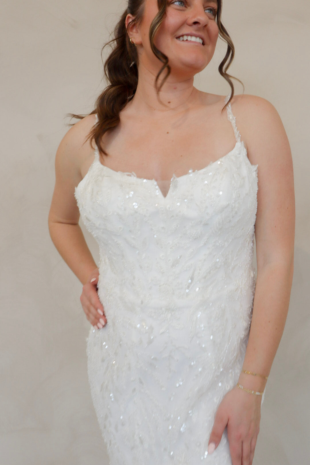 Introducing "Dahlia"- This fit-and-flare wedding gown features allover sequin and bead detailing that gradually fades down the skirt. It has a scoop neckline with skinny straps and a small illusion V inset at the front. The back is straight across with a slight dip. The fitted bodice and hips lead into a gently flared skirt for a sleek and elegant silhouette.
