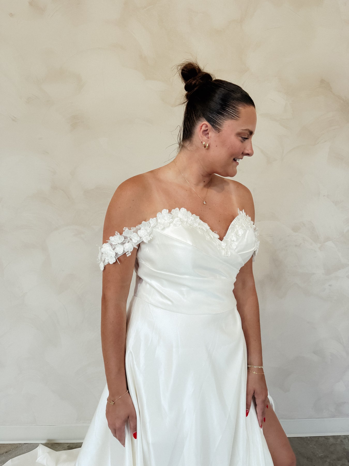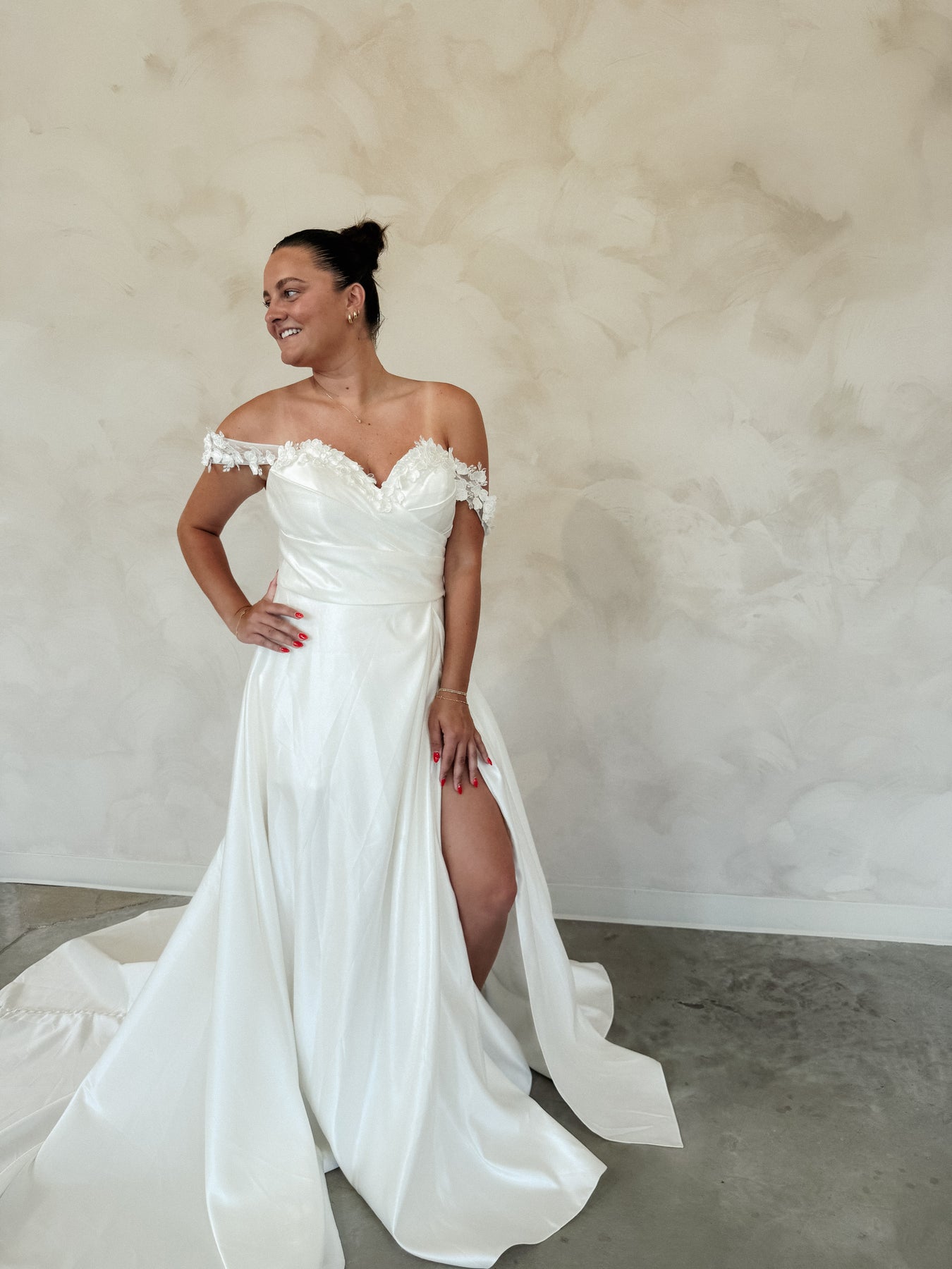 Meet "Mary" This romantic off-the-shoulder gown with appliqué dancing along the sweetheart neckline. The back features a sheer boned bodice with delicate floral appliqué and soft draped sleeves. The structured top flows into a full satin skirt with pleated detailing and a row of covered buttons that trails down the back. Perfect for the bride who wants a blend of modern structure and classic elegance.