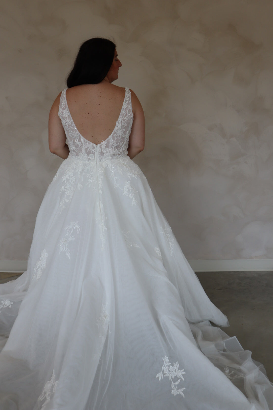 Introducing "Nina" - This sleeveless A-line wedding dress features a delicate lace bodice with a flattering scoop neckline and wide straps for soft support. The structured top flows into a full tulle skirt with scattered lace appliqués, creating a light and romantic silhouette. A subtle illusion panel at the waist adds dimension without compromising coverage. Ideal for garden weddings, chapel ceremonies, or any bride seeking a classic lace wedding dress with modern details and airy movement.