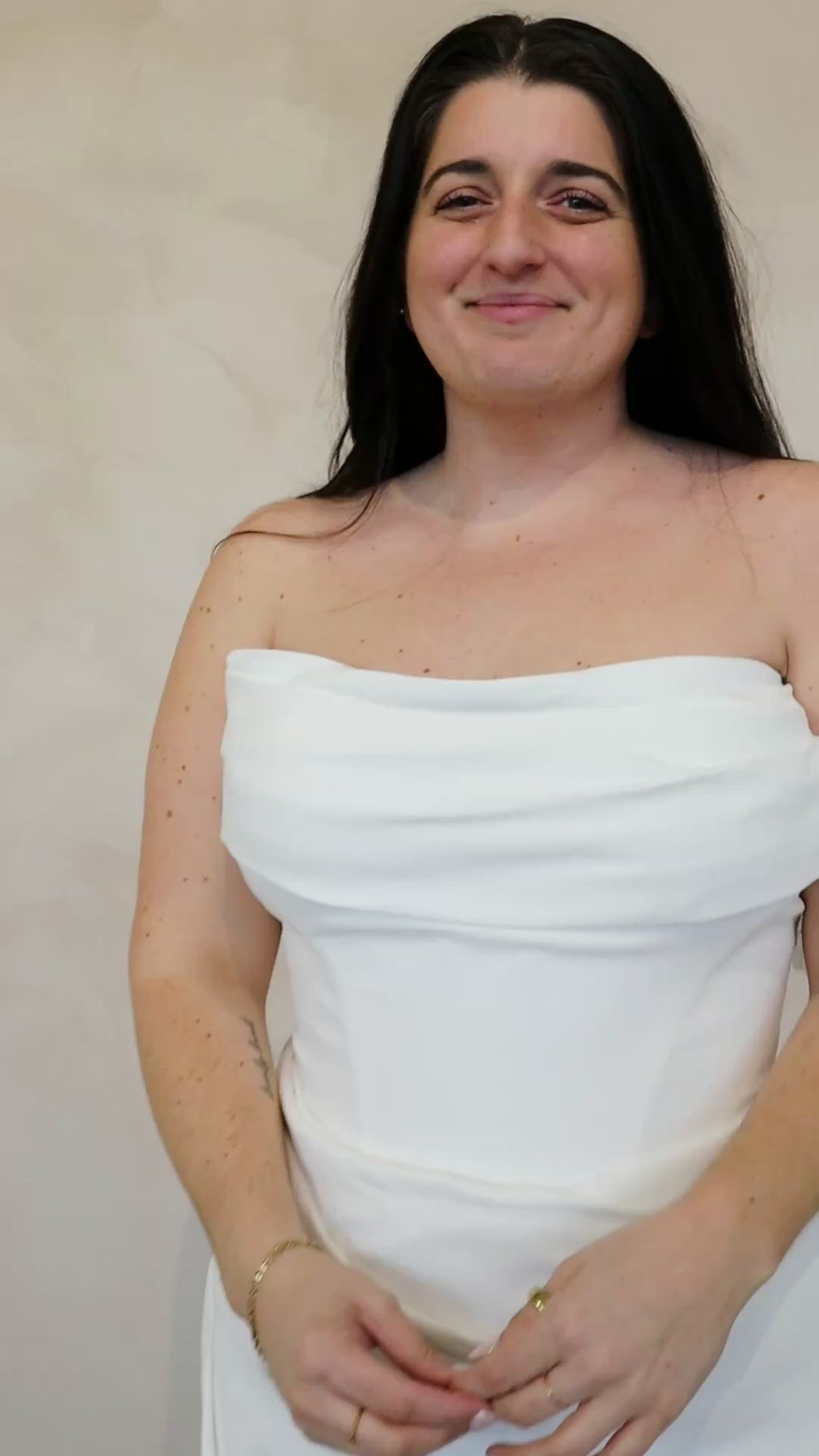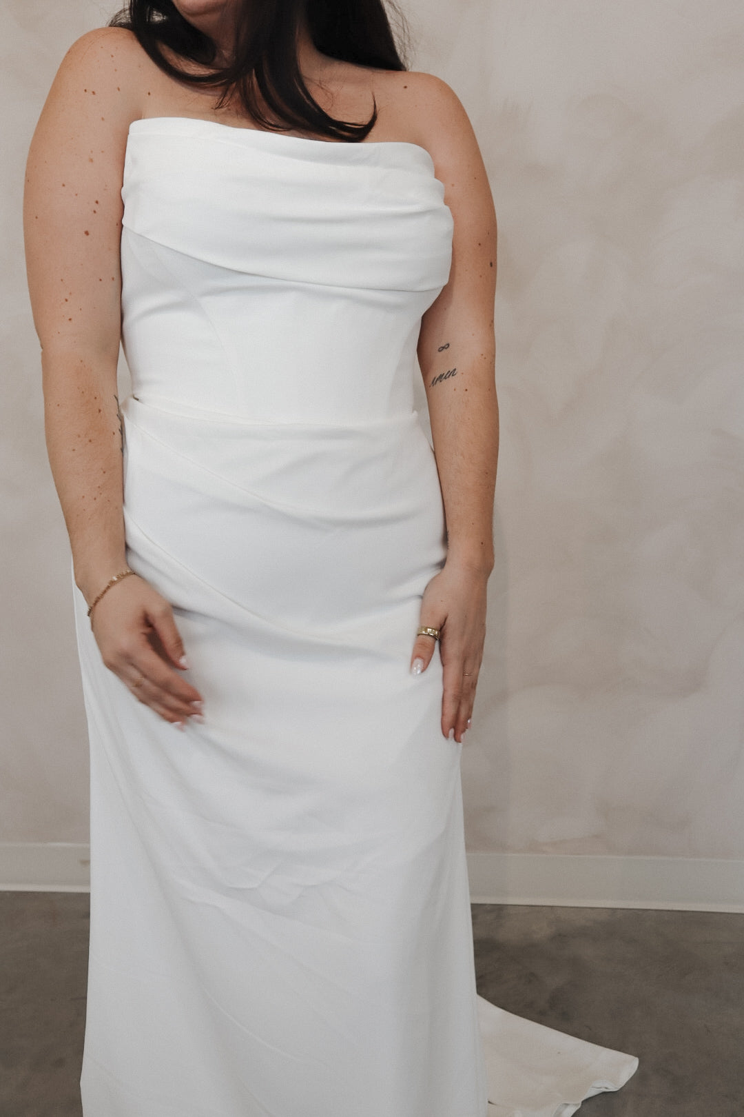 Introducing "Juniper"- Juniper is a stunning fit and flare down with a draped cowl neckline. The bodice is detailed with boning and a Basque waist, which effortlessly flows into light crepe draping in the skirt of the fitted gown. The back is finished with ivory crepe buttons all the way down the train. This gown is the perfect mix of a clean and timeless silhouette with modern seam detailing.