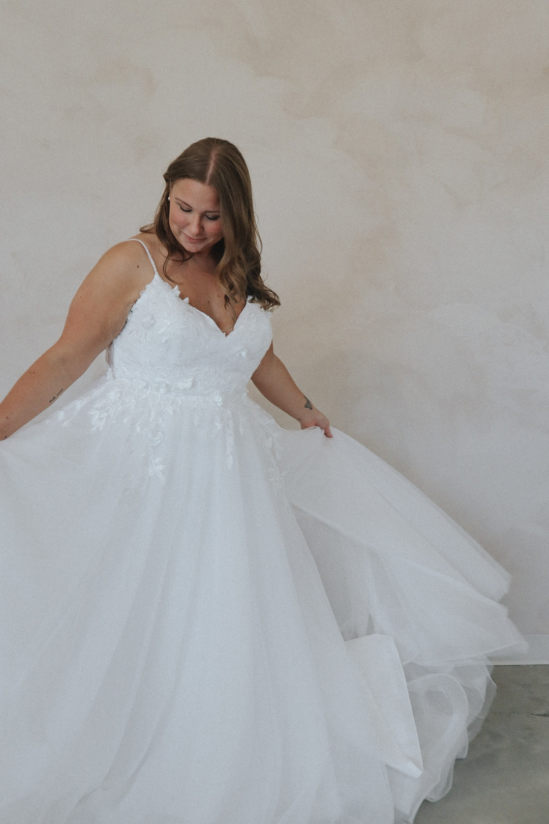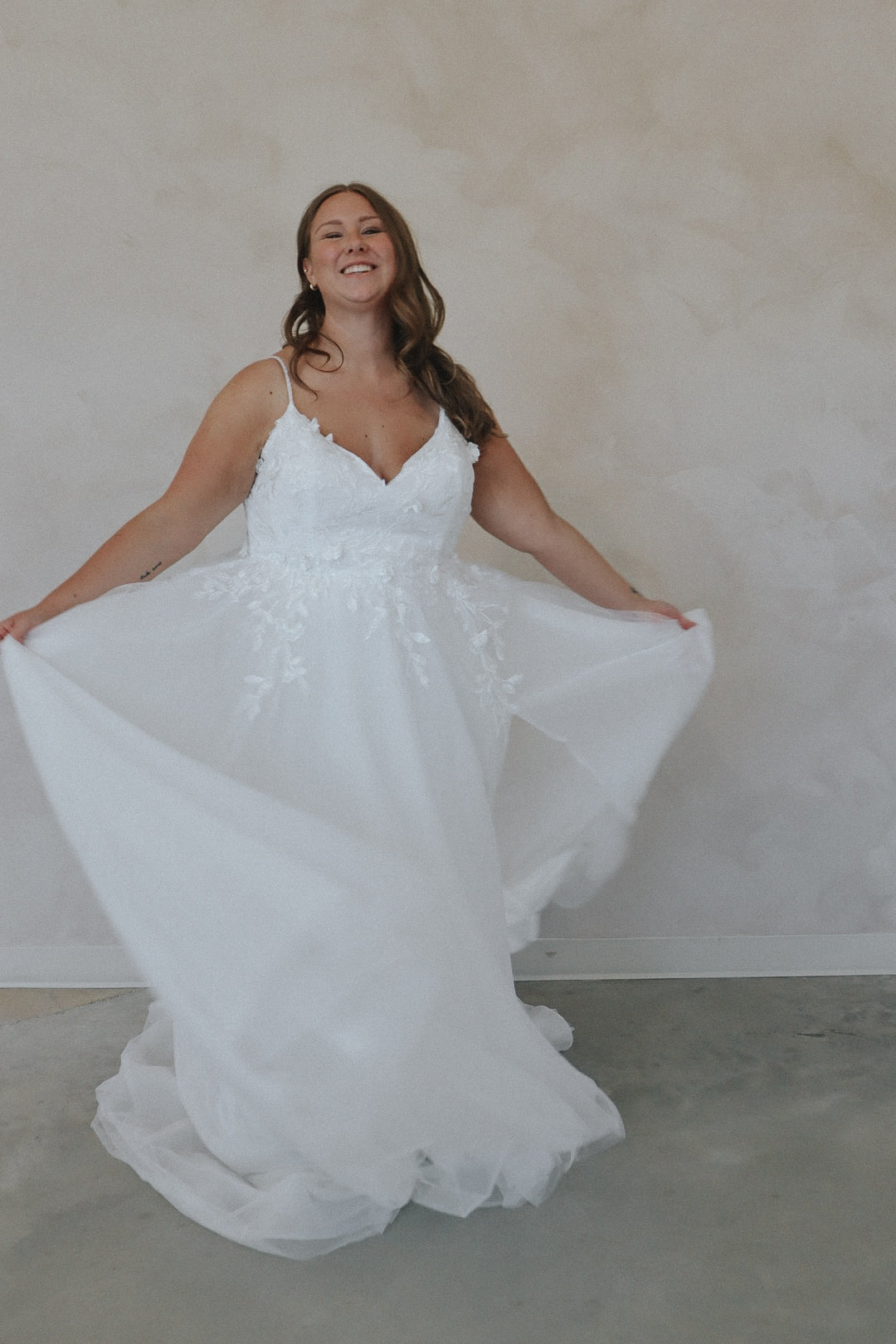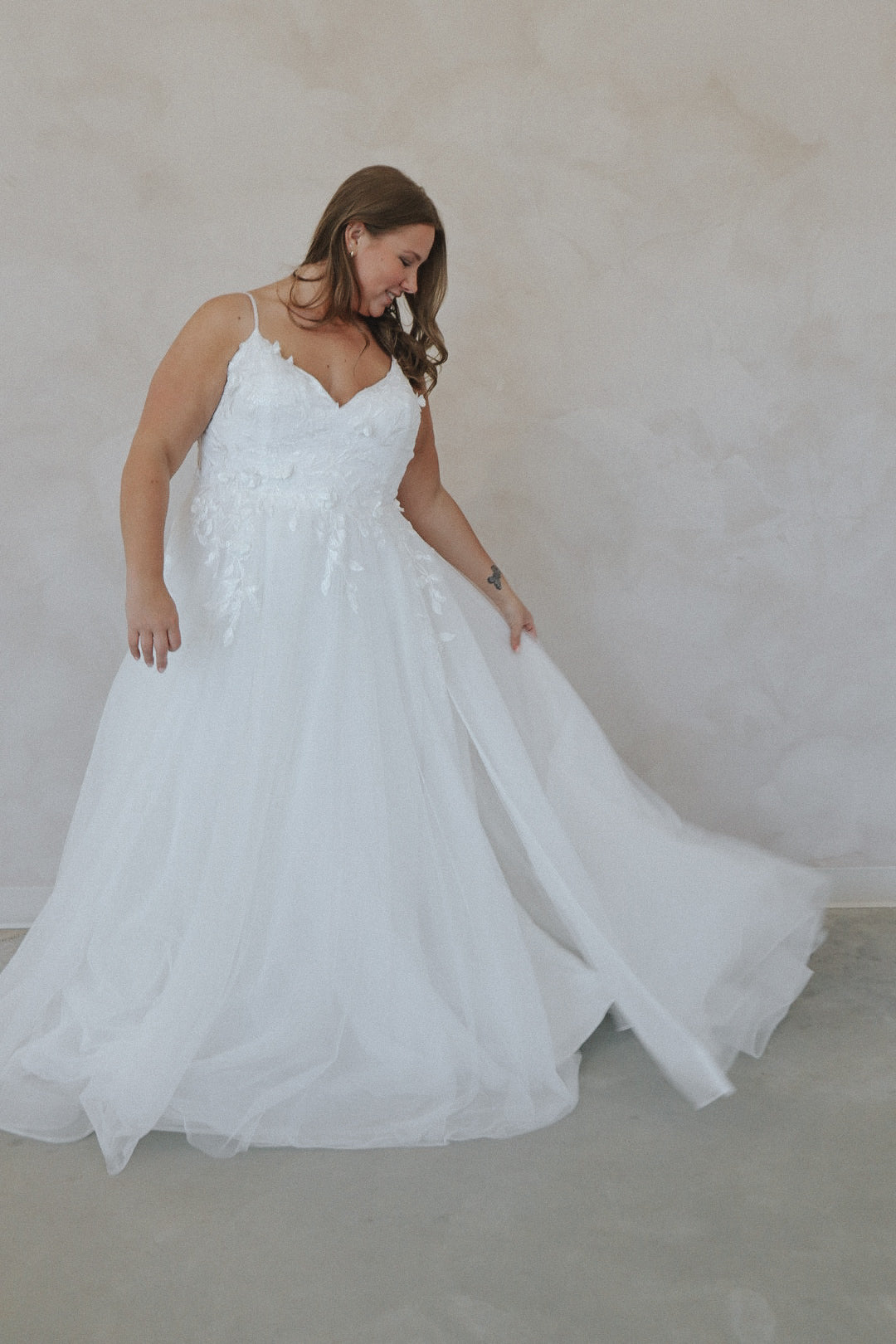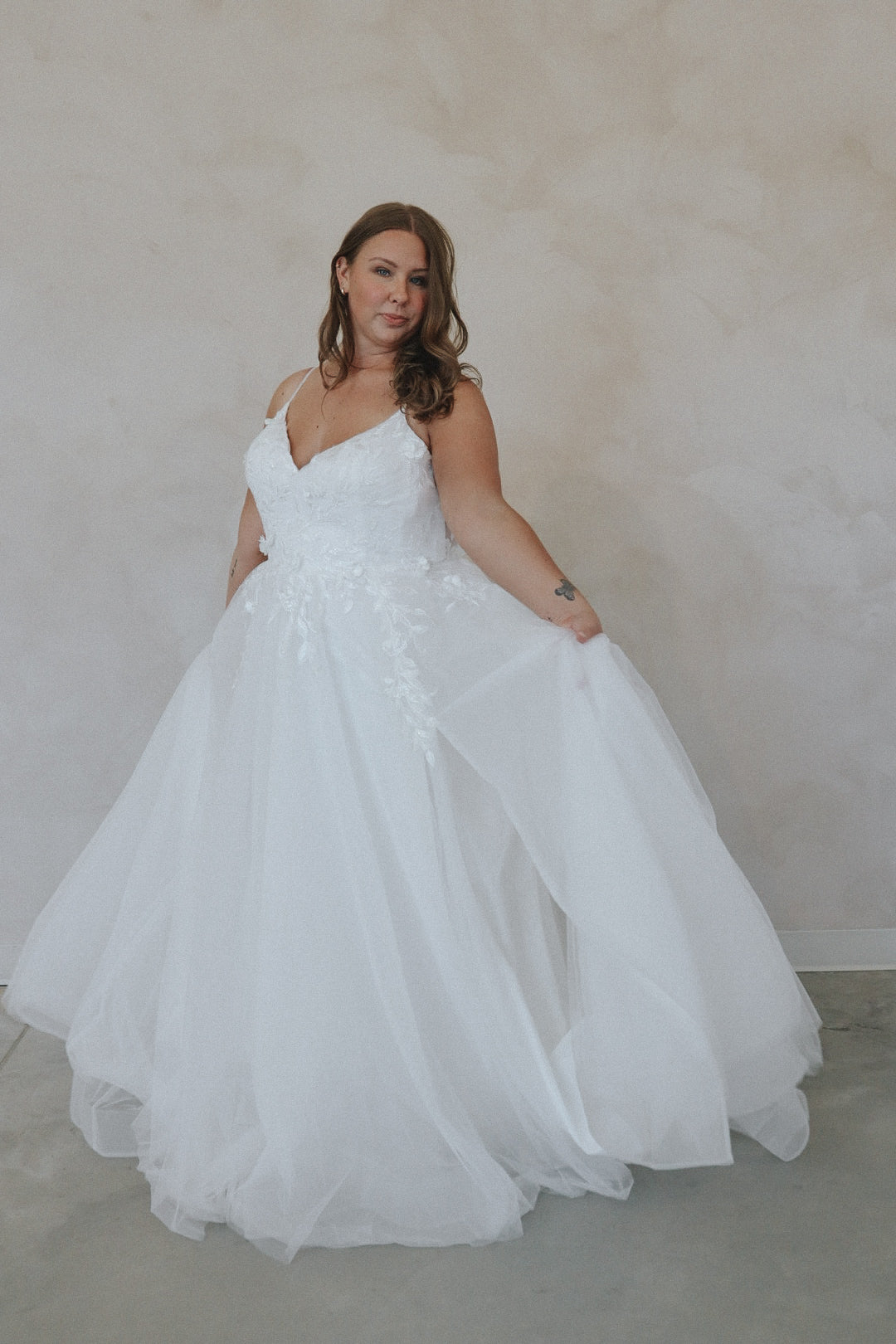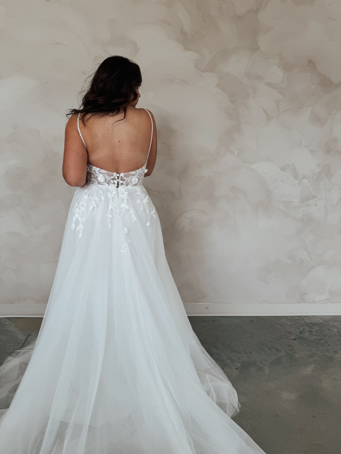 Introducing "Magnolia" - This gown perfectly blends timeless elegance with fresh, modern romance. Crafted in airy layers of tulle, the A-line skirt softly floats with every step, offering a light and ethereal feel. The bodice features delicate floral embroidery, artfully placed to accentuate the waist and enhance the feminine silhouette. Subtle sparkle in the appliqués adds a touch of glamor.