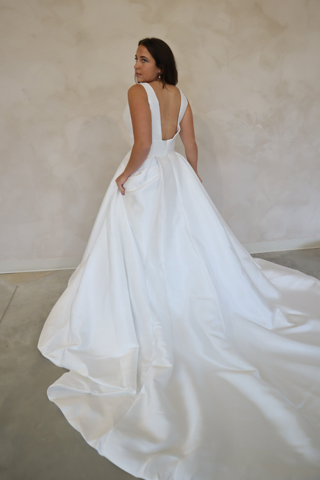 Introducing "August" - This timeless wedding gown features a sleek A-line silhouette crafted from smooth satin for a modern yet classic look. The bodice showcases a deep V-neckline in both the front and back, balanced by wide straps that provide structure and support. A fitted waistline flows effortlessly into a full skirt with soft pleats, creating graceful movement. The back extends into a sweeping train, adding a touch of drama to the understated design. Perfect for brides who love minimalist elegance with a sophisticated finish.