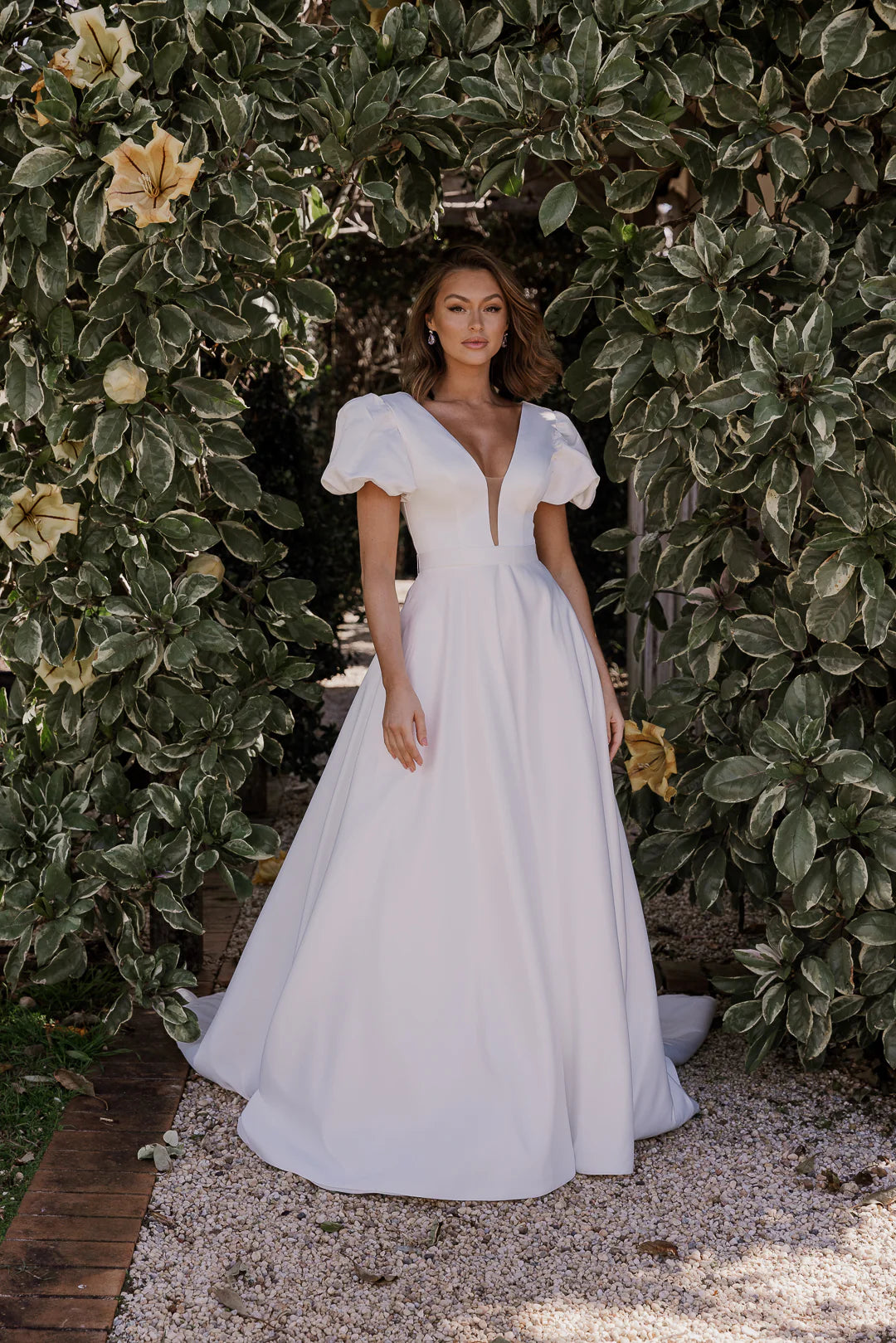 Introducing "Fayette" A stunning satin a-line gown with a plunging neckline with a modesty panel and full skirt. Fayette is adorned with with detachable puff sleeves, a simple satin belt at the waistline, and fun pockets. This gown is perfect for the bride who wants a classic look and silhouette with a twist. Back features button detailing.