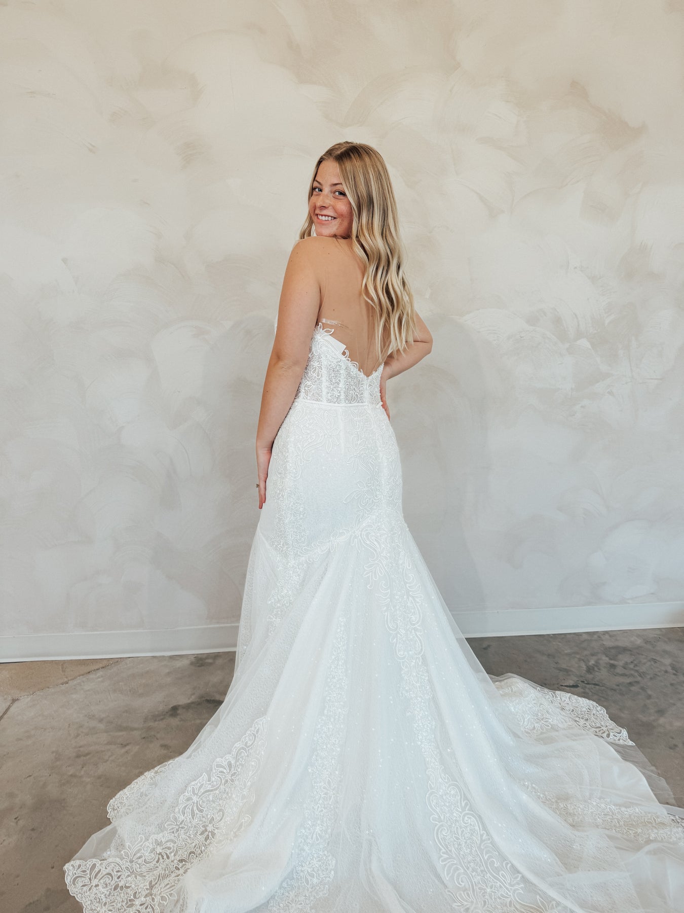 This gown is a stunning strapless fit-and-flare wedding dress that blends modern allure with timeless elegance. The structured corset bodice features a sheer lace design and defined boning for a sculpted, flattering fit. Intricate lace appliqué cascades seamlessly into a shimmering tulle skirt, creating a subtle sparkle with every movement. The sweetheart neckline adds a romantic touch, while the illusion back and sweeping train give a sophisticated finish.