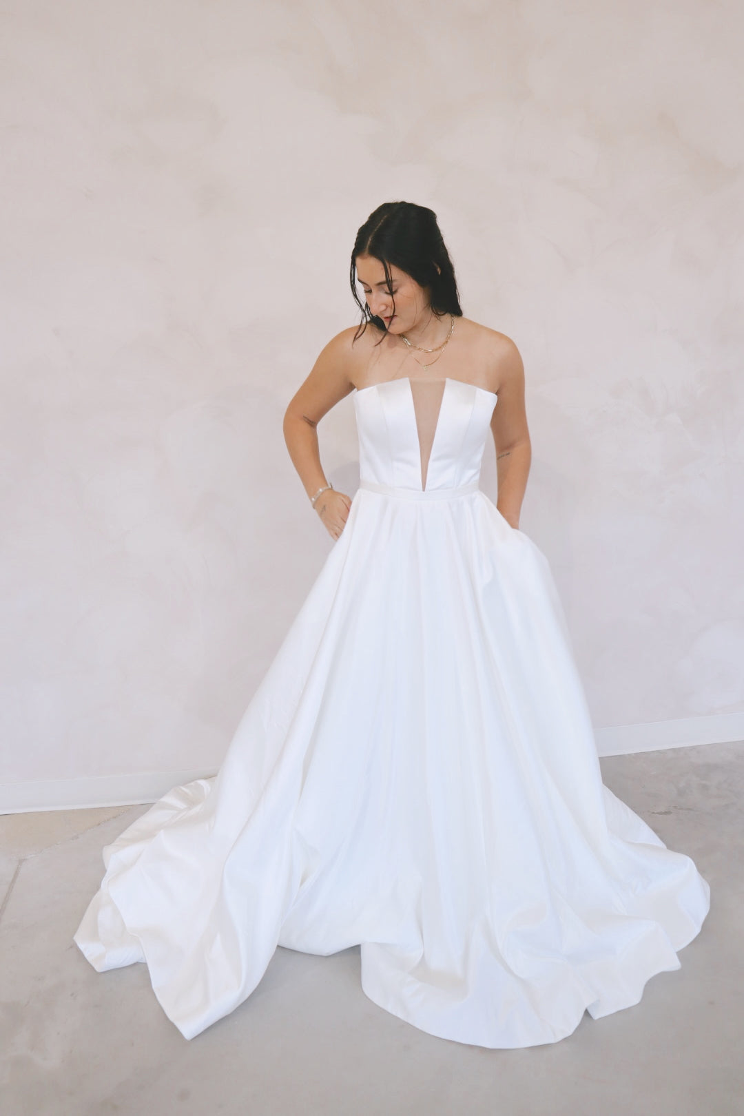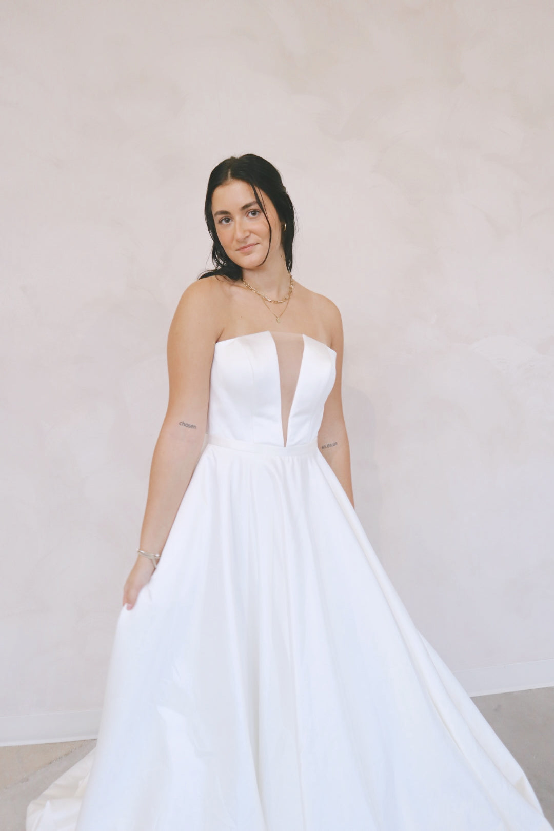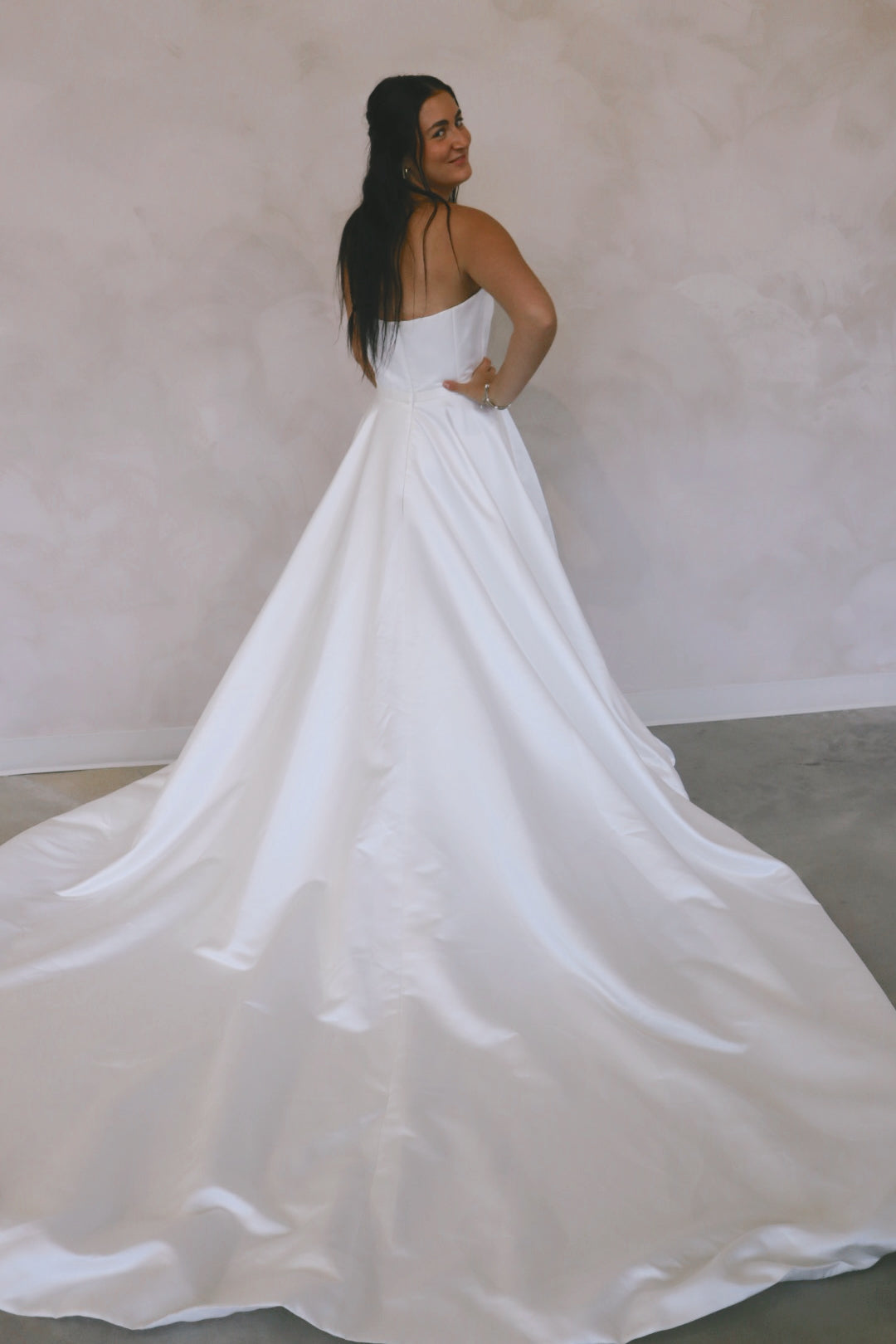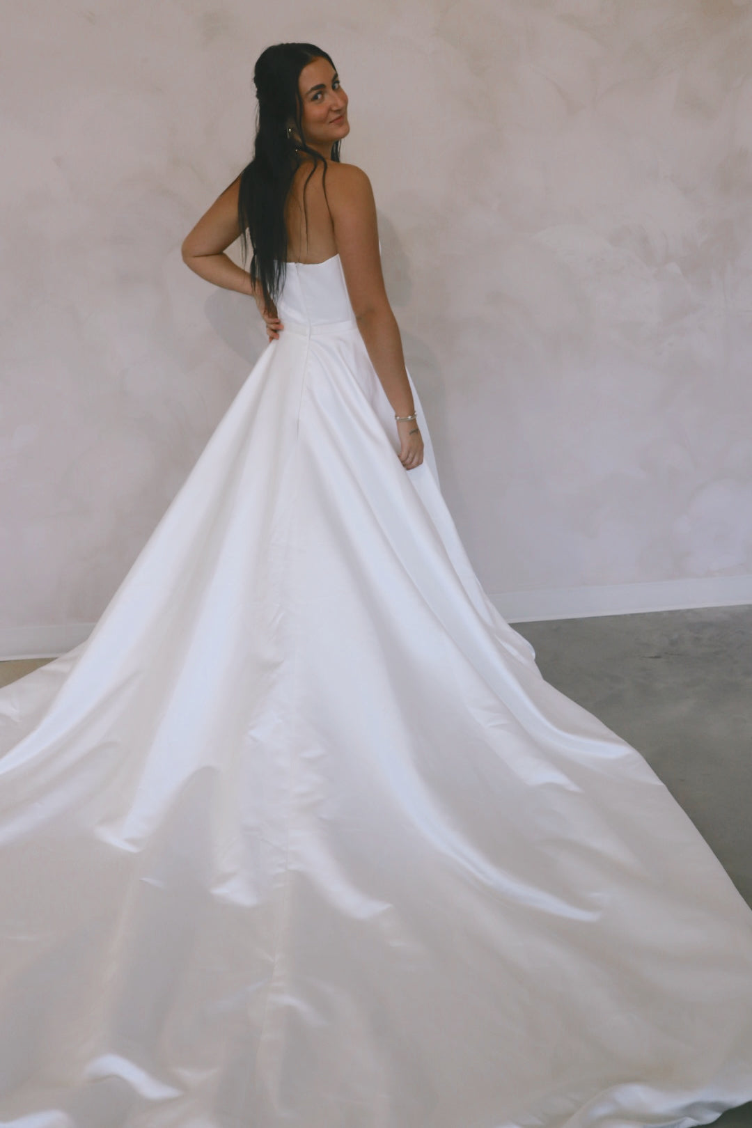 This gown pairs modern minimalism with striking detail. A plunging deep V neckline and low open back bring a bold sophistication, balanced by the soft flow of an A-line skirt. Layers of luminous ivory satin and airy tulle create subtle volume without weight. Finished with a sweeping train, it’s an effortlessly elegant choice for the bride who wants clean lines with a touch of drama.