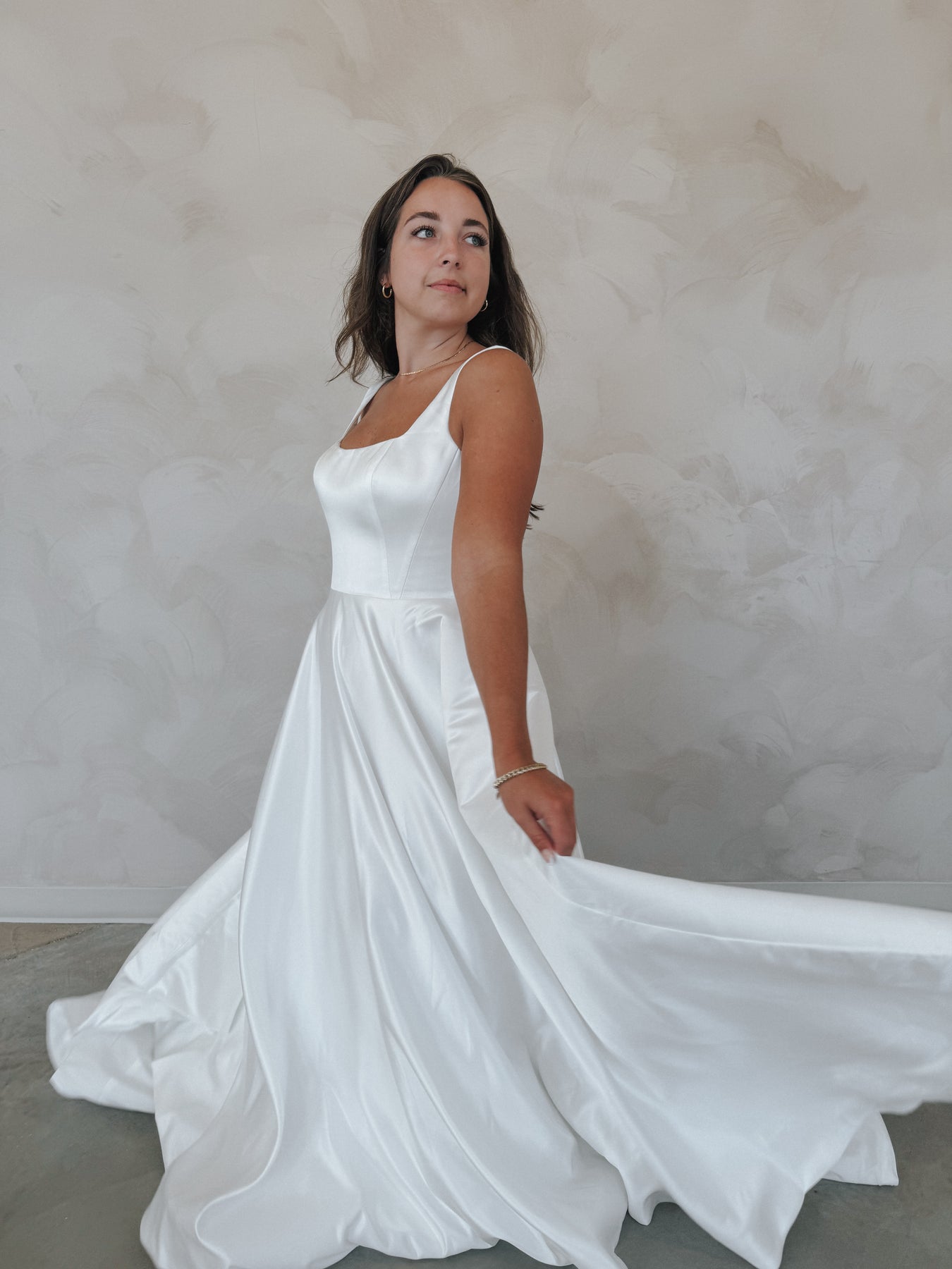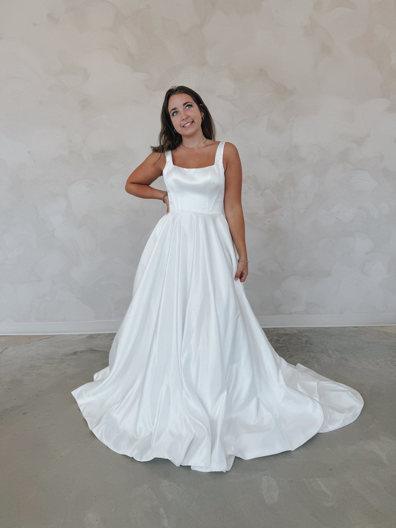 Meet “Ashley” — minimalism, but make it timeless. This structured A-line gown features a square neckline, wide straps, and a stunning clean satin that elevates the simplicity. With a clean silhouette and full train, Ashley offers understated drama for the modern bride who appreciates classic design with a effortless neckline. She’s graceful, tailored, and effortlessly chic — the definition of less is more.