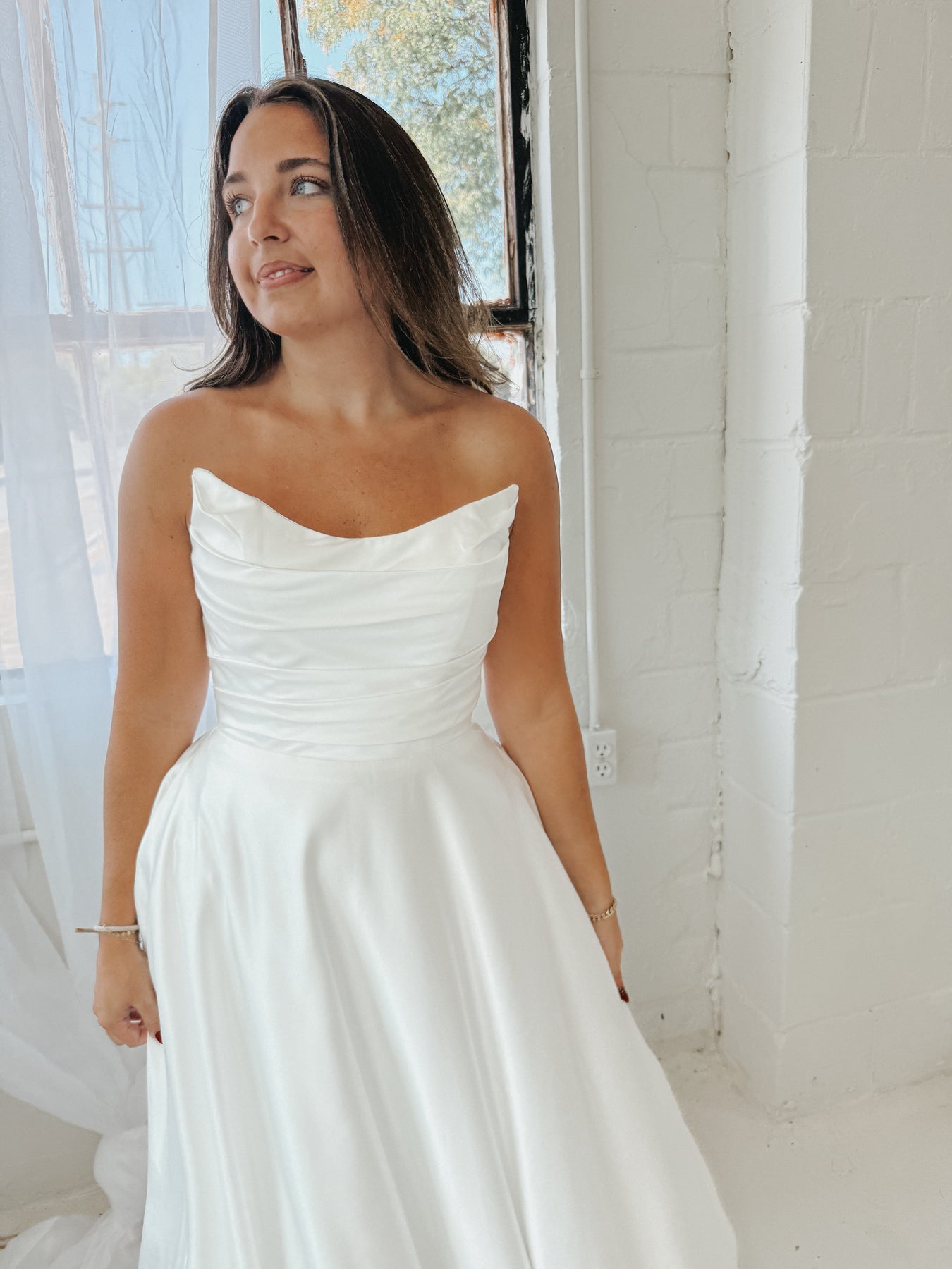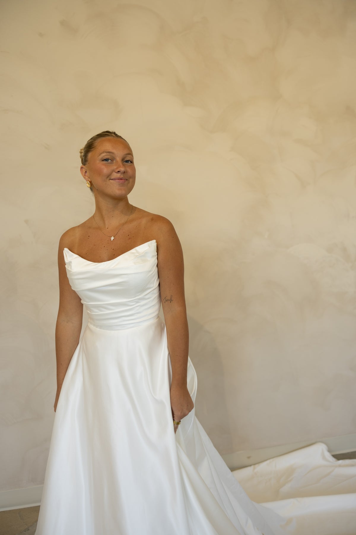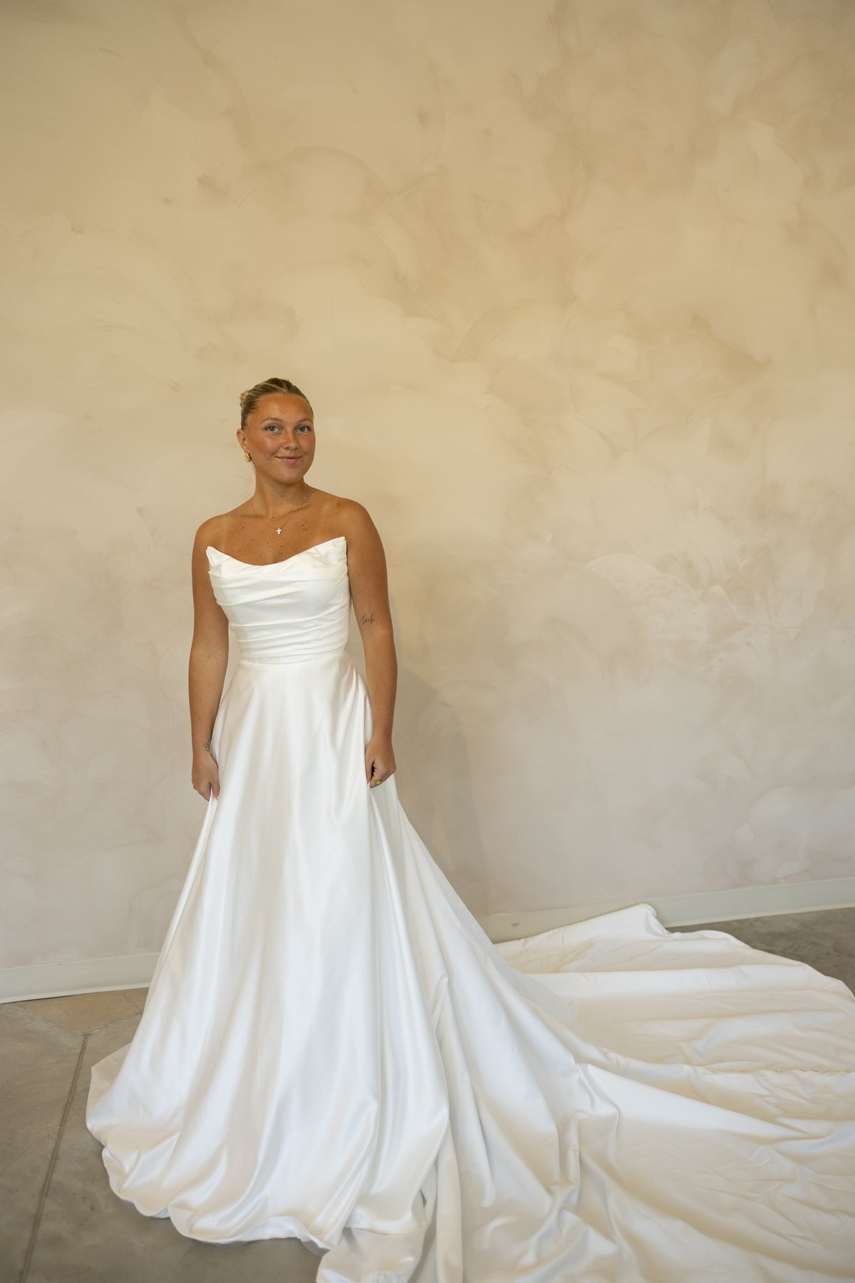 Introducing "Lane" - Featuring a softly draped cowl neckline, it offers a modern twist on a classic silhouette. The fitted bodice cinches at the waist before flowing into a graceful A-line skirt, creating beautiful movement with every step. Crafted from smooth satin, the dress exudes understated sophistication while maintaining a timeless appeal. Perfect for brides seeking a chic and romantic look with a touch of simplicity.