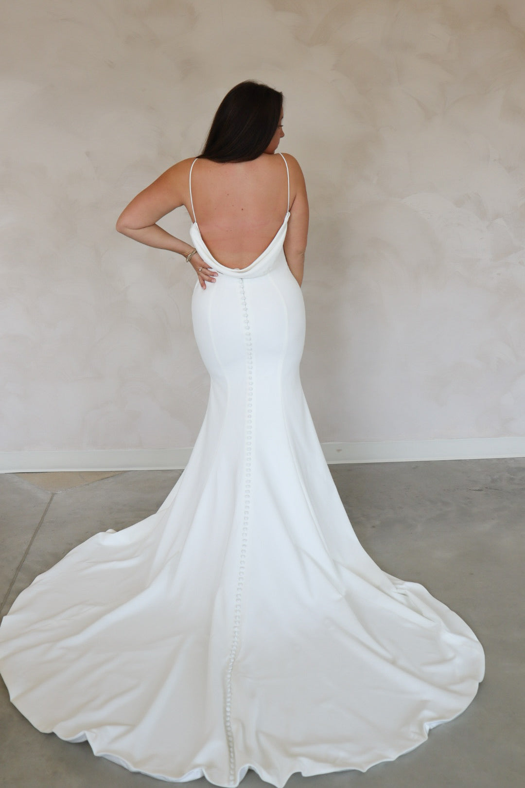 Introducing "Mila" - A celebration of modern simplicity, this gown is designed for the bride who finds beauty in clean lines and graceful movement. Cut in a soft, structured crepe, the silhouette gently skims the body, accentuating natural curves before flowing into a sleek train finished with a row of delicate buttons.