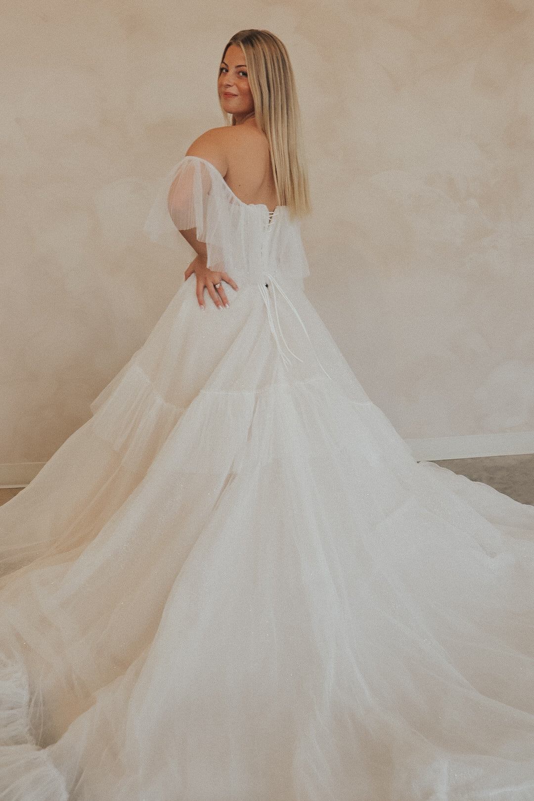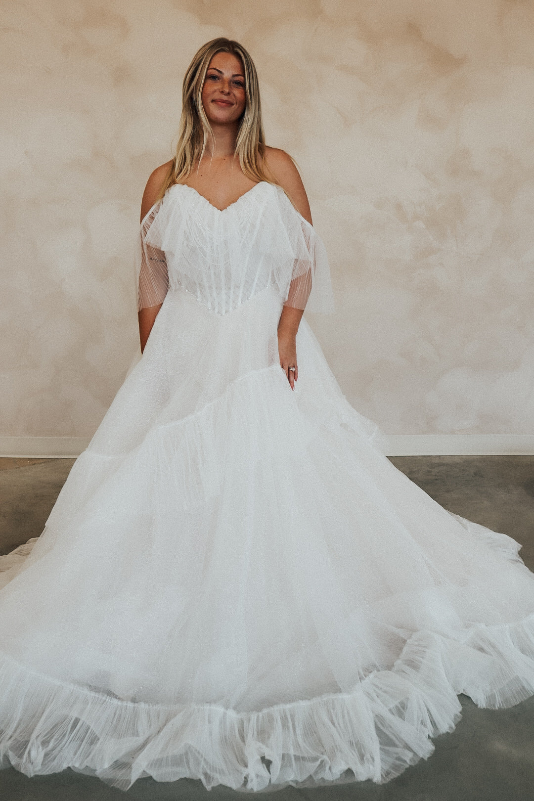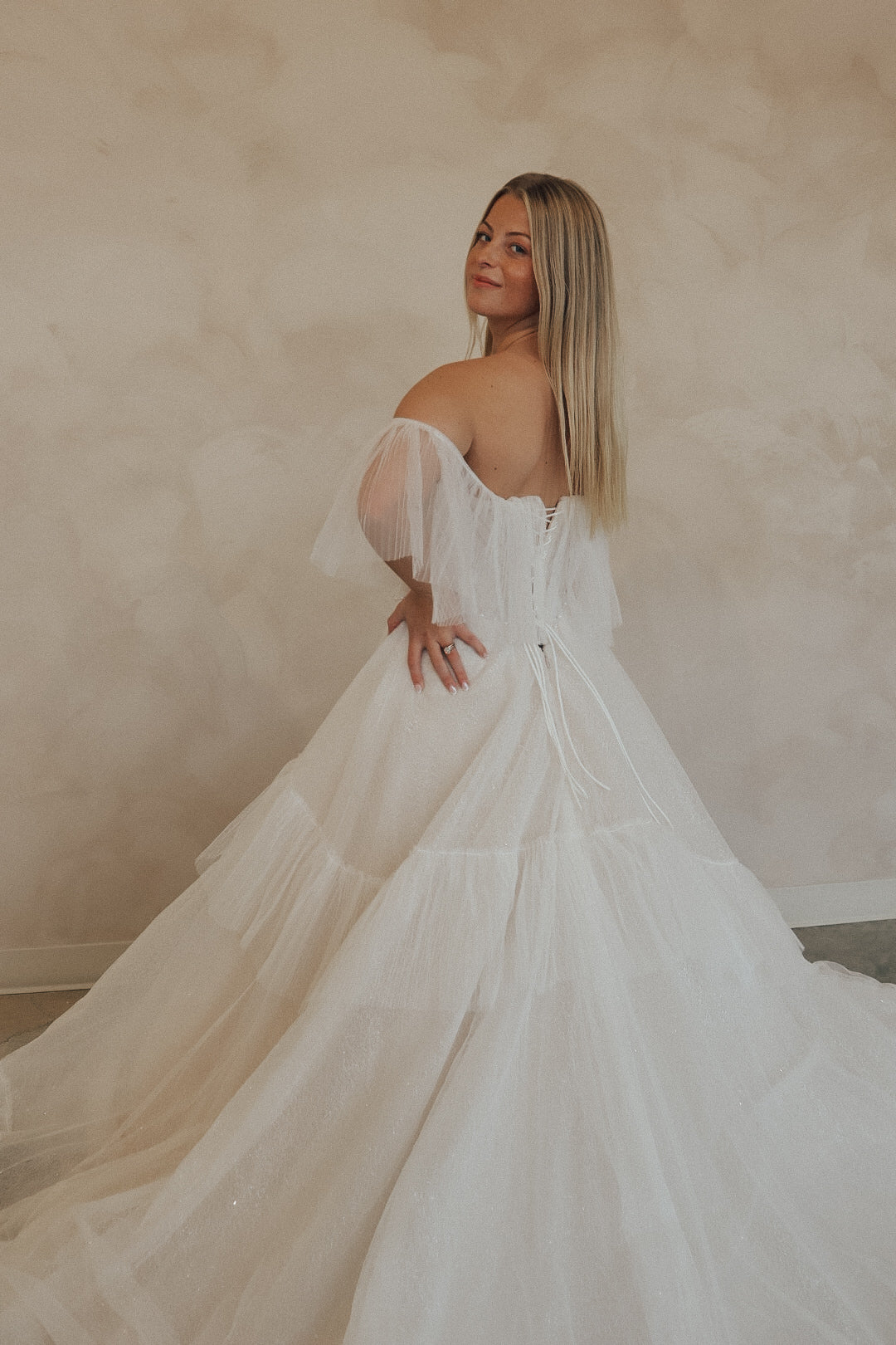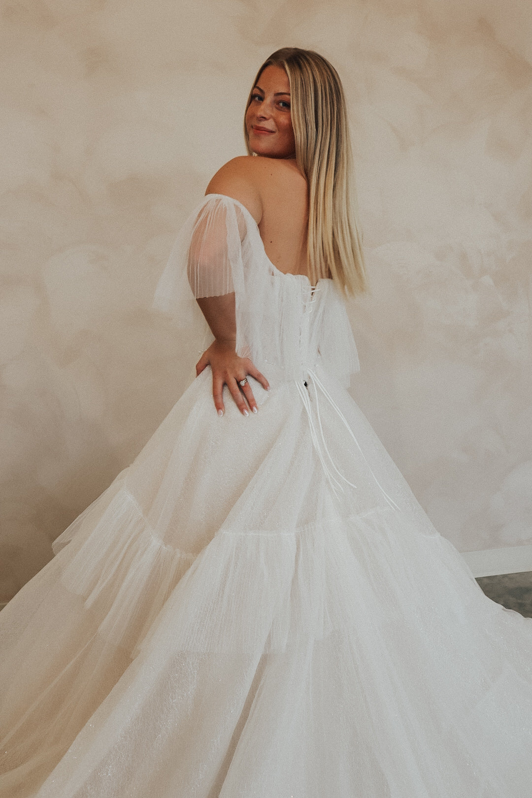 Introducing "Aspen" - the dress for the bride who wants whimsy, softness, and a little bit of magic. This tiered tulle ballgown floats with every step, designed in layers of airy, ruffled tulle that create movement and volume without feeling heavy. The bodice features a romantic draped tulle overlay with beaded detailing that subtly shimmers, and the off-the-shoulder sleeves add an ethereal, effortless feel. A lace-up back offers adjustable structure and a touch of old-world charm, while the full skirt brings the fairytale moment to life.