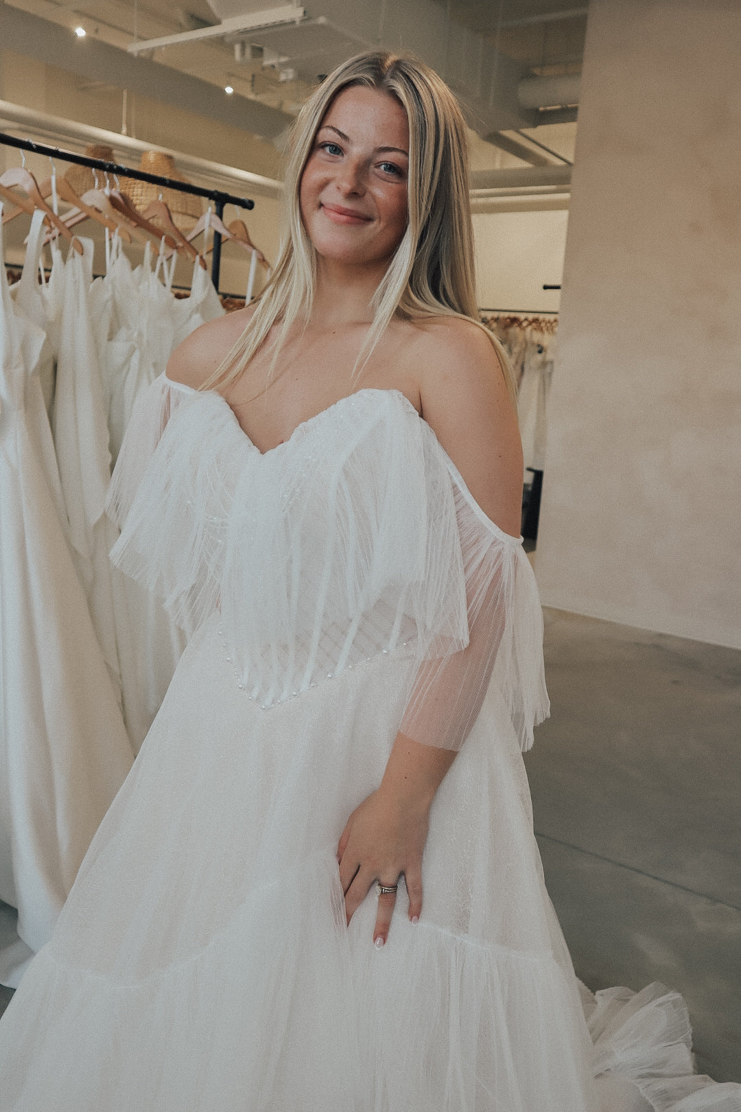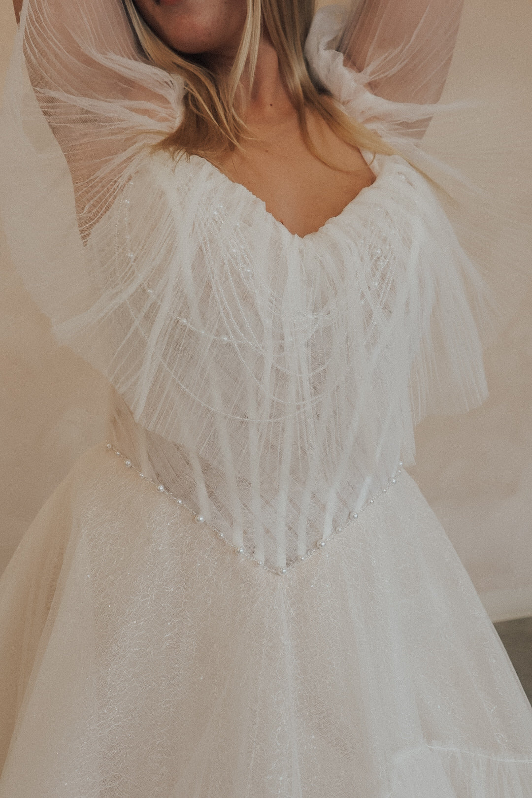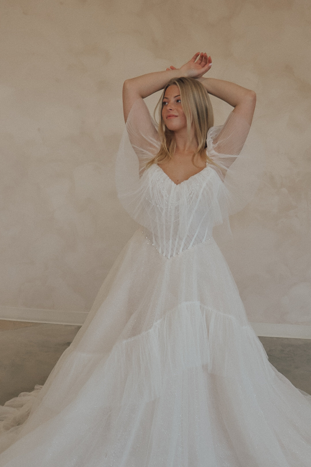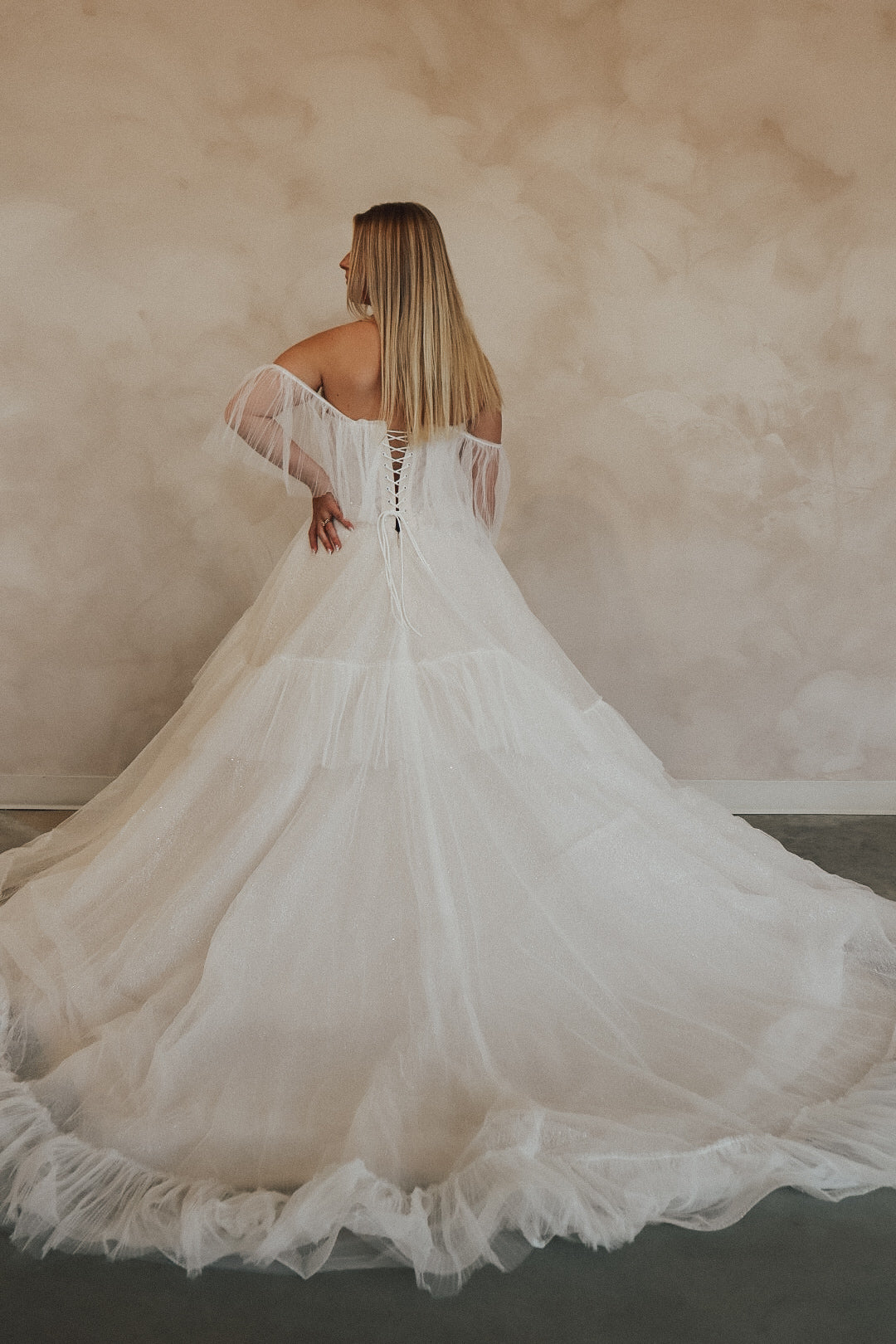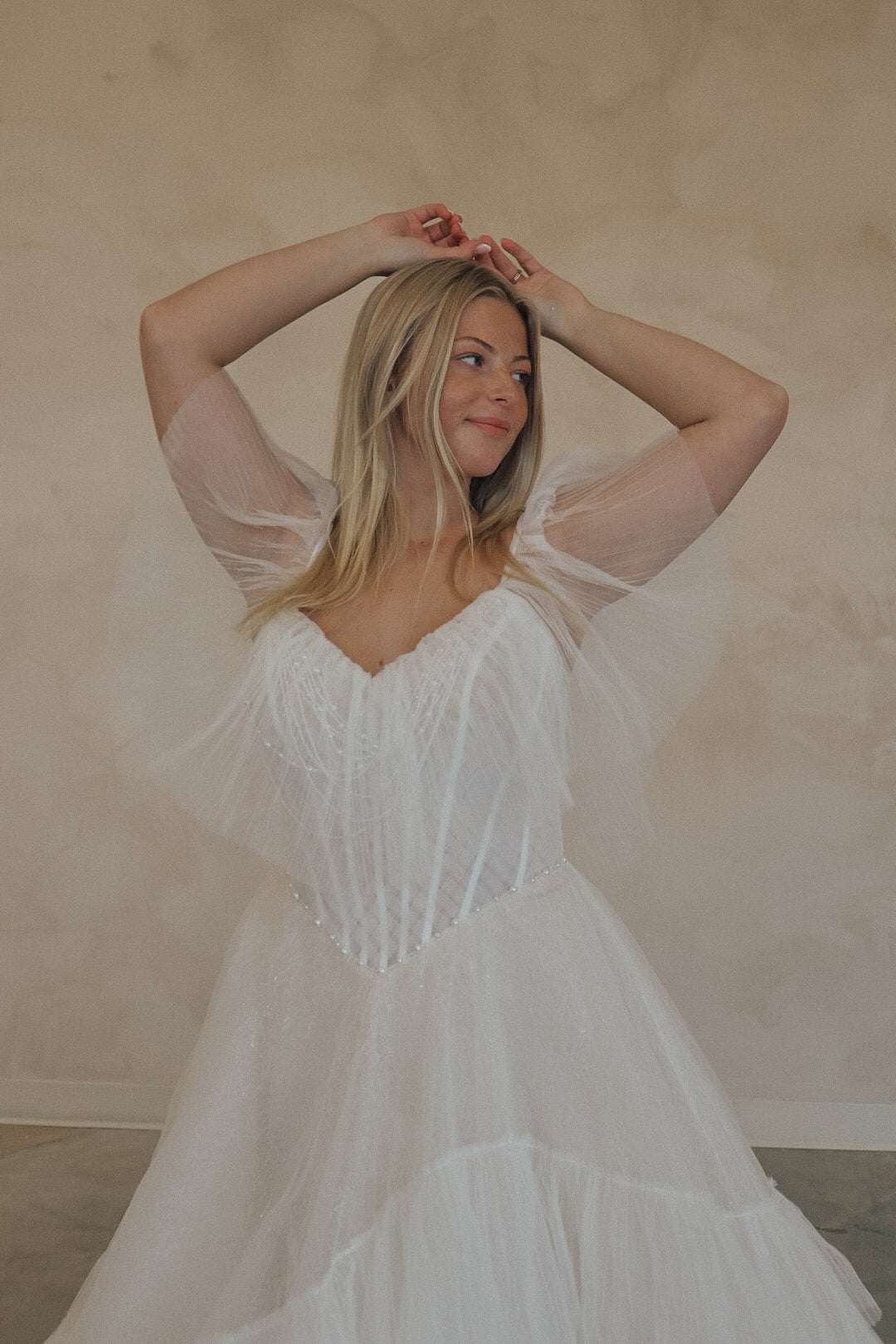 Introducing "Aspen" - the dress for the bride who wants whimsy, softness, and a little bit of magic. This tiered tulle ballgown floats with every step, designed in layers of airy, ruffled tulle that create movement and volume without feeling heavy. The bodice features a romantic draped tulle overlay with beaded detailing that subtly shimmers, and the off-the-shoulder sleeves add an ethereal, effortless feel. A lace-up back offers adjustable structure and a touch of old-world charm, while the full skirt brings the fairytale moment to life.