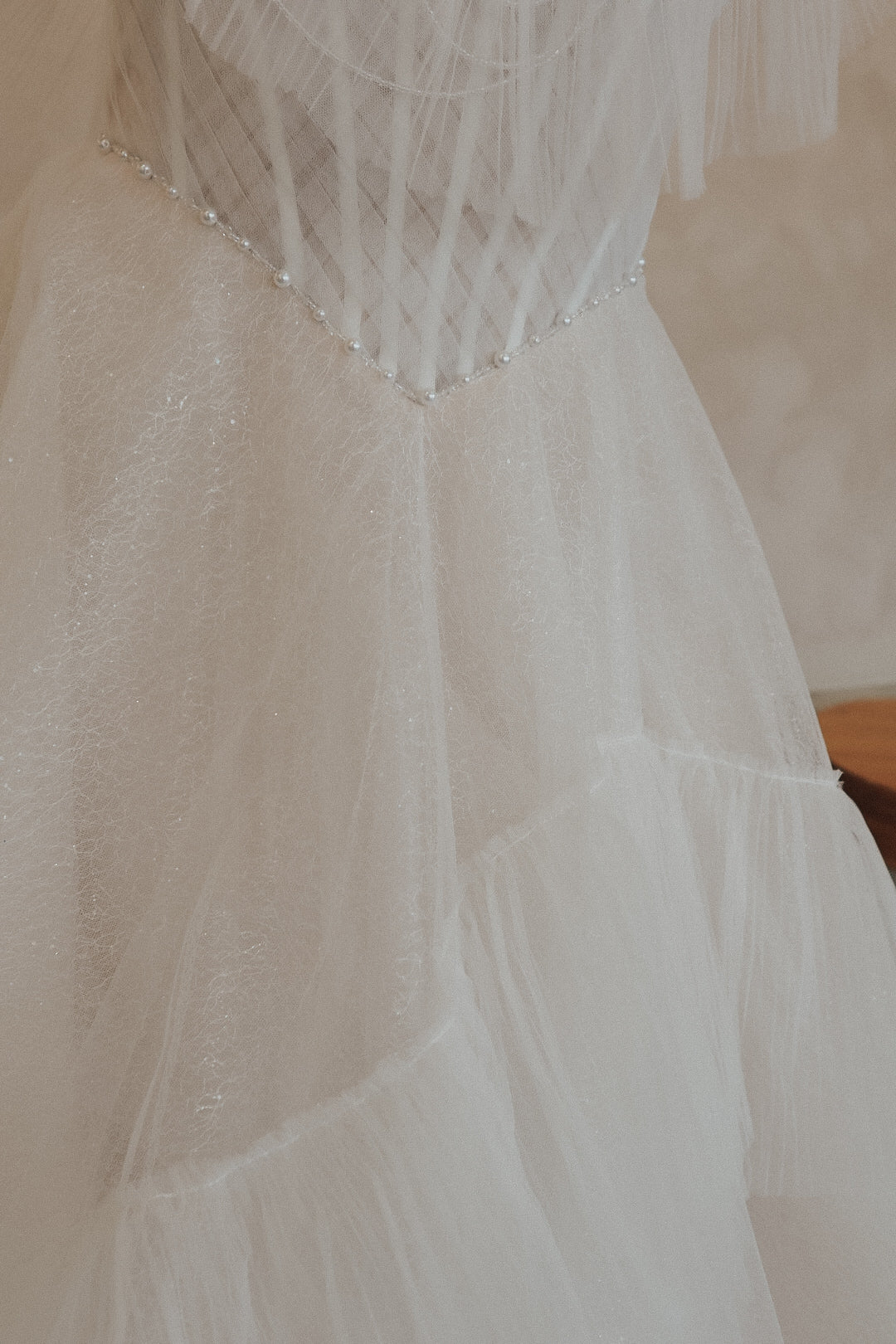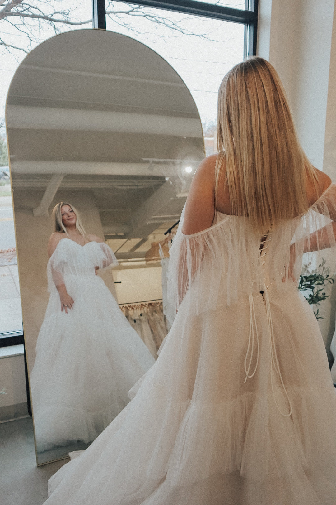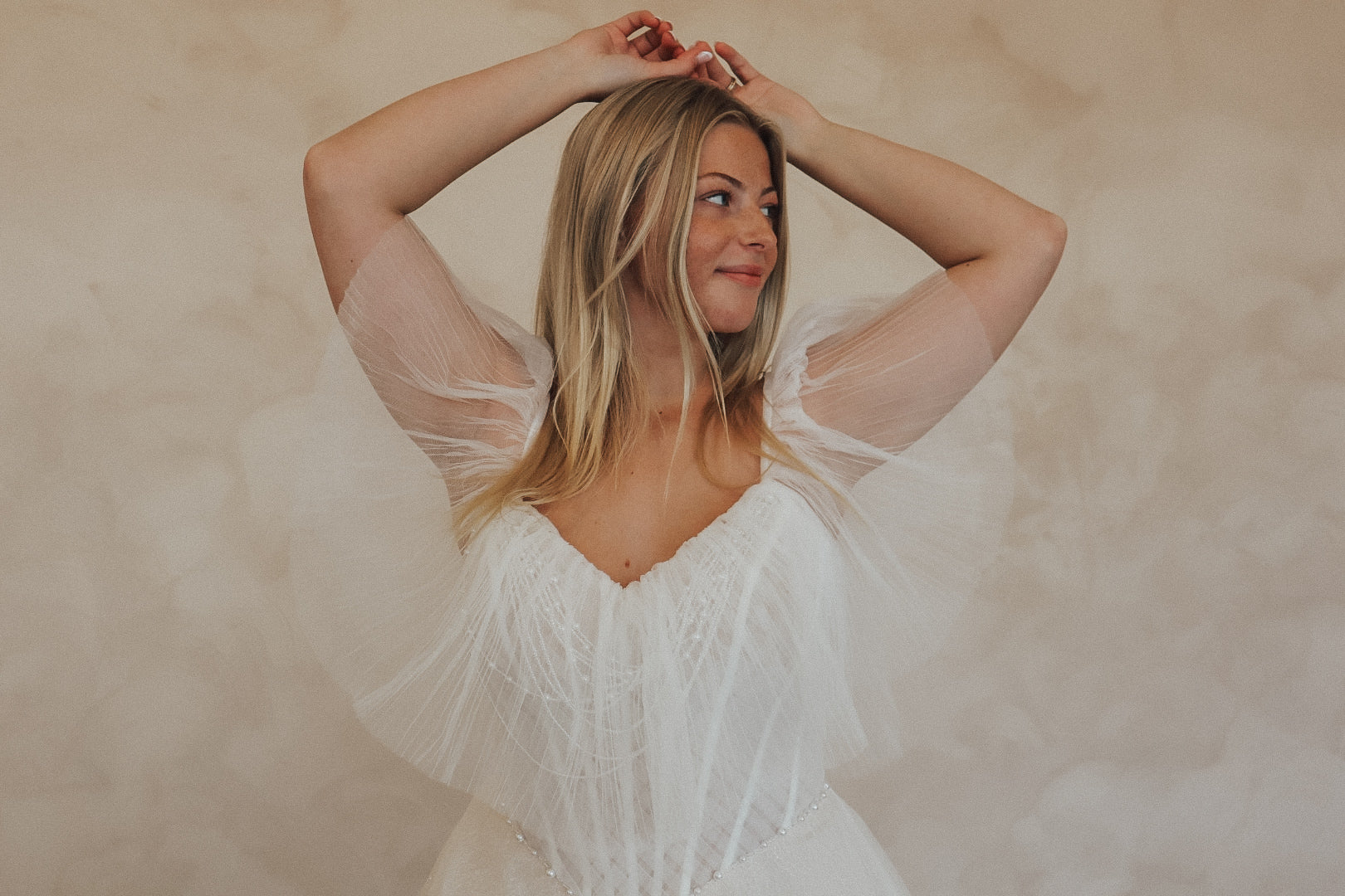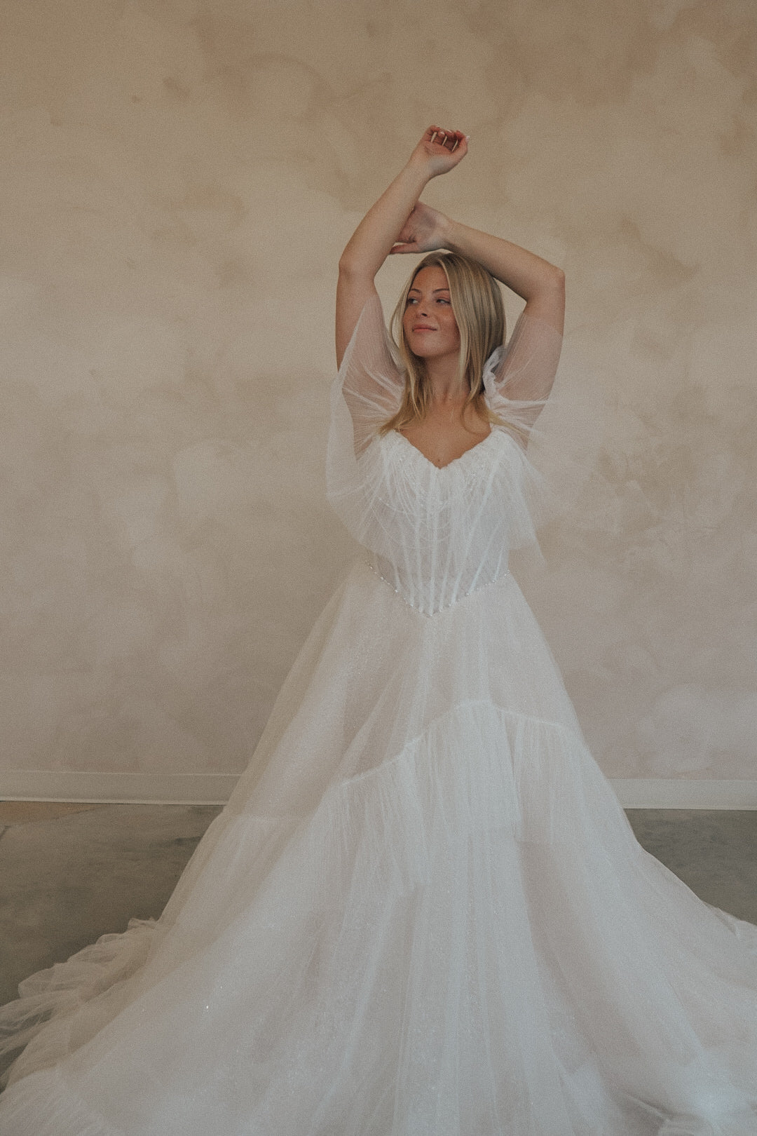 Introducing "Aspen" - the dress for the bride who wants whimsy, softness, and a little bit of magic. This tiered tulle ballgown floats with every step, designed in layers of airy, ruffled tulle that create movement and volume without feeling heavy. The bodice features a romantic draped tulle overlay with beaded detailing that subtly shimmers, and the off-the-shoulder sleeves add an ethereal, effortless feel. A lace-up back offers adjustable structure and a touch of old-world charm, while the full skirt brings the fairytale moment to life.