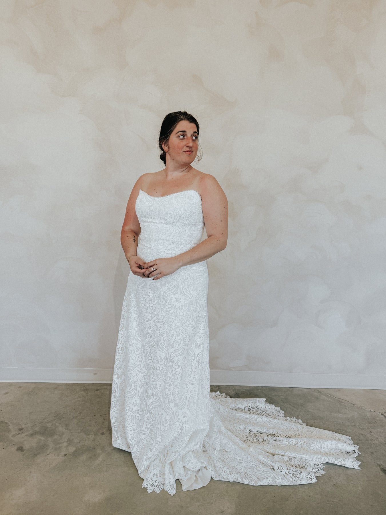 This dress is a store sample. The dress may need to be dry cleaned, or spot cleaned as it has been tried on in store. Minor repairs may be needed in alterations.