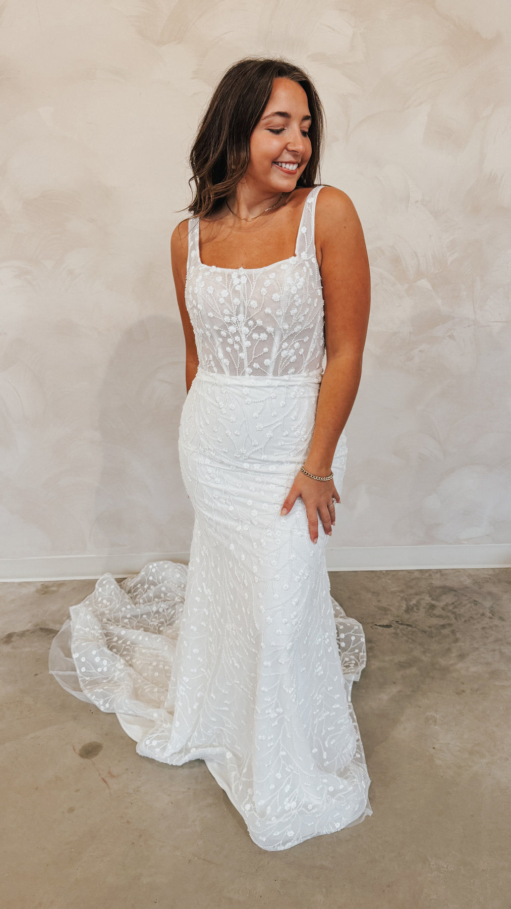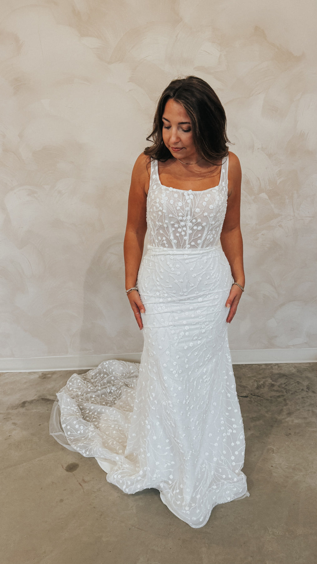 This romantic lace wedding gown features a structured square neckline and wide straps for a modern yet timeless feel. The fitted silhouette beautifully highlights the figure, while the intricate embroidered lace adds texture and dimension from top to train. A low scoop back brings a hint of allure, balanced by the gown’s elegant, refined details. Finished with a soft sweeping train, this dress is perfect for the bride who loves classic romance with a fresh, contemporary twist.