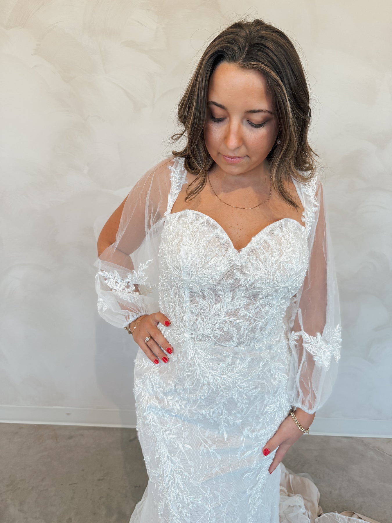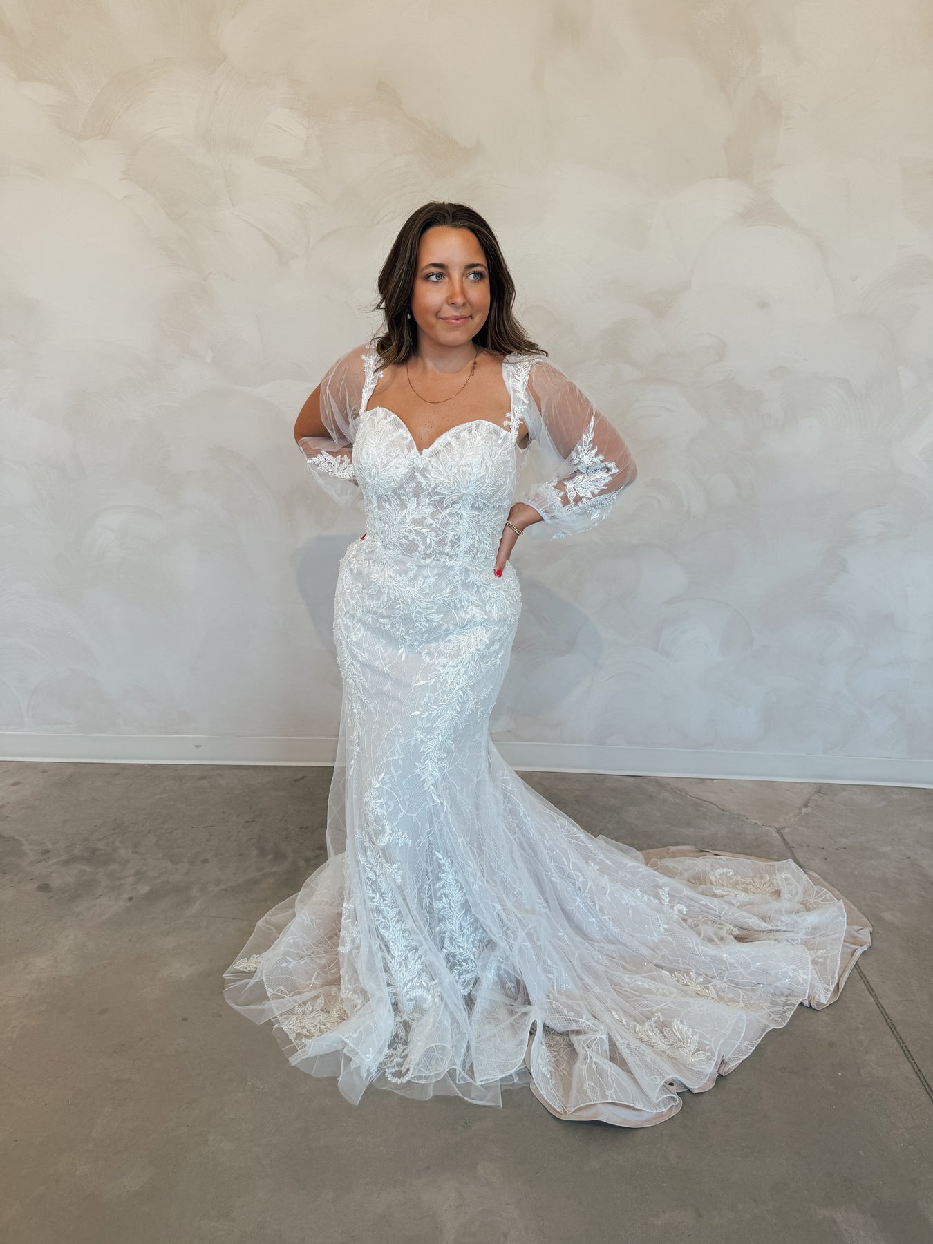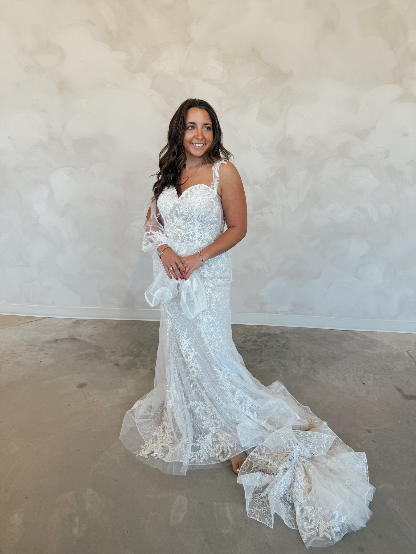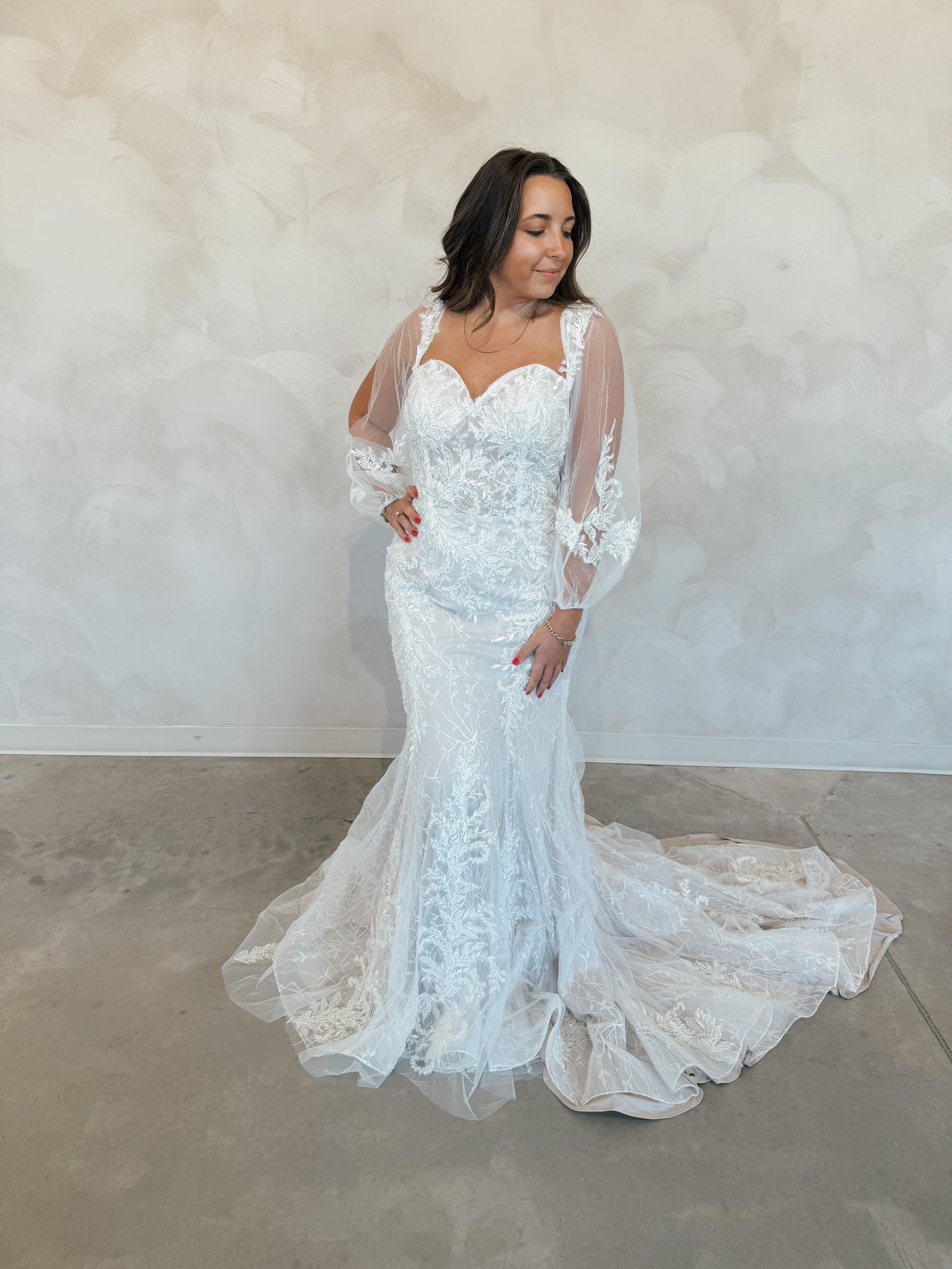 Introducing "Max," a mesmerizing wedding dress designed to captivate hearts. This fitted gown showcases exquisite all-over lace with beaded detailing, creating a shimmering effect that enhances its timeless elegance. The sweetheart neckline and open back reveal a hint of allure and sophistication, while a Chantilly lace underlay adds depth and texture to the design. The detachable sleeves reveal a stunning thick cap sleeve like strap that details the top. Completing the look is a flowing sweep train that adds a touch of romance and drama, making Max the perfect choice for the bride who dreams of a classic yet enchanting wedding day ensemble.