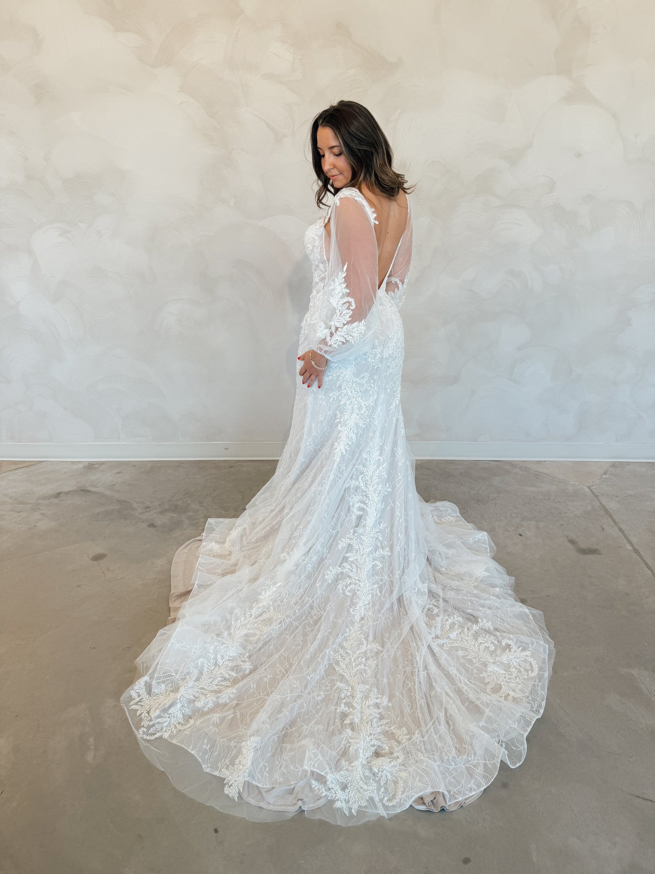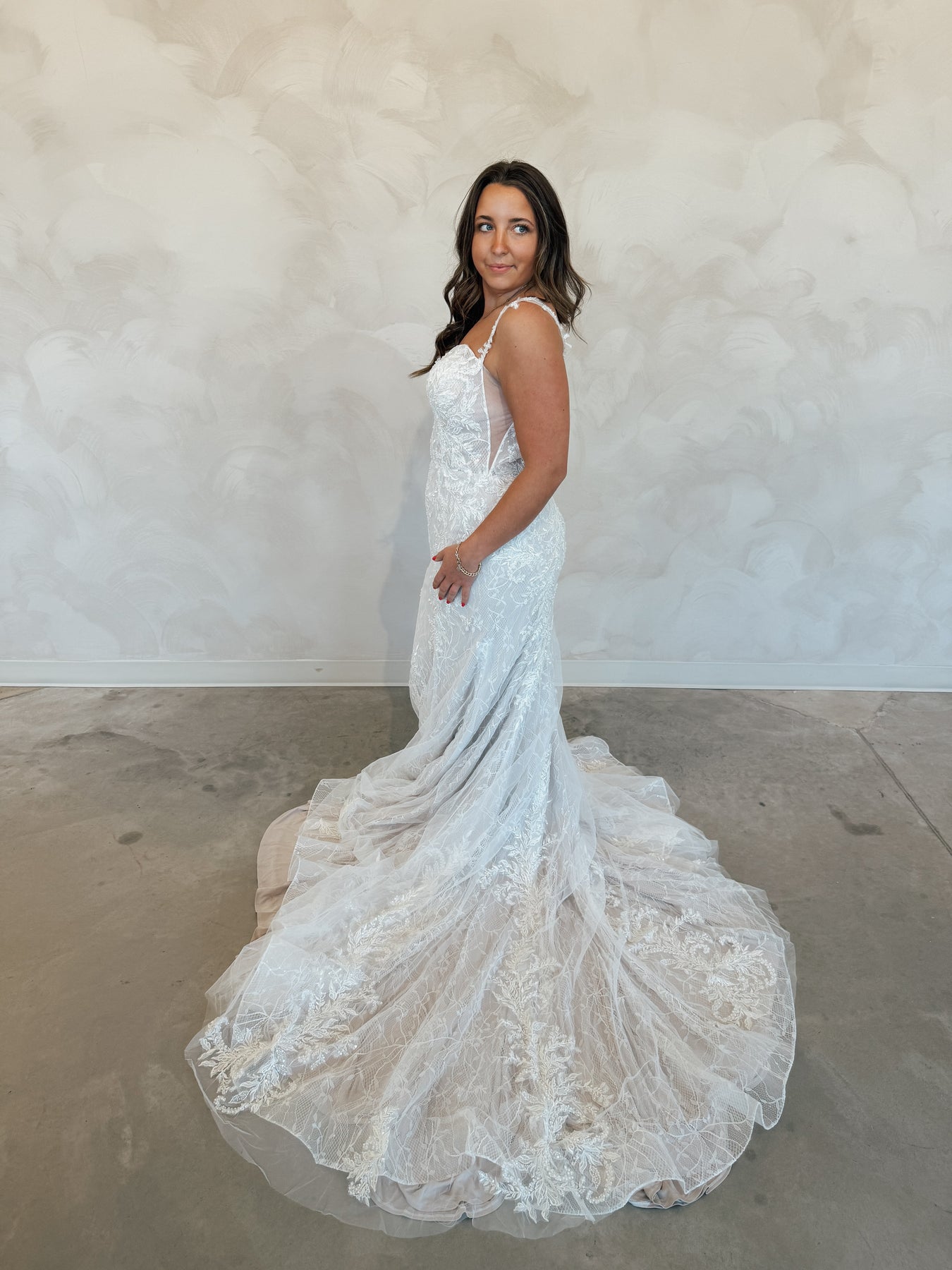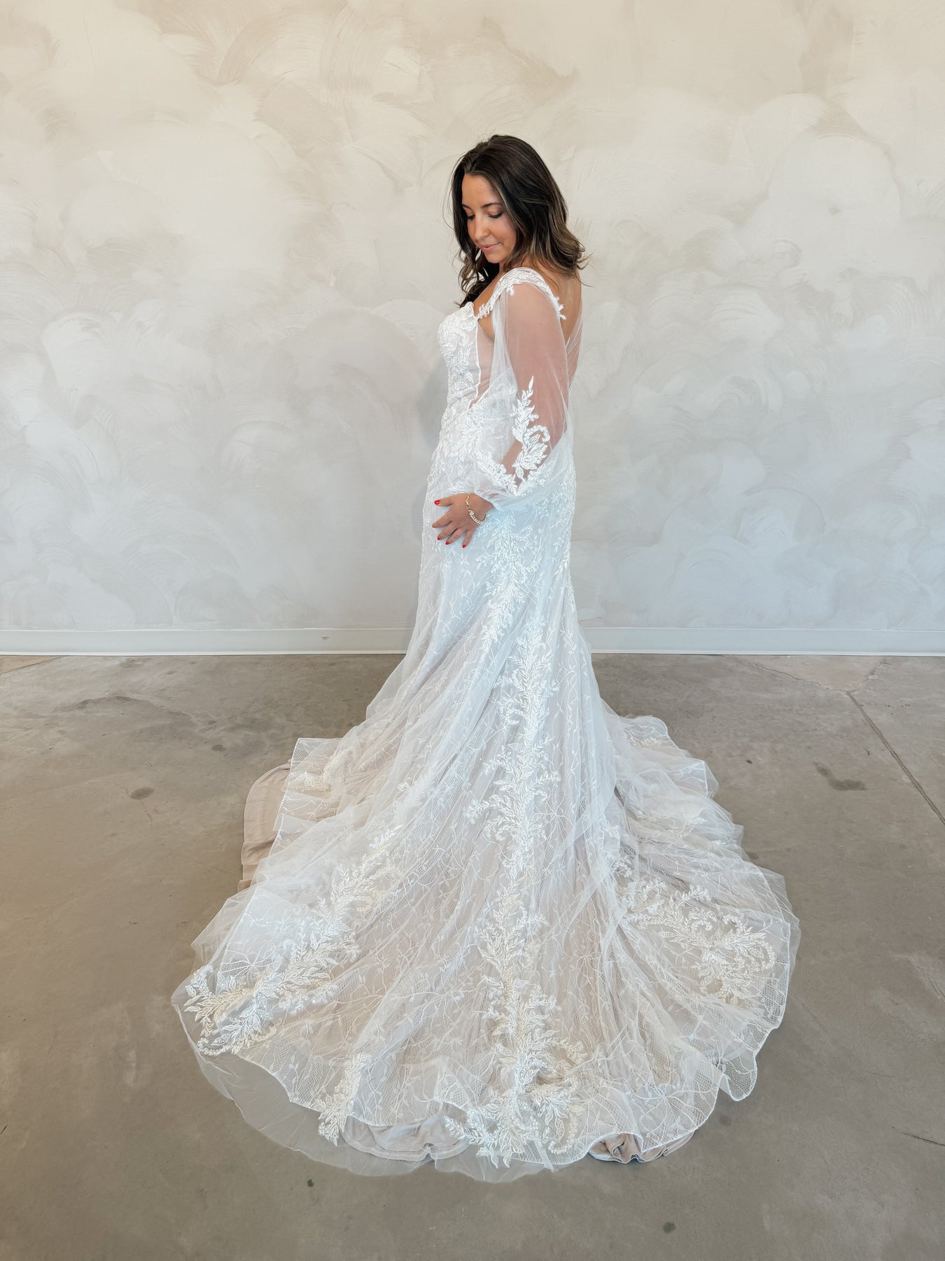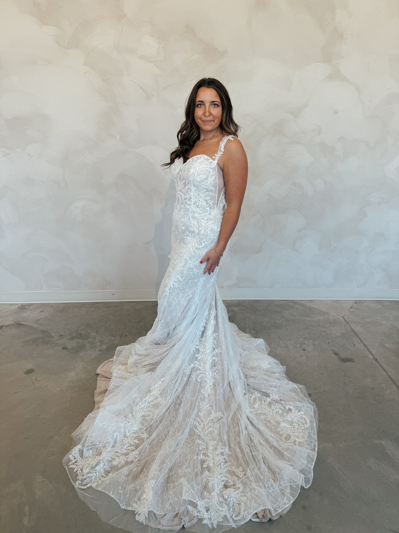 Introducing "Max," a mesmerizing wedding dress designed to captivate hearts. This fitted gown showcases exquisite all-over lace with beaded detailing, creating a shimmering effect that enhances its timeless elegance. The sweetheart neckline and open back reveal a hint of allure and sophistication, while a Chantilly lace underlay adds depth and texture to the design. The detachable sleeves reveal a stunning thick cap sleeve like strap that details the top. Completing the look is a flowing sweep train that adds a touch of romance and drama, making Max the perfect choice for the bride who dreams of a classic yet enchanting wedding day ensemble.