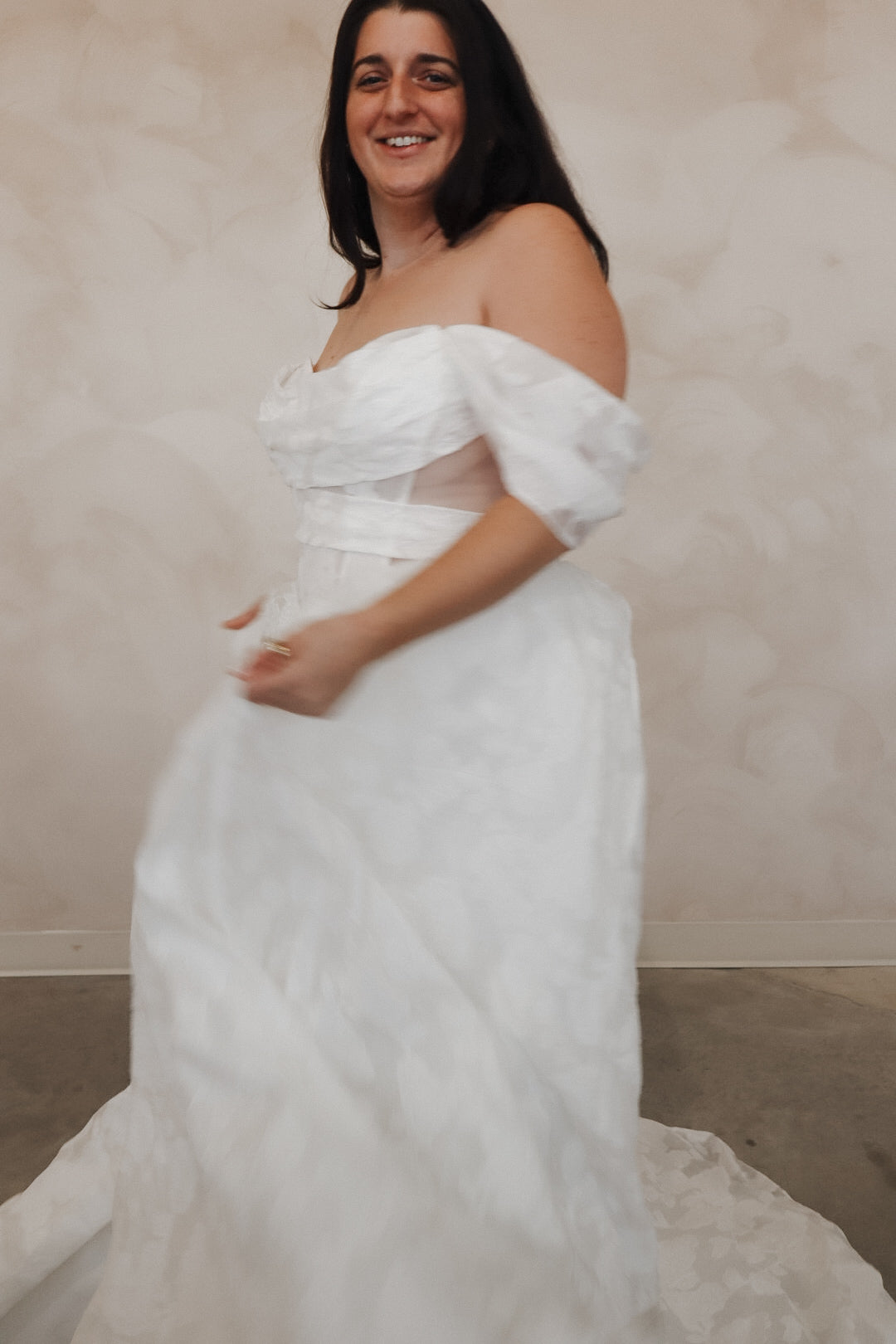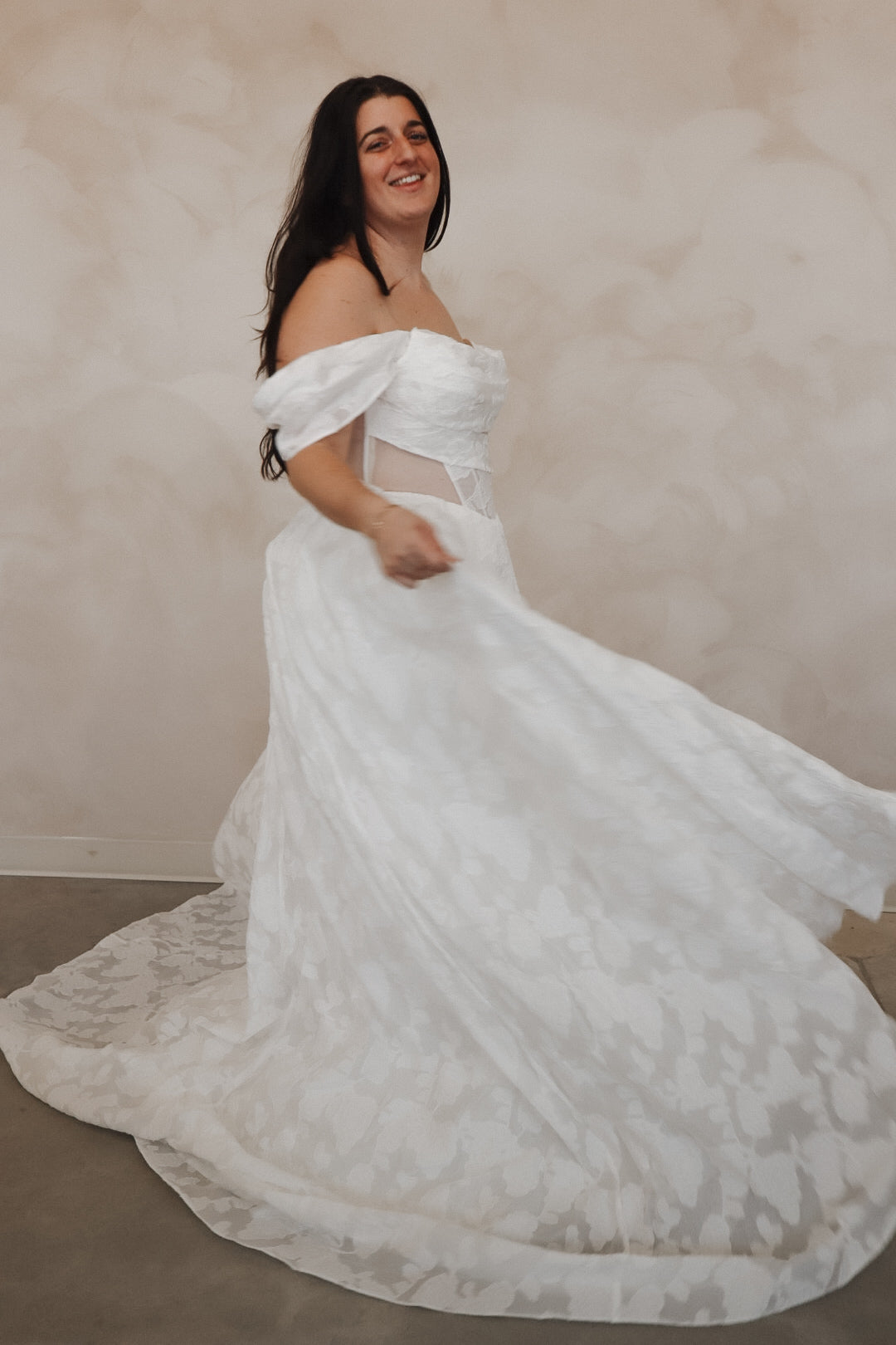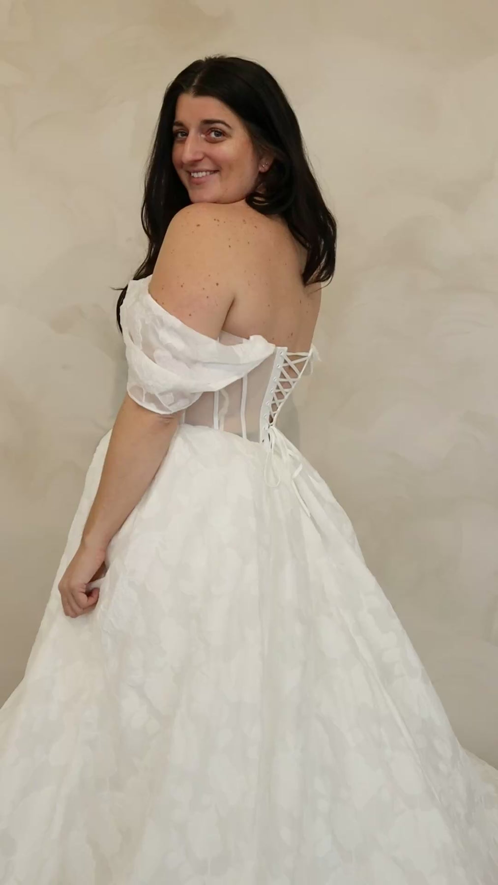 Make a statement in this breathtaking wedding gown, designed for the modern romantic. Featuring a structured Basque waistline and corset-style boning, this dress accentuates your silhouette while offering timeless elegance. The bodice is adorned with a detachable off-the-shoulder sleeve detail, allowing for a customized bridal look.