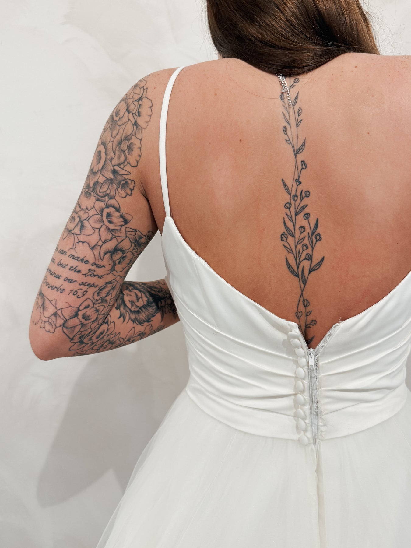 This a-line wedding dress is perfect for the bride who dreams of a classic silhouette with a fun twist. The crepe top features a v neck with ruching and thin straps. The v-back has a few buttons along the zipper. The tulle skirt is full like a ballgown silhouette with several layers.