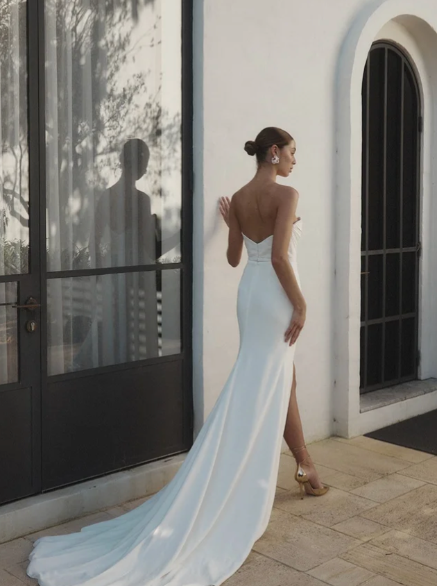 A twist on modern femininity, the Emberglow gown features a provocative high skirt slit paired with a subtle v-shaped back and draped corset bodice. Made from a rich eco-friendly Viscose Blend Crepe, this gown is for the modern bride looking for a chic and elegant look.