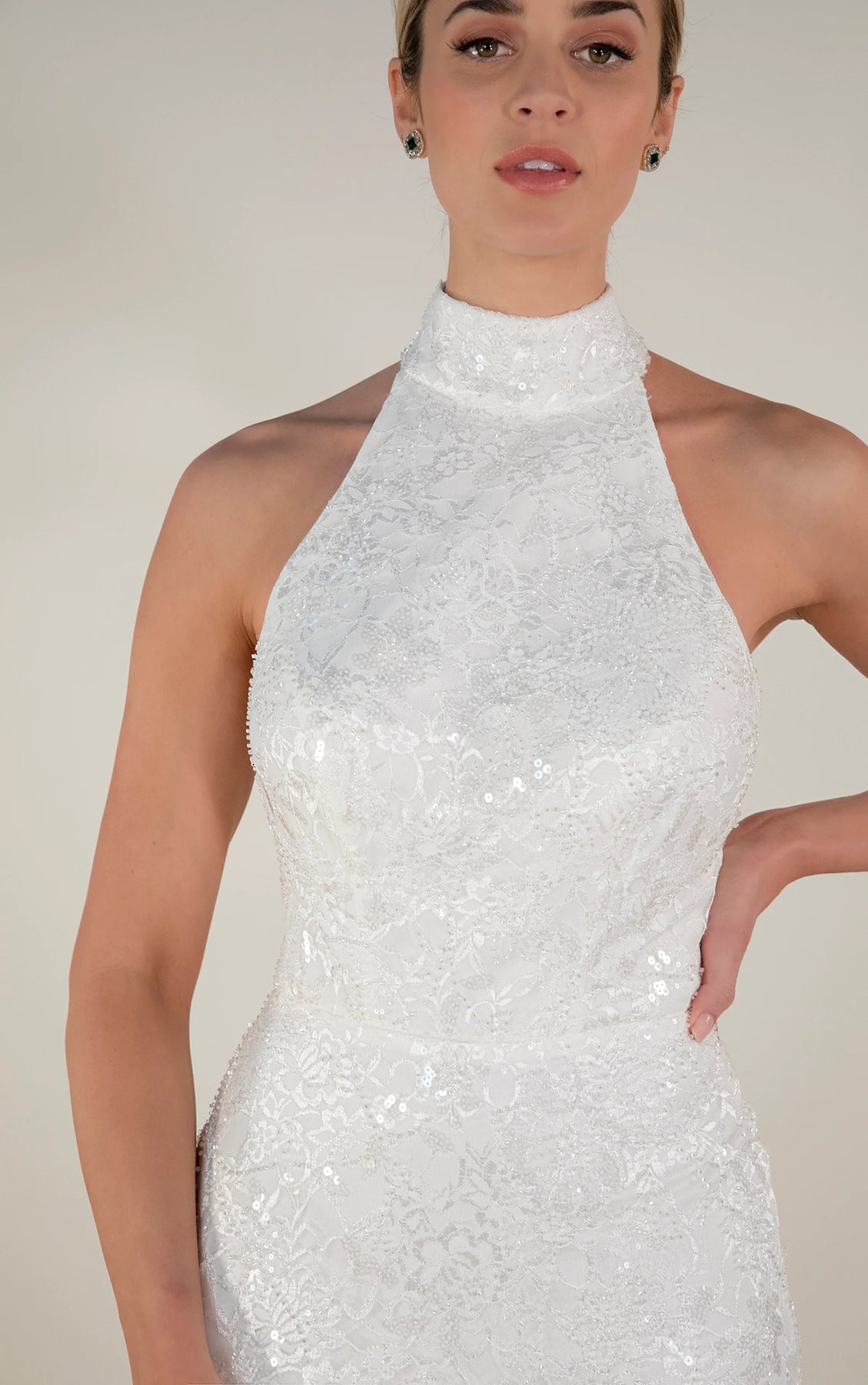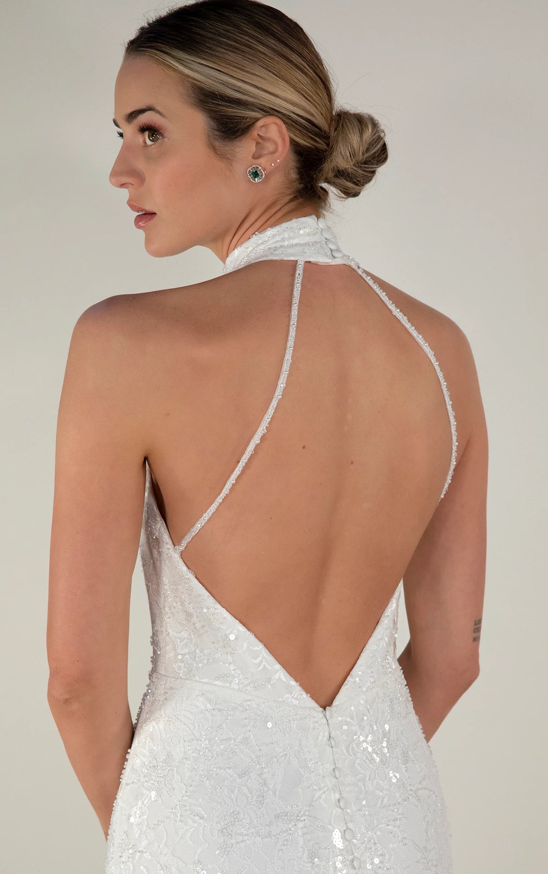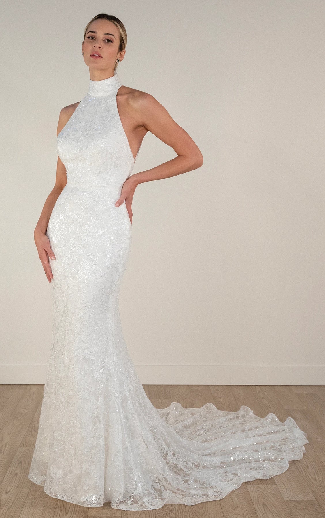 This gown features a sleek, fitted silhouette crafted from allover lace with a subtle shimmer that catches the light beautifully. The high halter neckline creates a modern, fashion-forward look while elongating the torso and shoulders. An open, low V-back adds striking contrast and a touch of sultry elegance to the otherwise clean front. The lace continues seamlessly through the hips and into a soft, sweeping train for a polished finish. Overall, the dress feels bold, refined, and contemporary—perfect for a bride who wants minimalist drama with elevated detail.