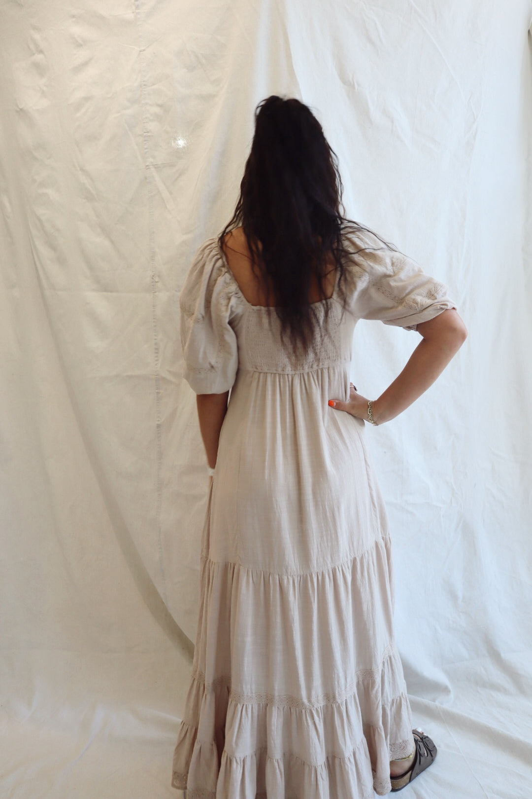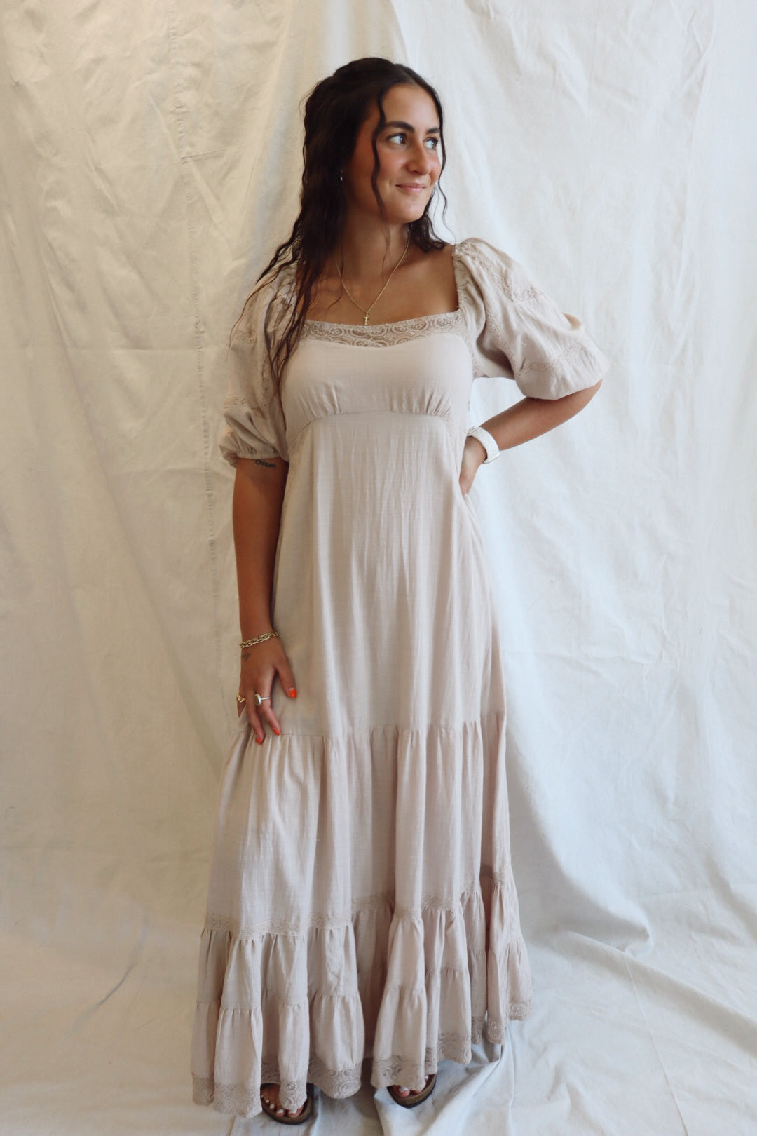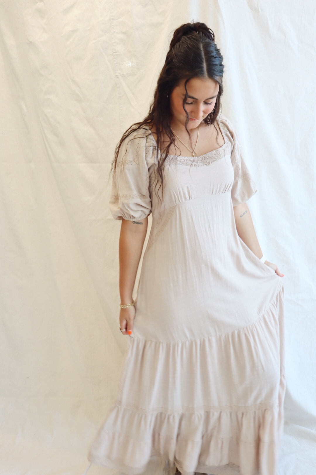 This romantic maxi dress blends effortless elegance with a soft, vintage-inspired charm. It features a flattering square neckline trimmed with delicate lace, puffed short sleeves, and a gently gathered bodice for a feminine silhouette. The tiered skirt flows gracefully with every step, while subtle crochet lace at the hem adds a touch of texture and detail. Crafted in a breathable, lightweight fabric, this piece is perfect for warm days, garden strolls, or laid-back events. Pair it with sandals or woven accessories for an easy, elevated look.