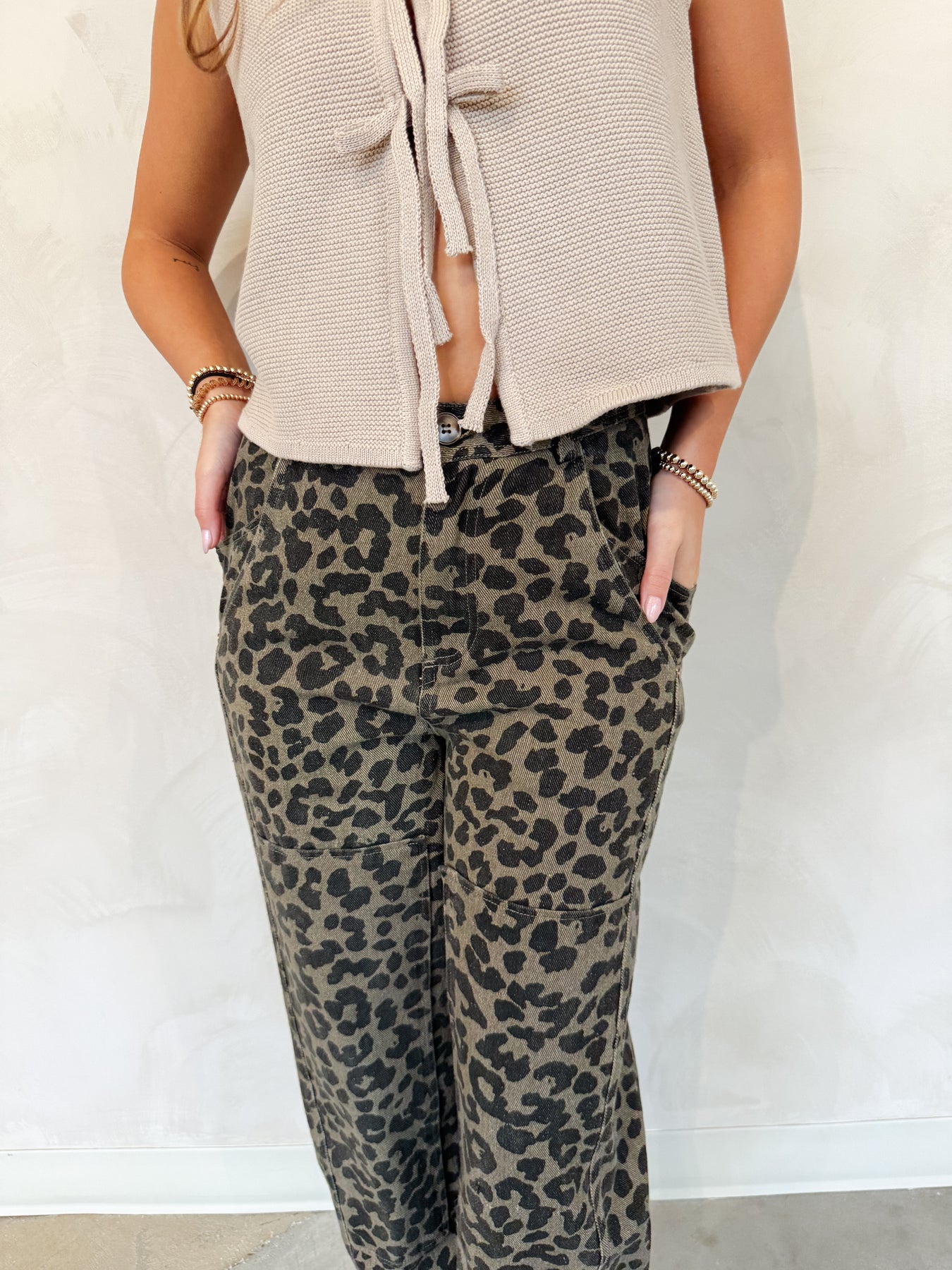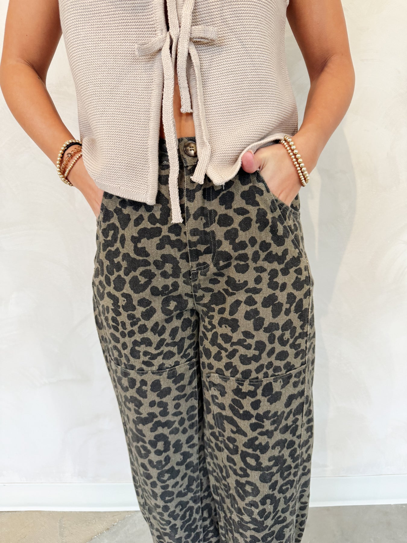 These leopard print barrel jeans with a stretchy waistband perfectly pair comfort and style. The dynamic pockets and crop leg allow for a fun, versatile pant.