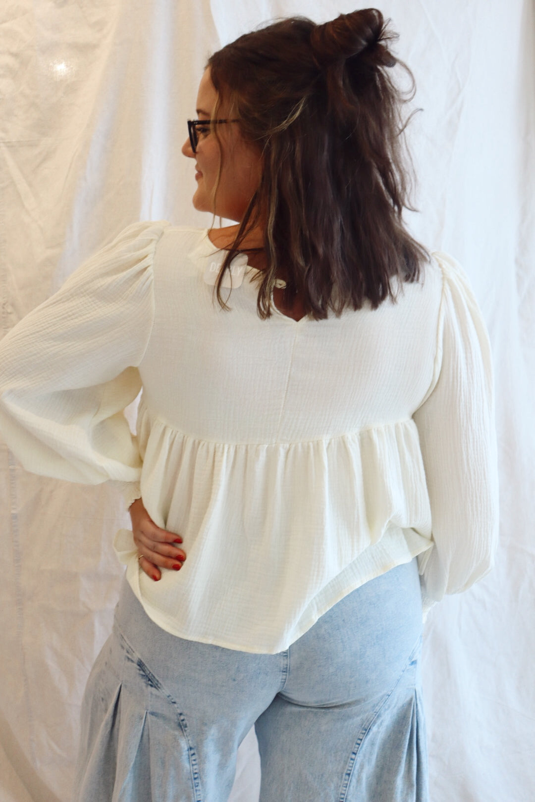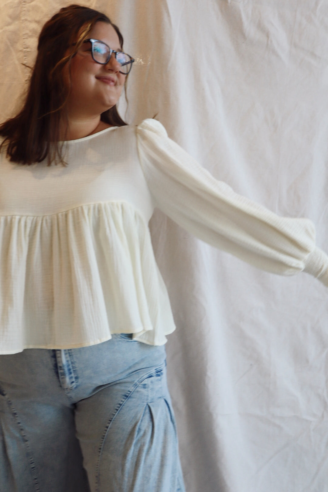 Soft, floaty, and full of charm—This top brings vintage romance to your everyday rotation. Made from a lightweight crinkled cotton gauze, this dreamy top features a gently gathered empire waist and voluminous sleeves with stretchy smocked cuffs. The flowy fit gives it that breezy, effortless feel—perfect for warm days or layering under a denim jacket at golden hour.