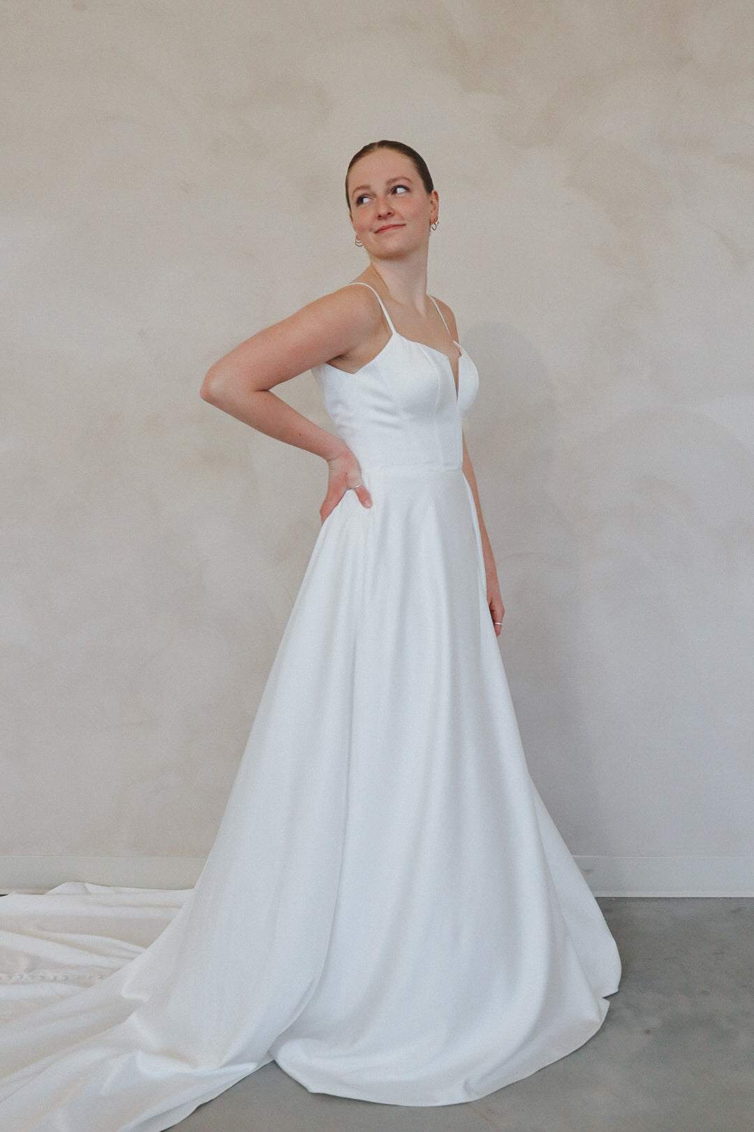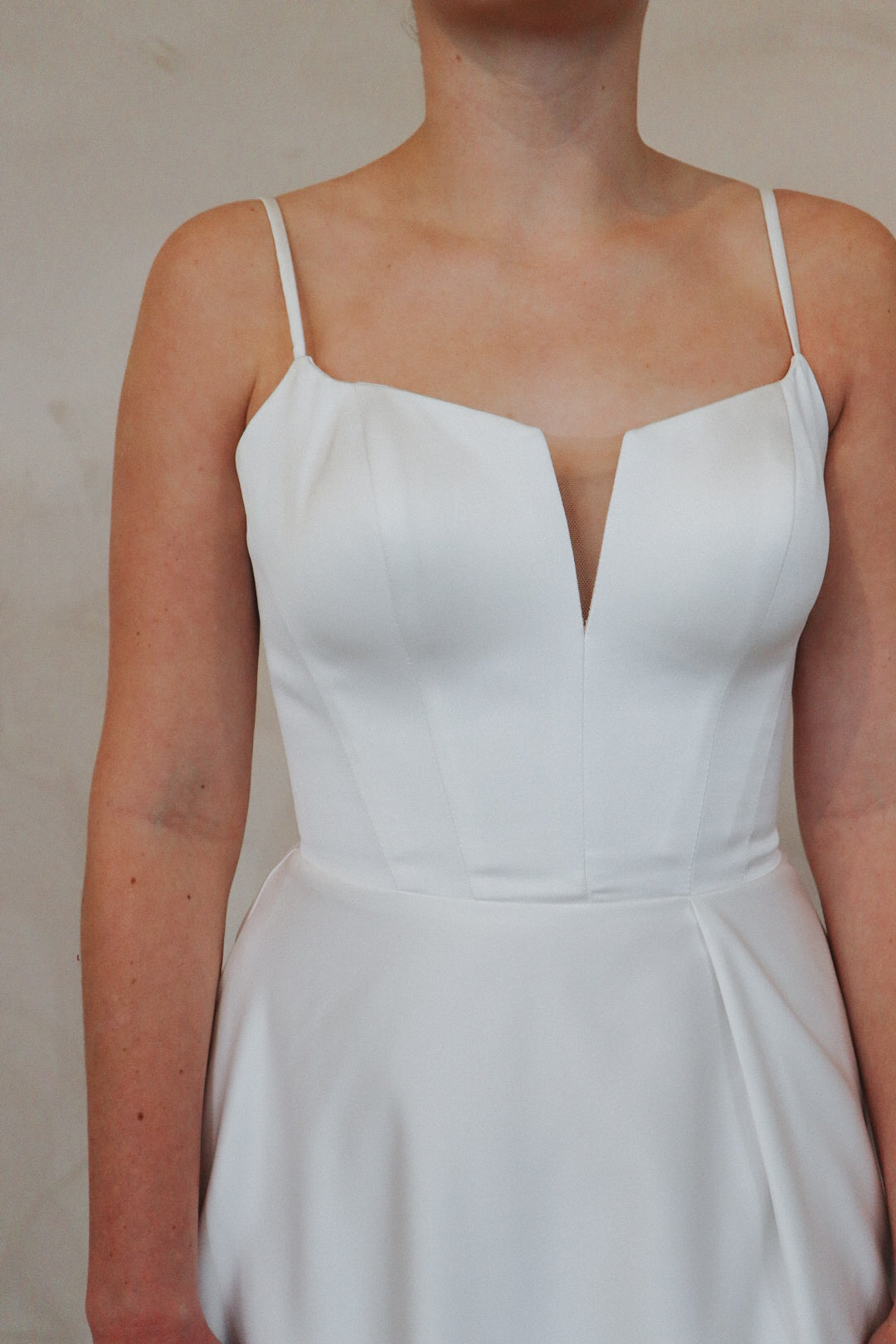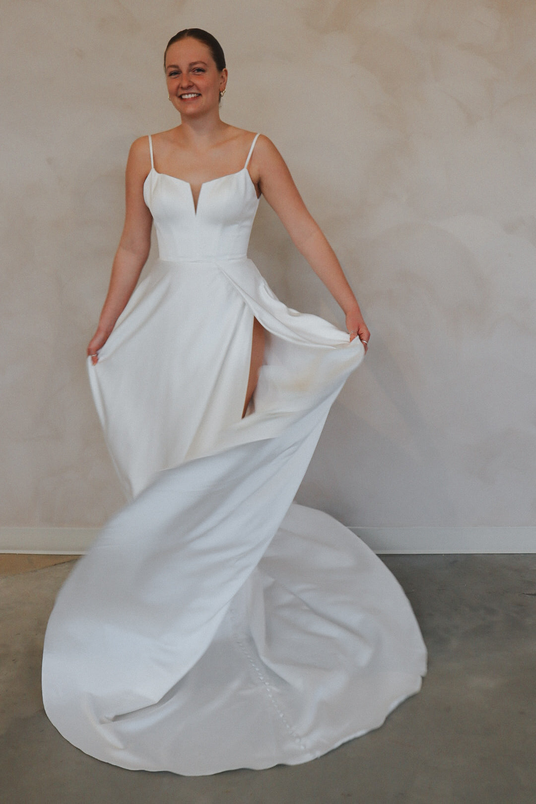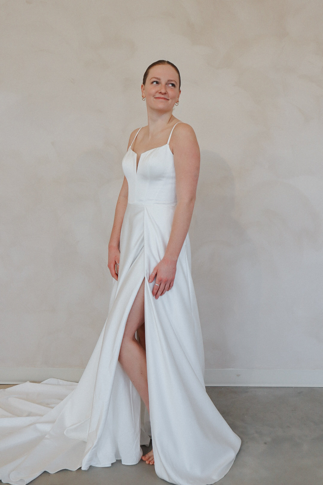 Introducing "Archer"- For the bride who's all about effortless chic, this gown is a total vibe. With sleek spaghetti straps and a flattering sweetheart neckline, it's got that perfect mix of elegance and edge. The standout thigh-high slit adds a daring touch, while the flowy A-line skirt keeps it soft and dreamy. Whether you're going for a modern vibe or something with a little extra flair, this dress is the one that’ll have all eyes on you. Classic white, but with a twist—because who says bridal can’t be bold?
