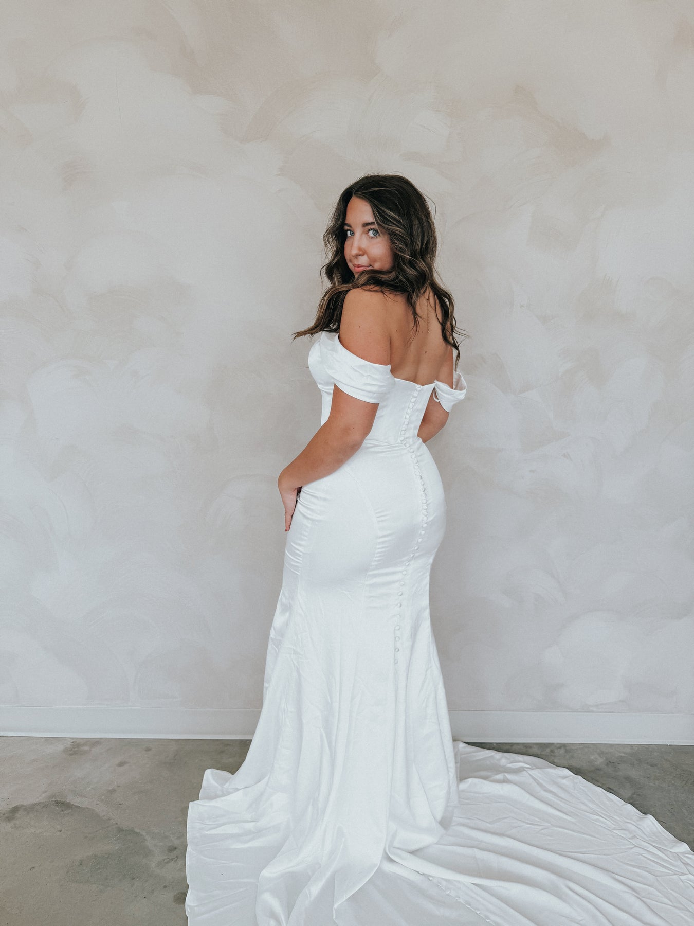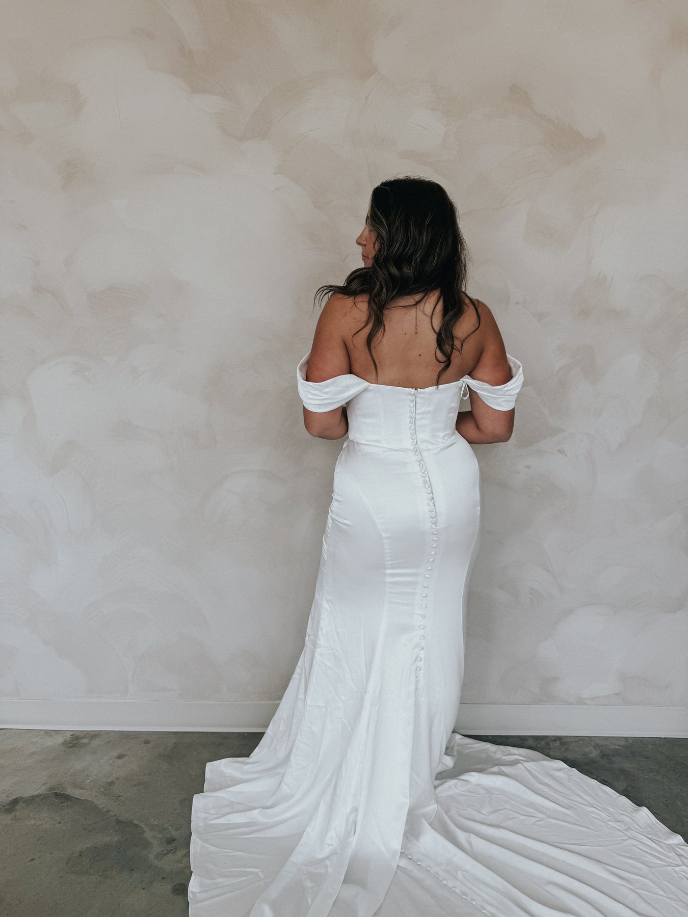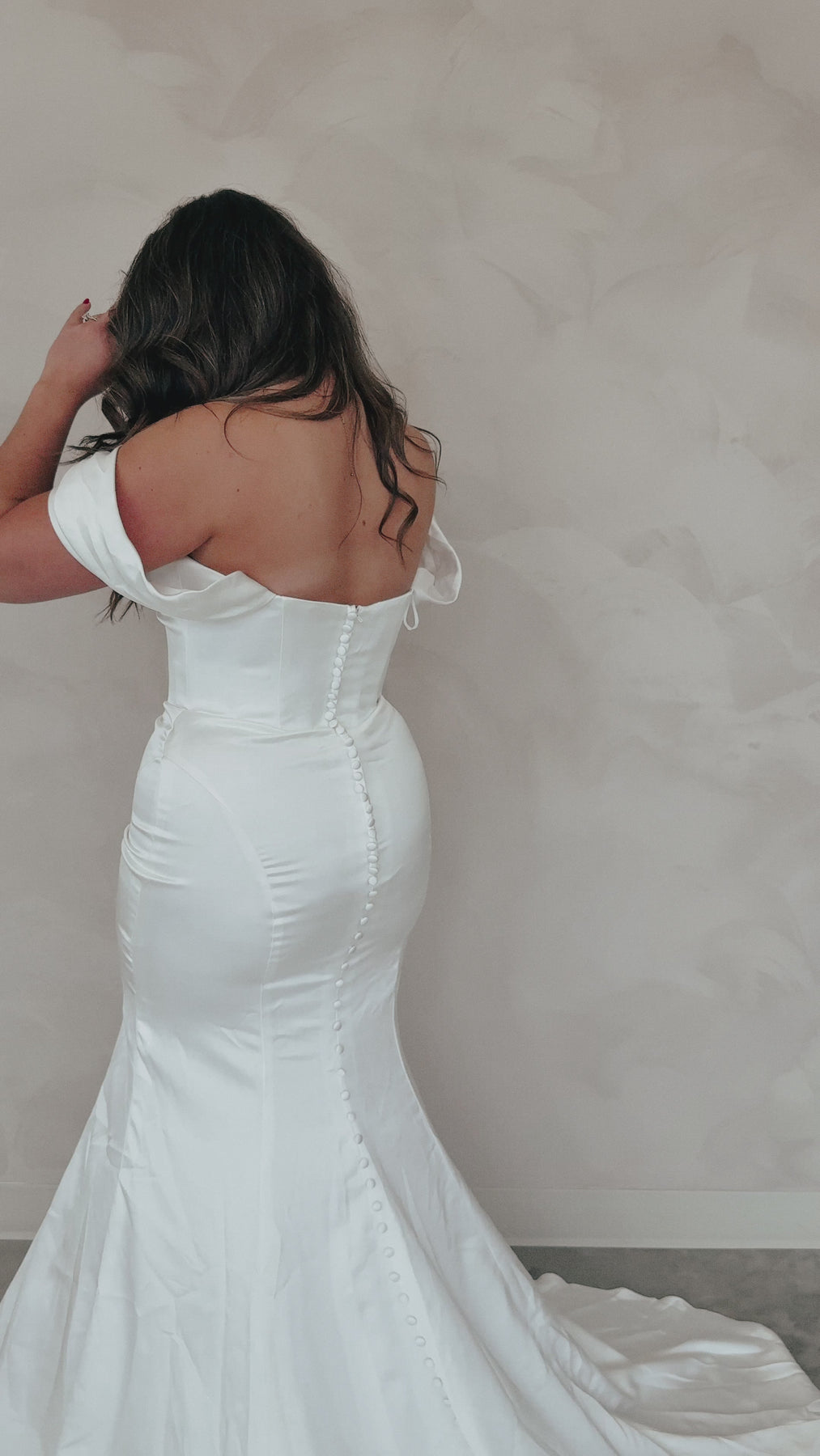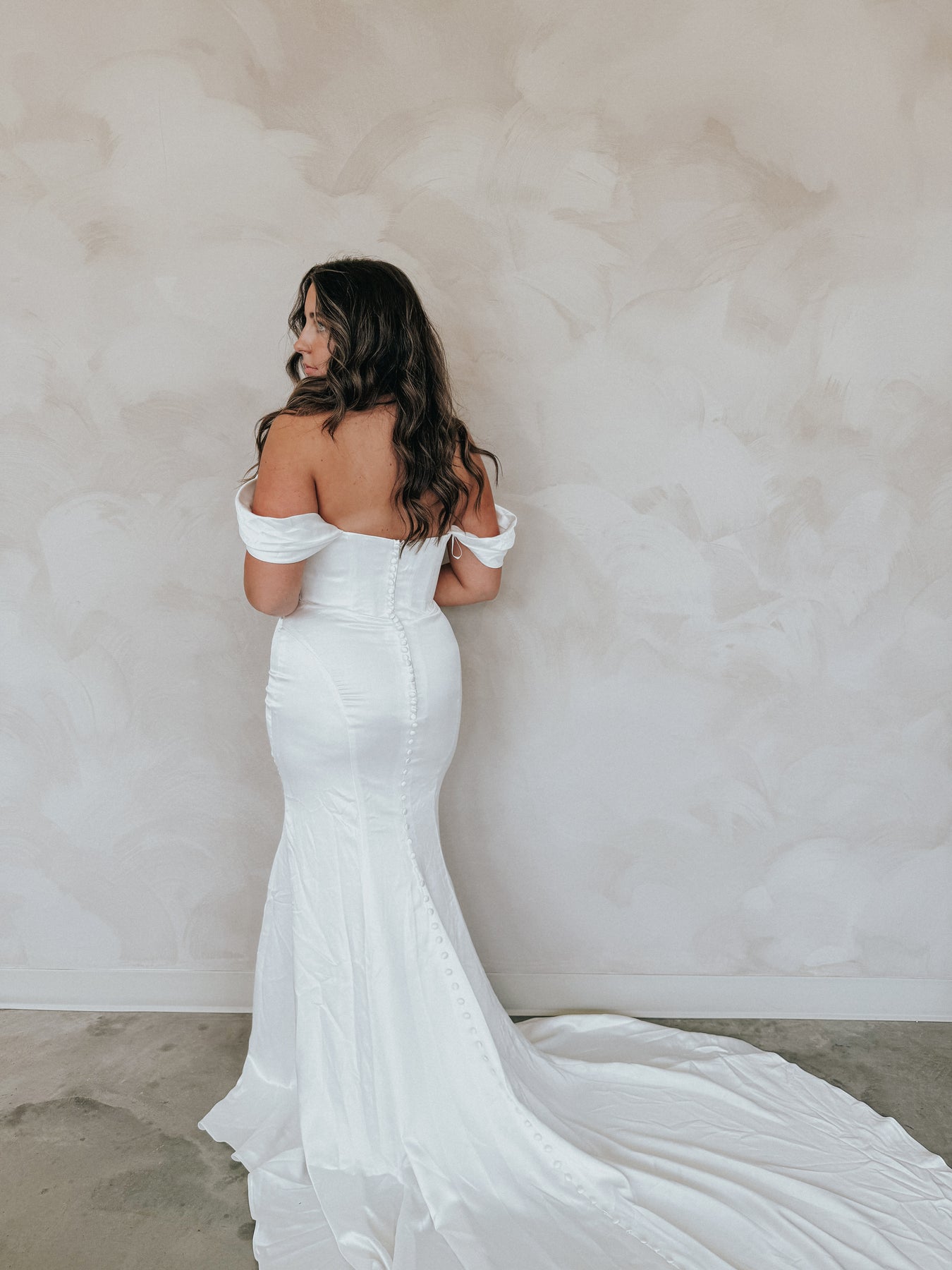 Introducing "Berkley" is a timeless off-the-shoulder silhouette that blends modern elegance with classic romance. Crafted in sleek satin, this gown features a structured bodice that flatters the figure and flows into a gently flared skirt with a sweeping chapel-length train. The soft, draped sleeves add an effortless, romantic charm, while the back is finished with a trail of delicate covered buttons for a refined, feminine touch. This design is perfect for the bride who wants to make a statement with grace and sophistication. For a more understated look, the BERKELY is also available in crepe, offering a softer texture with a beautiful matte finish.