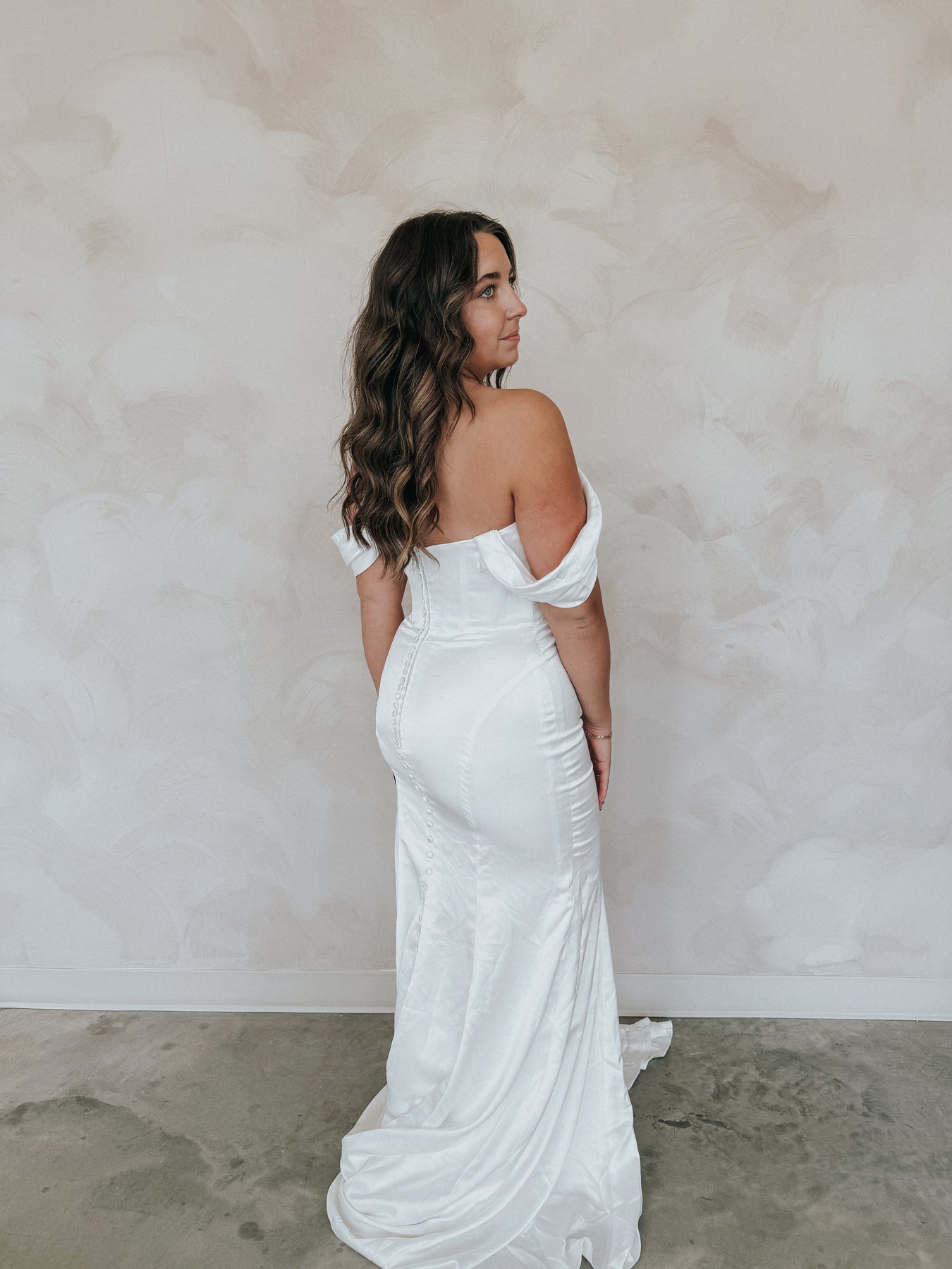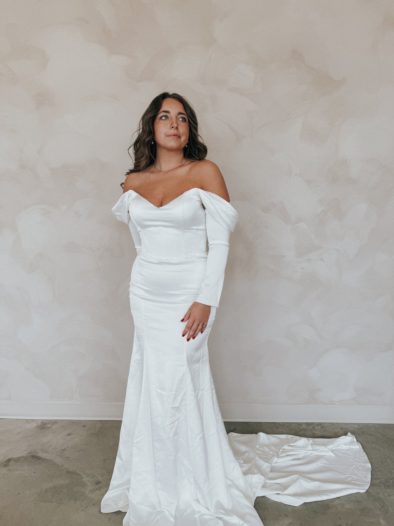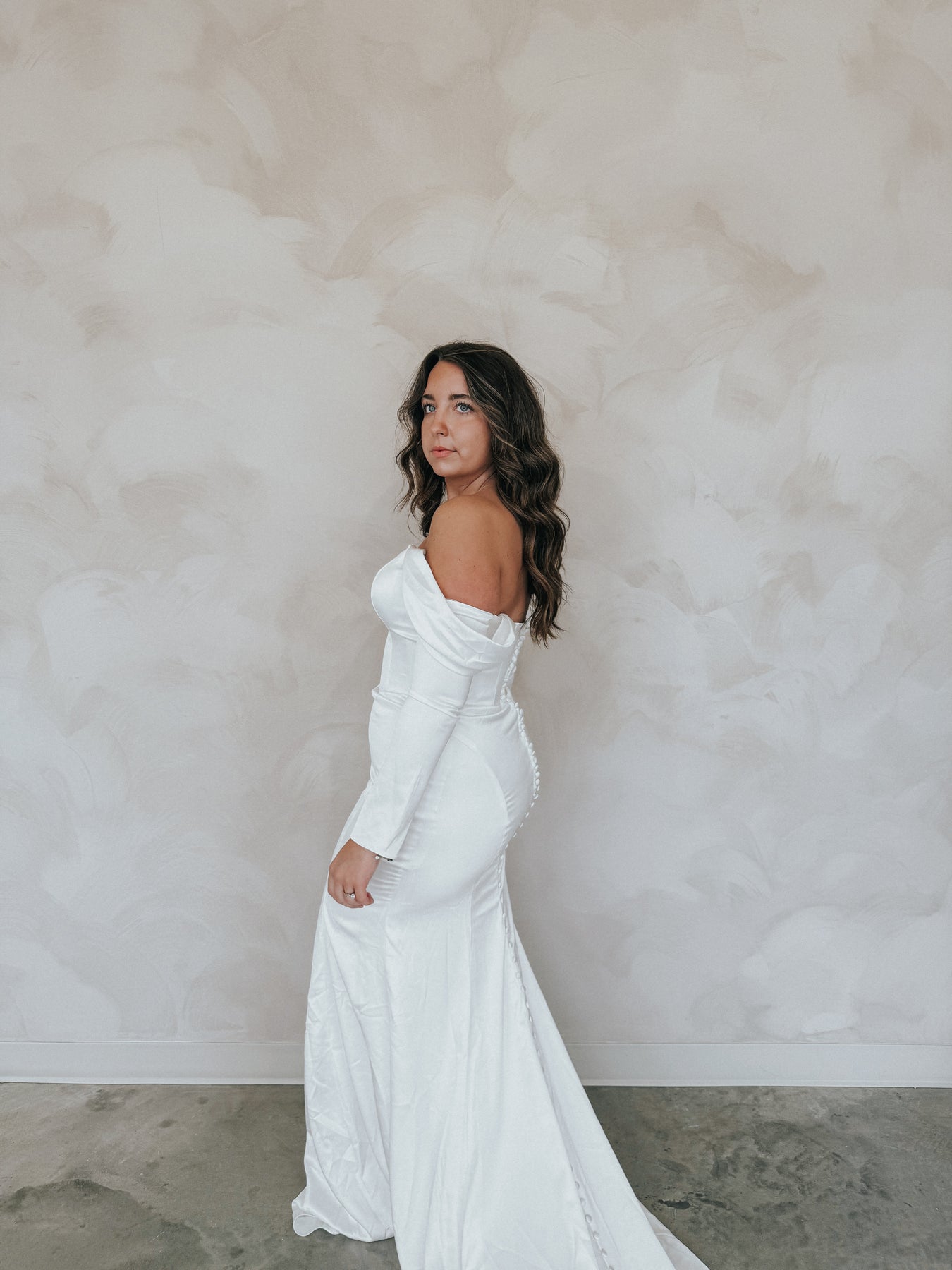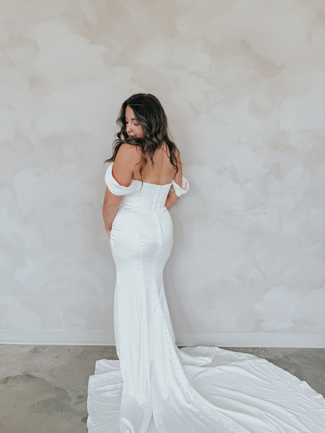 Introducing "Berkley" is a timeless off-the-shoulder silhouette that blends modern elegance with classic romance. Crafted in sleek satin, this gown features a structured bodice that flatters the figure and flows into a gently flared skirt with a sweeping chapel-length train. The soft, draped sleeves add an effortless, romantic charm, while the back is finished with a trail of delicate covered buttons for a refined, feminine touch. This design is perfect for the bride who wants to make a statement with grace and sophistication. For a more understated look, the BERKELY is also available in crepe, offering a softer texture with a beautiful matte finish.