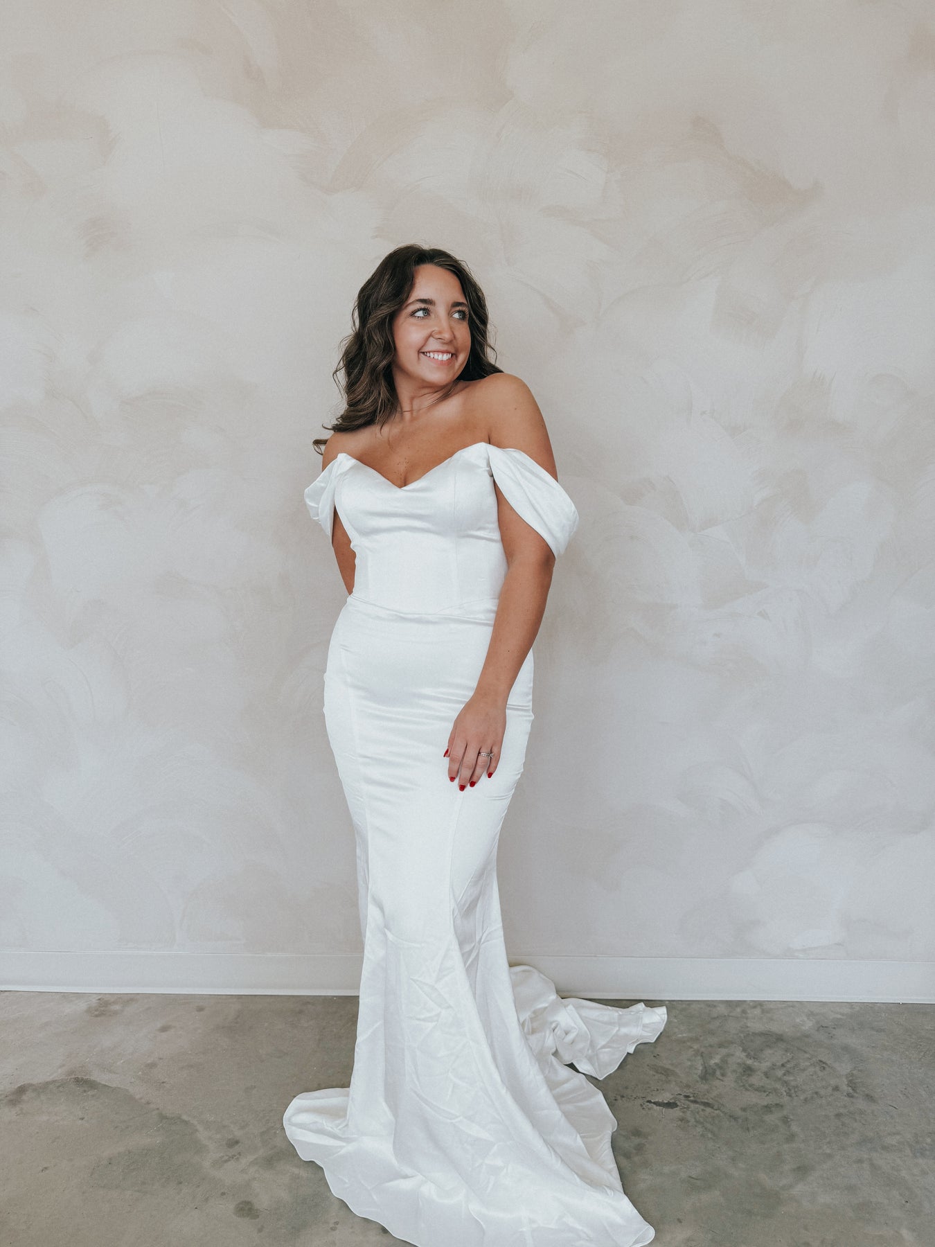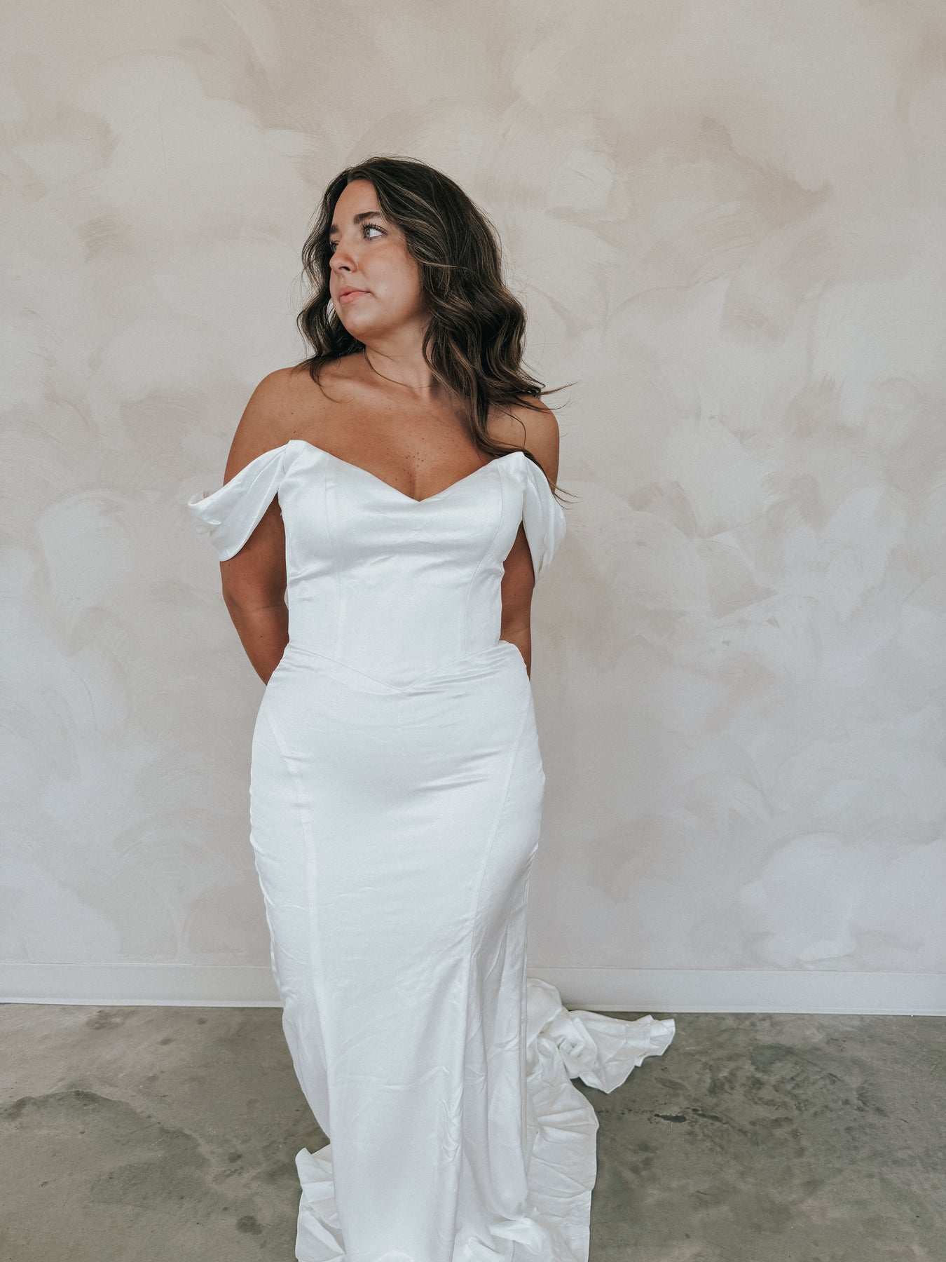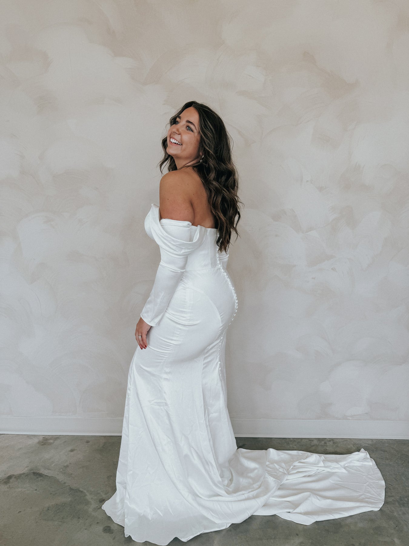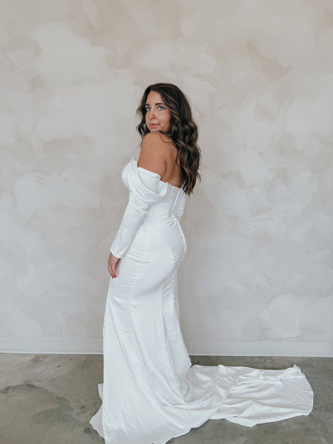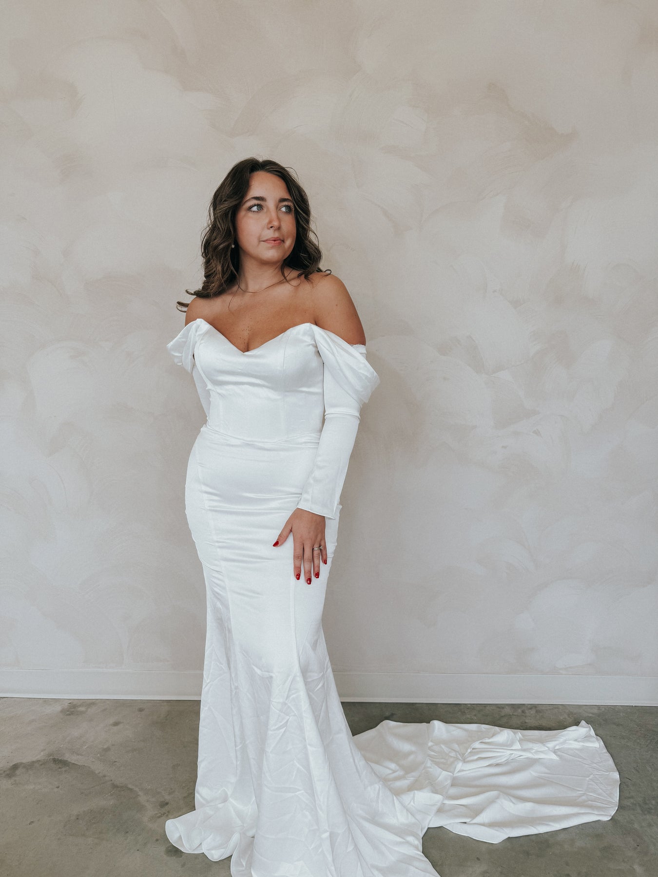 Introducing "Berkley" is a timeless off-the-shoulder silhouette that blends modern elegance with classic romance. Crafted in sleek satin, this gown features a structured bodice that flatters the figure and flows into a gently flared skirt with a sweeping chapel-length train. The soft, draped sleeves add an effortless, romantic charm, while the back is finished with a trail of delicate covered buttons for a refined, feminine touch. This design is perfect for the bride who wants to make a statement with grace and sophistication. For a more understated look, the BERKELY is also available in crepe, offering a softer texture with a beautiful matte finish.