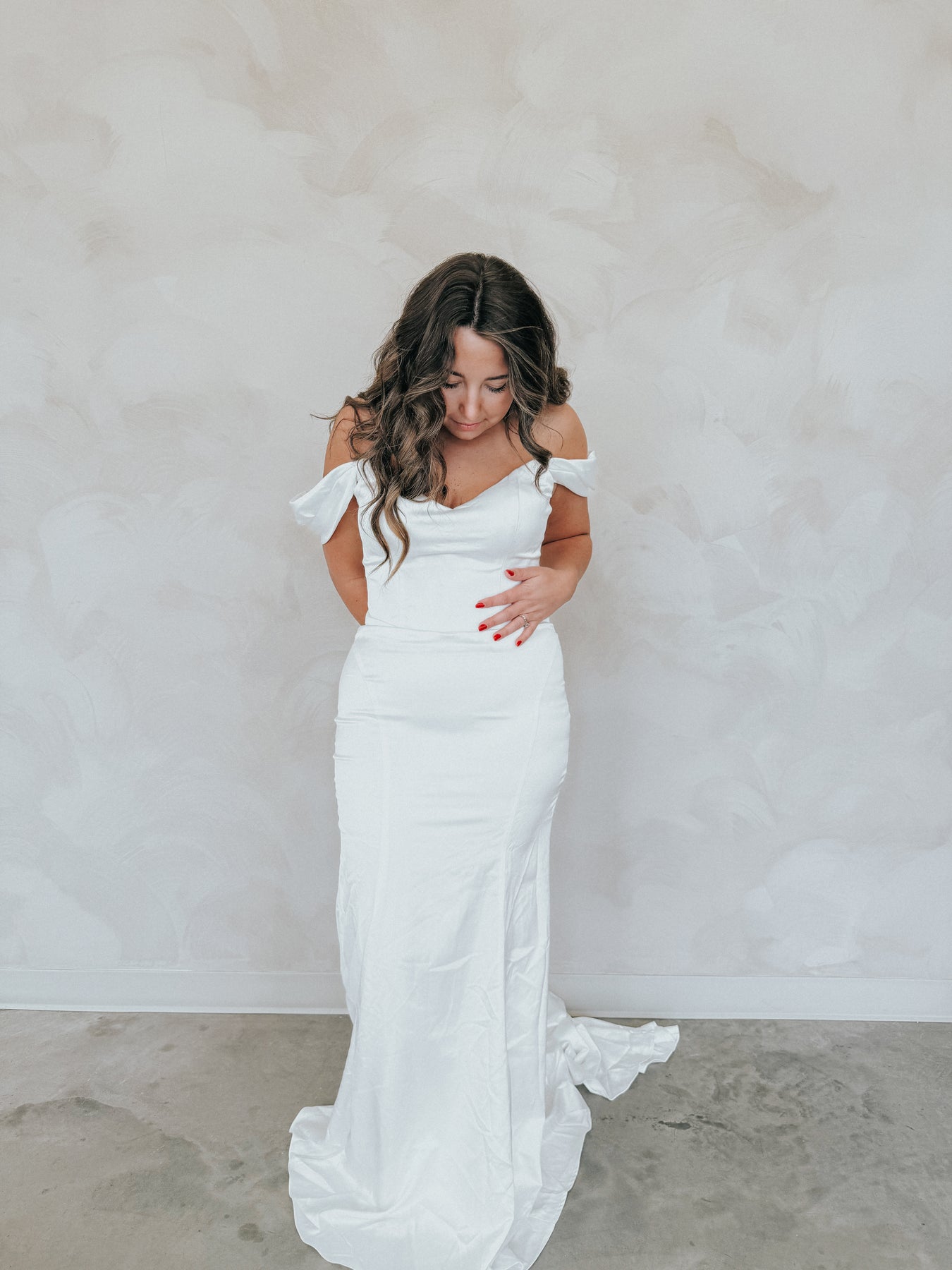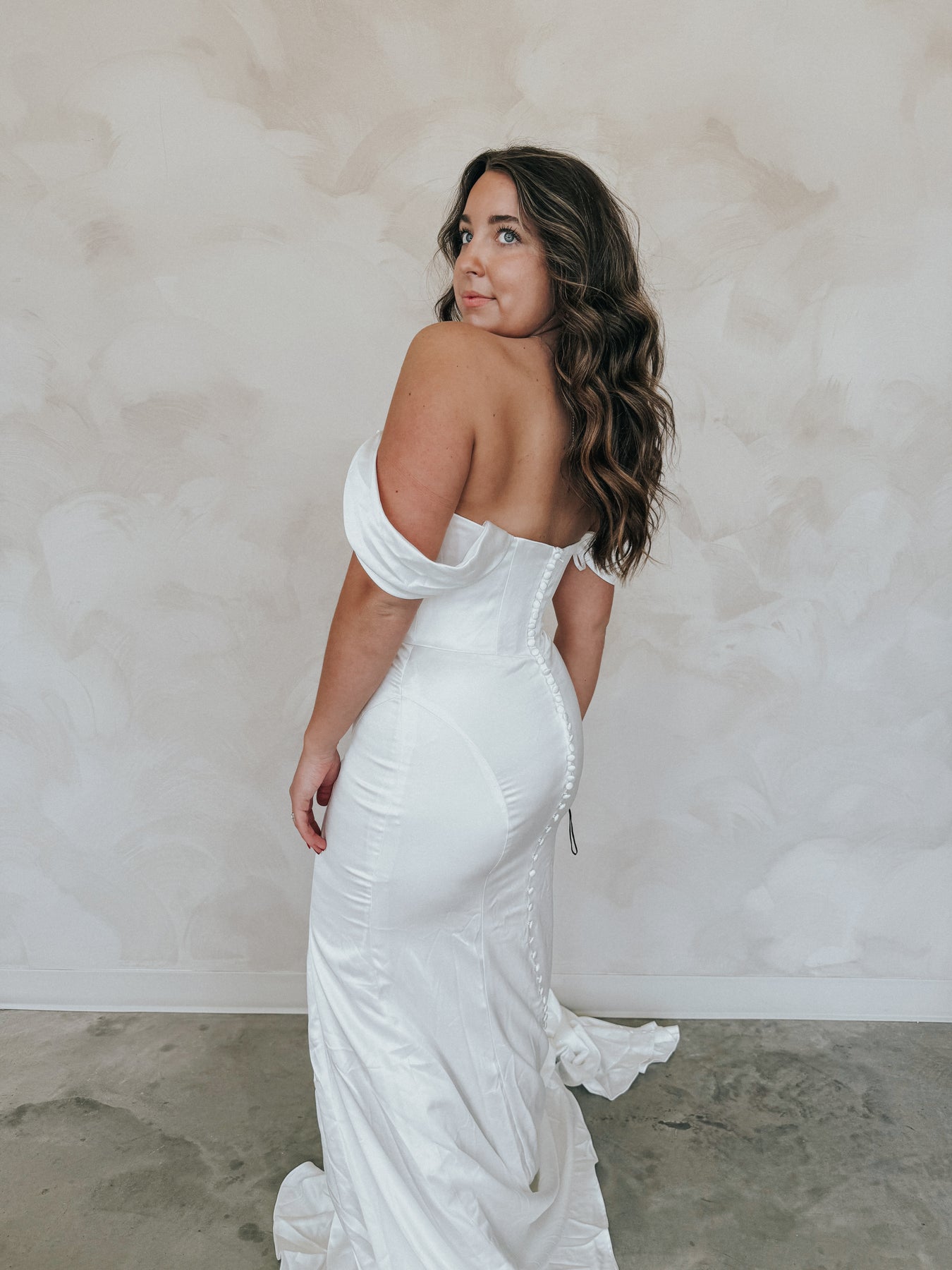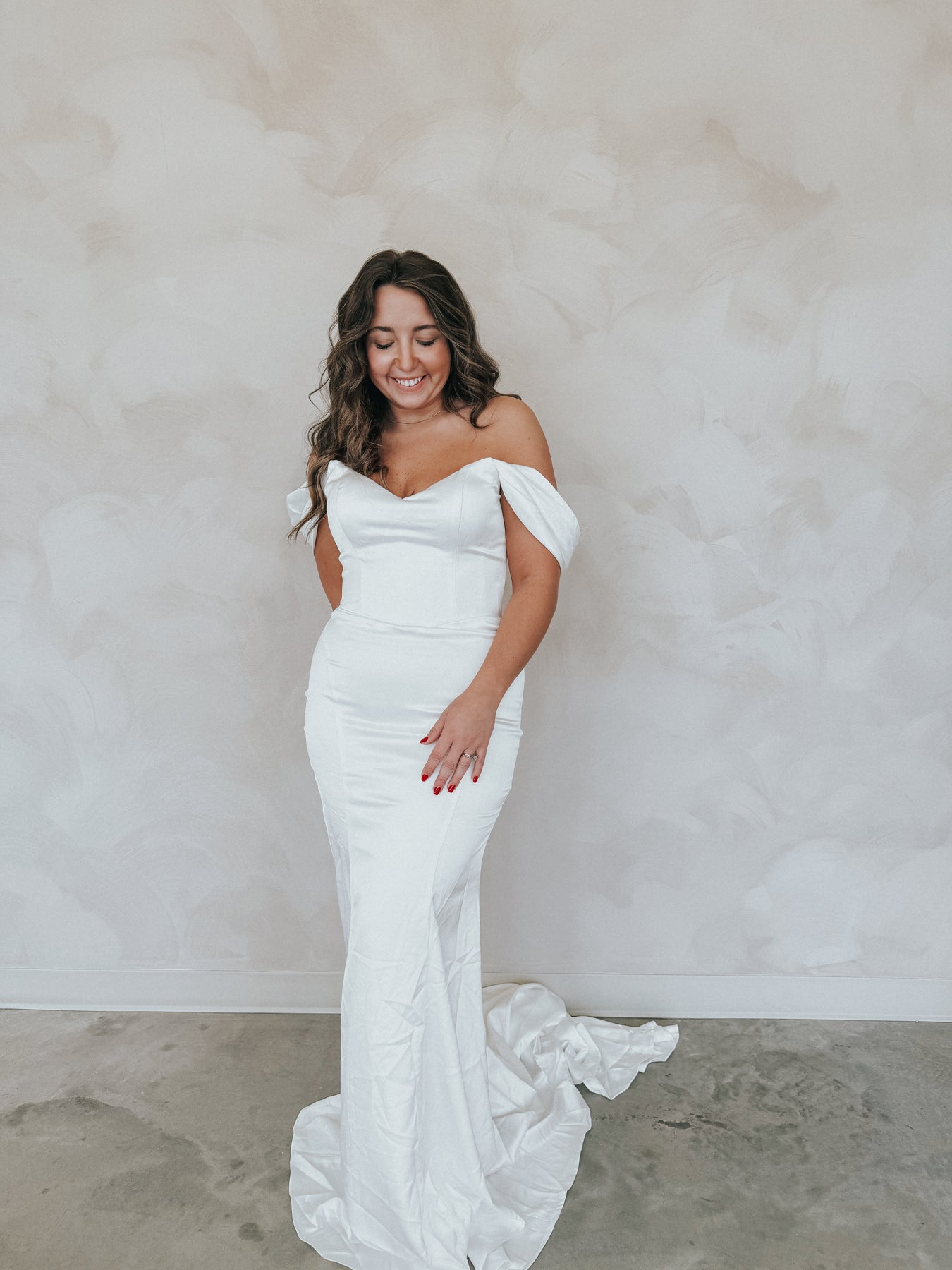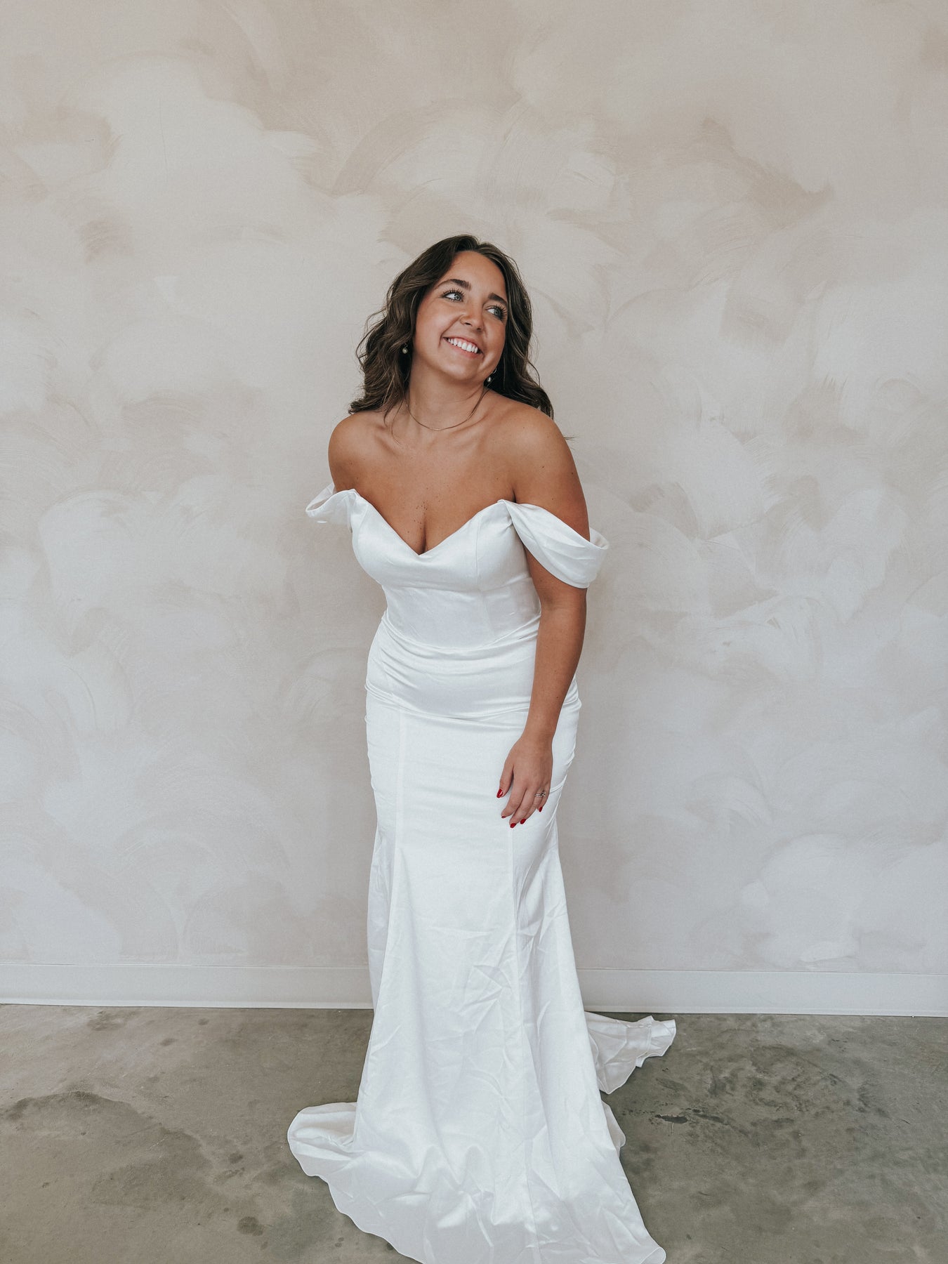 Introducing "Berkley" is a timeless off-the-shoulder silhouette that blends modern elegance with classic romance. Crafted in sleek satin, this gown features a structured bodice that flatters the figure and flows into a gently flared skirt with a sweeping chapel-length train. The soft, draped sleeves add an effortless, romantic charm, while the back is finished with a trail of delicate covered buttons for a refined, feminine touch. This design is perfect for the bride who wants to make a statement with grace and sophistication. For a more understated look, the BERKELY is also available in crepe, offering a softer texture with a beautiful matte finish.